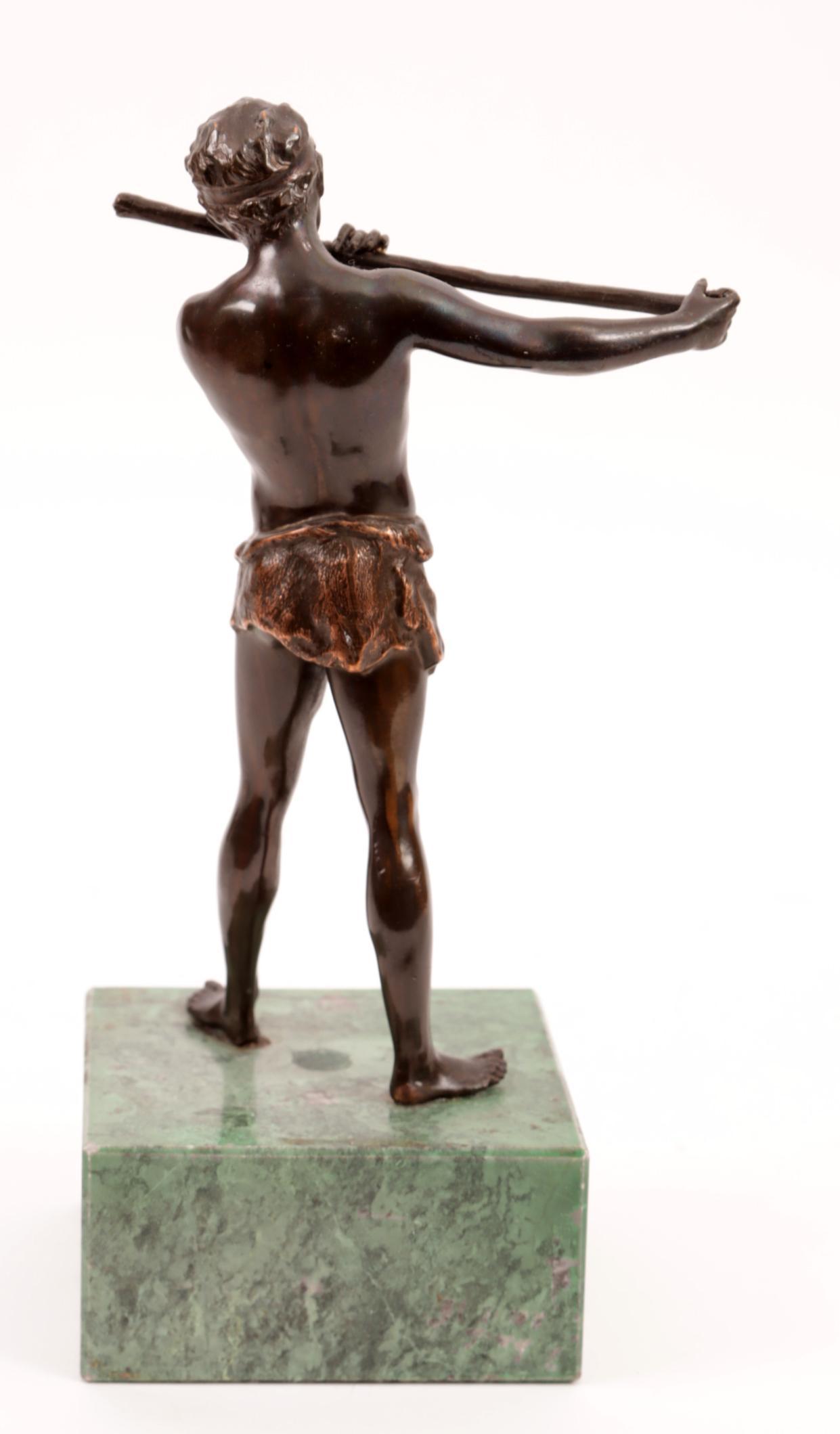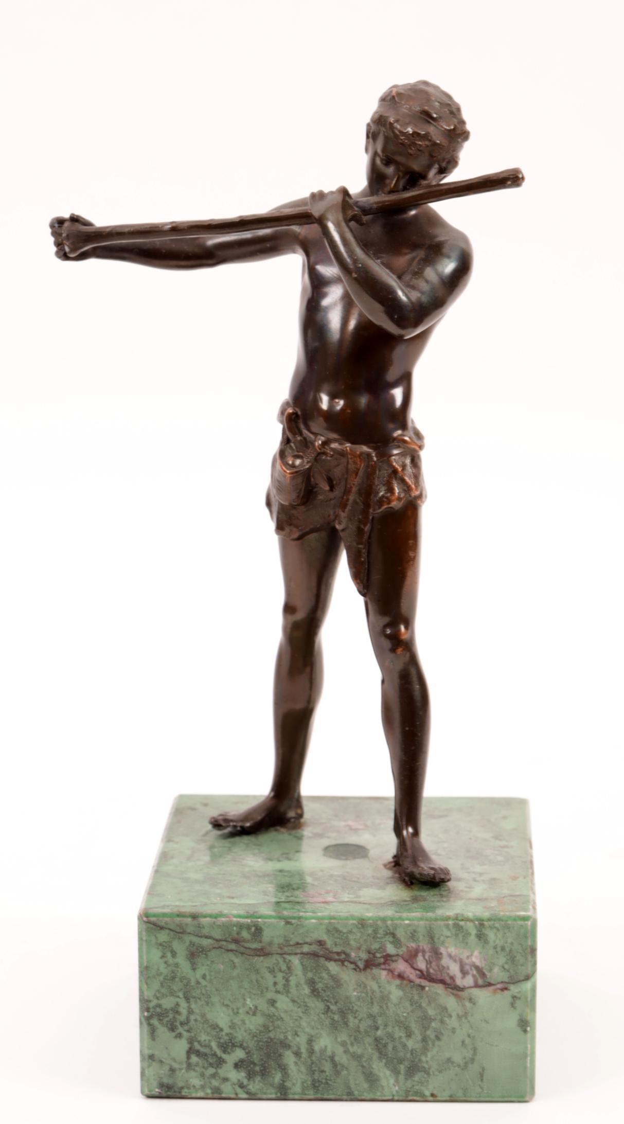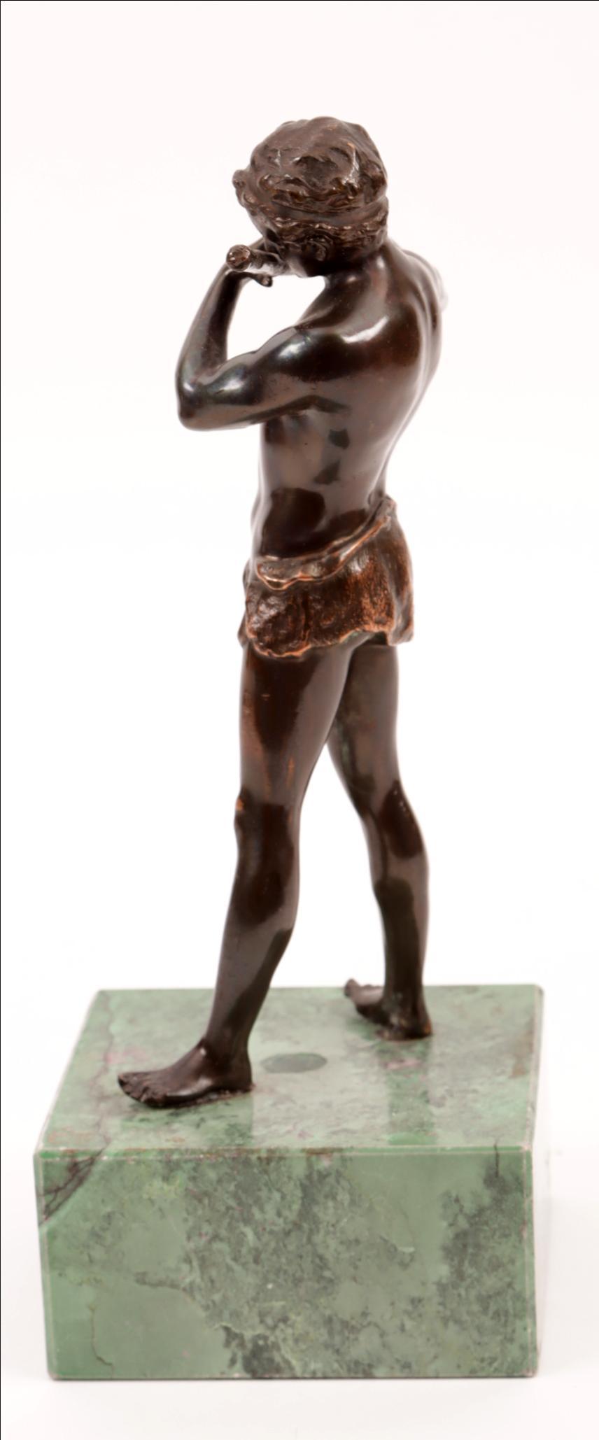 Bronskleurig beeld van een fluitspelende man op groen marmeren voetstuk, h.25 cm.