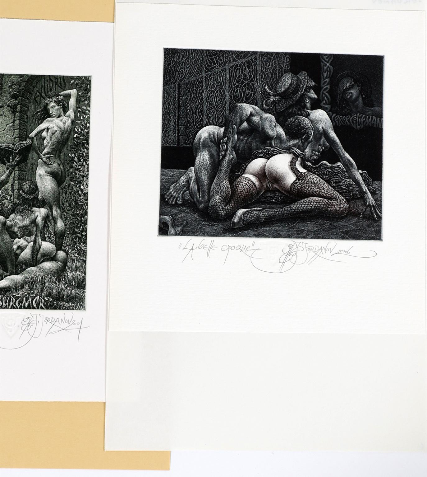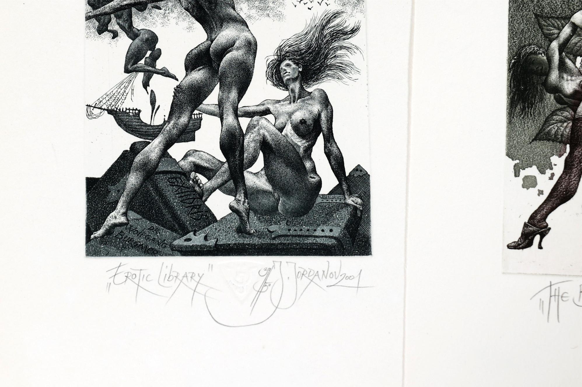 Jordanov, J., 6 exlibris, C3C5, thema: naakt / erotiek. Alle gesigneerd, opgeplakt / gewest. Voor Burgmer, Rosen, Golifman, Viaene, Van den Briele