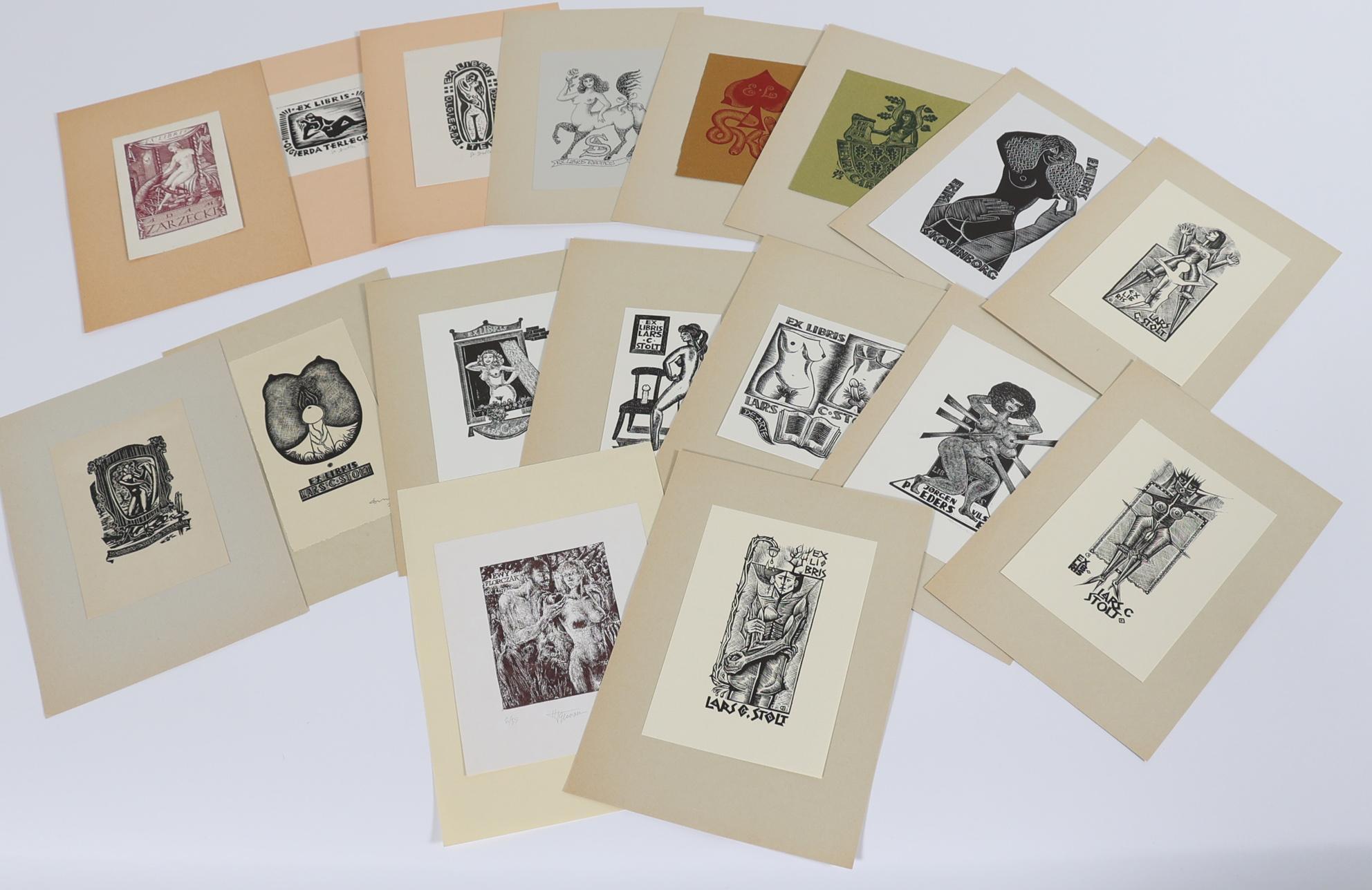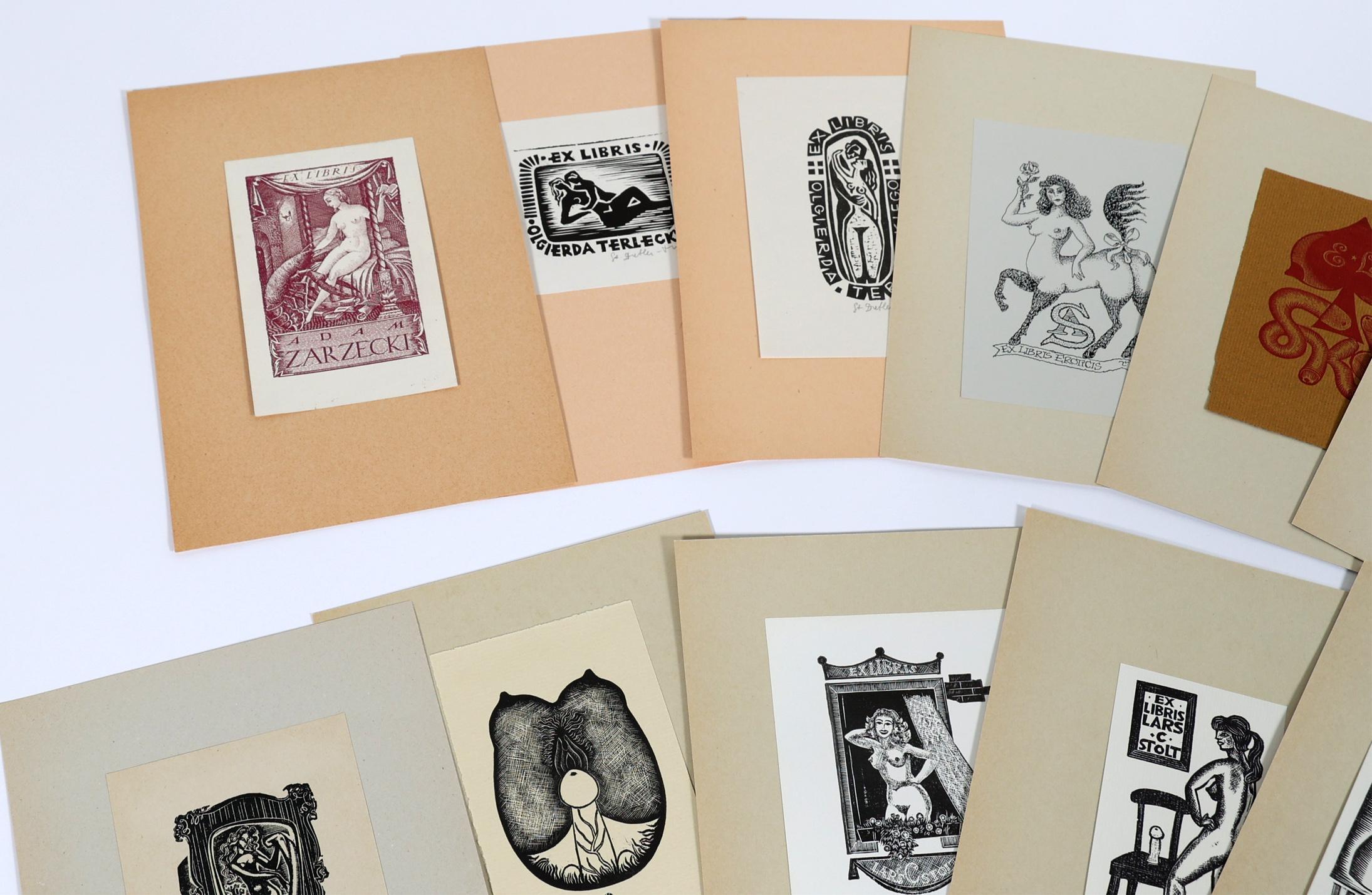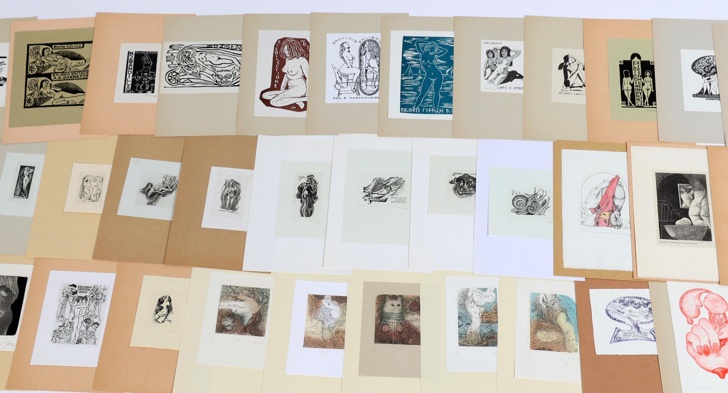 collectie Poolse exlibris, thema: naakt / erotiek. 20 x Diepdruk (25 x gesigneerd), rest hoogdruk (24 x gesigneerd). Opgeplakt. Kunstenaars o.a. Balon, Bortowski, Jakubowski, Janeczek, Agopsowicz, Barylski, Dolatowski, Glowacka, Cieslak.
