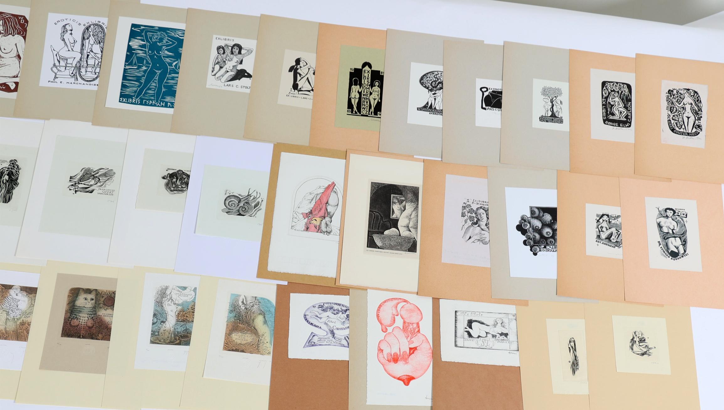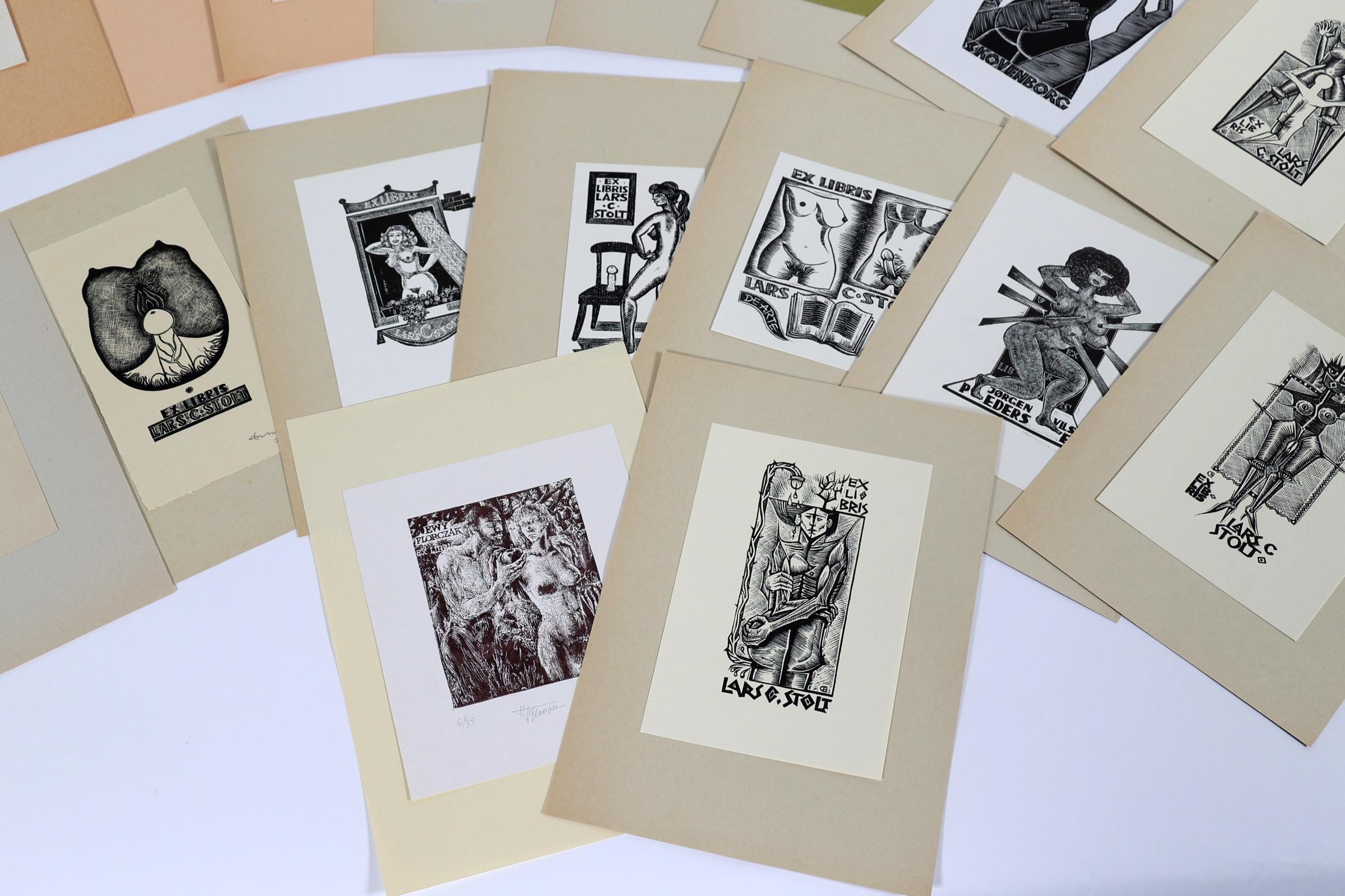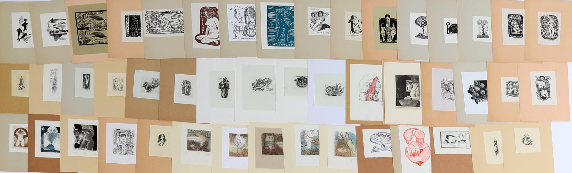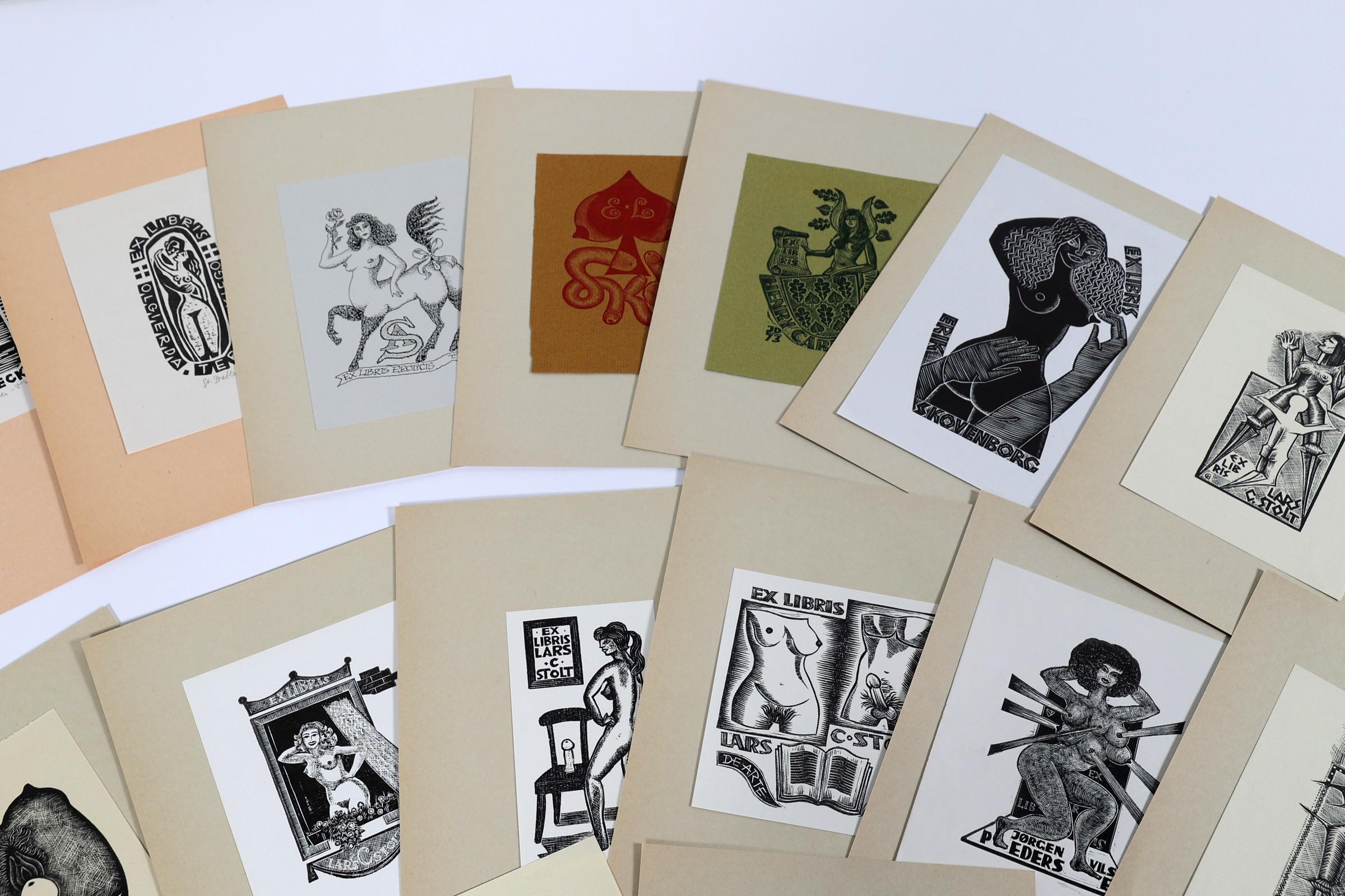 collectie Poolse exlibris, thema: naakt / erotiek. 20 x Diepdruk (25 x gesigneerd), rest hoogdruk (24 x gesigneerd). Opgeplakt. Kunstenaars o.a. Balon, Bortowski, Jakubowski, Janeczek, Agopsowicz, Barylski, Dolatowski, Glowacka, Cieslak.