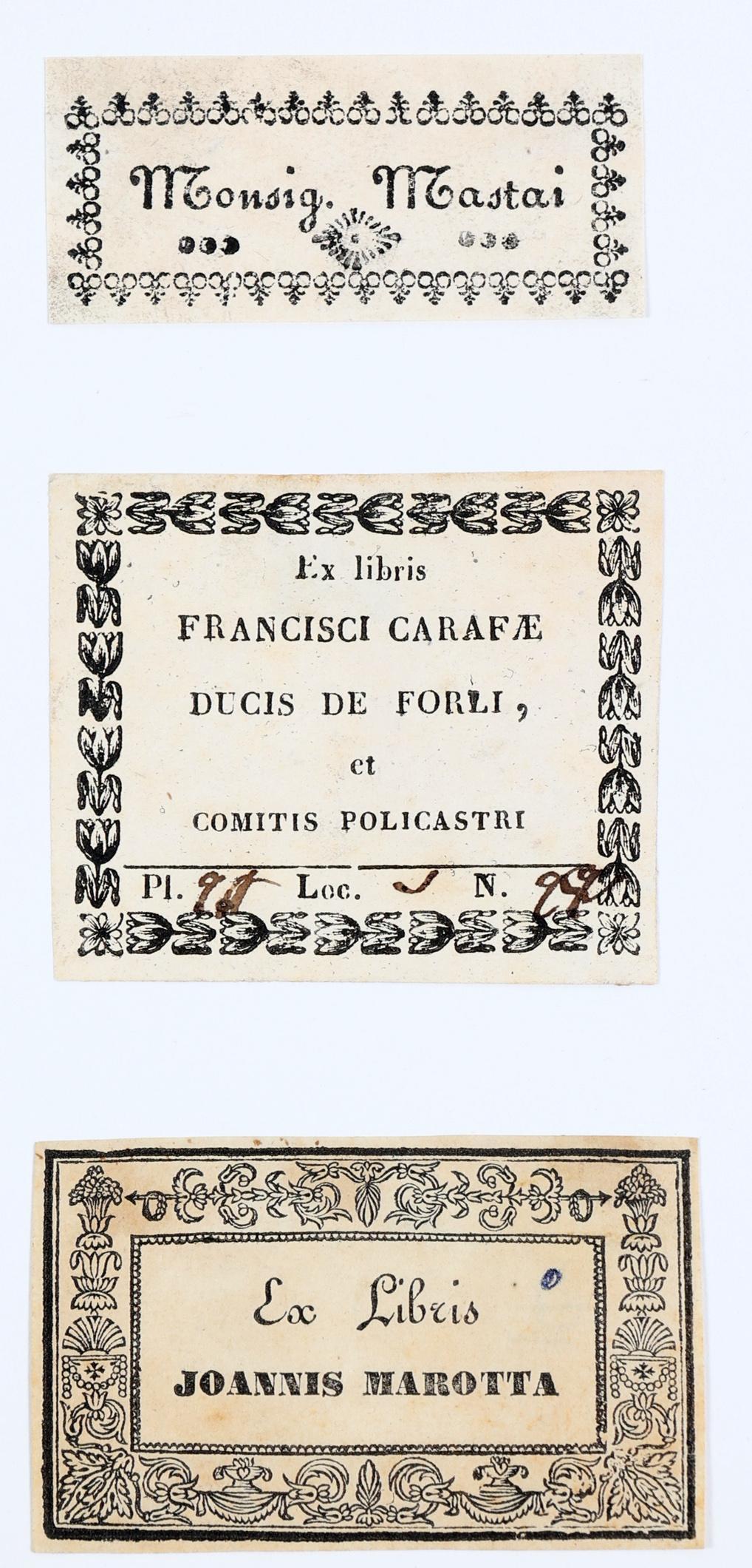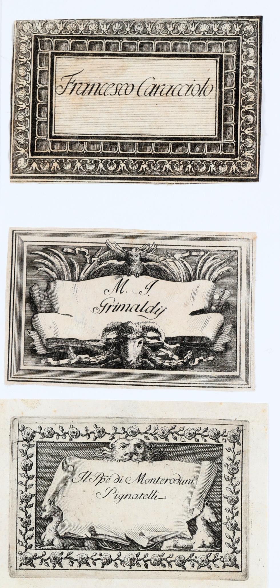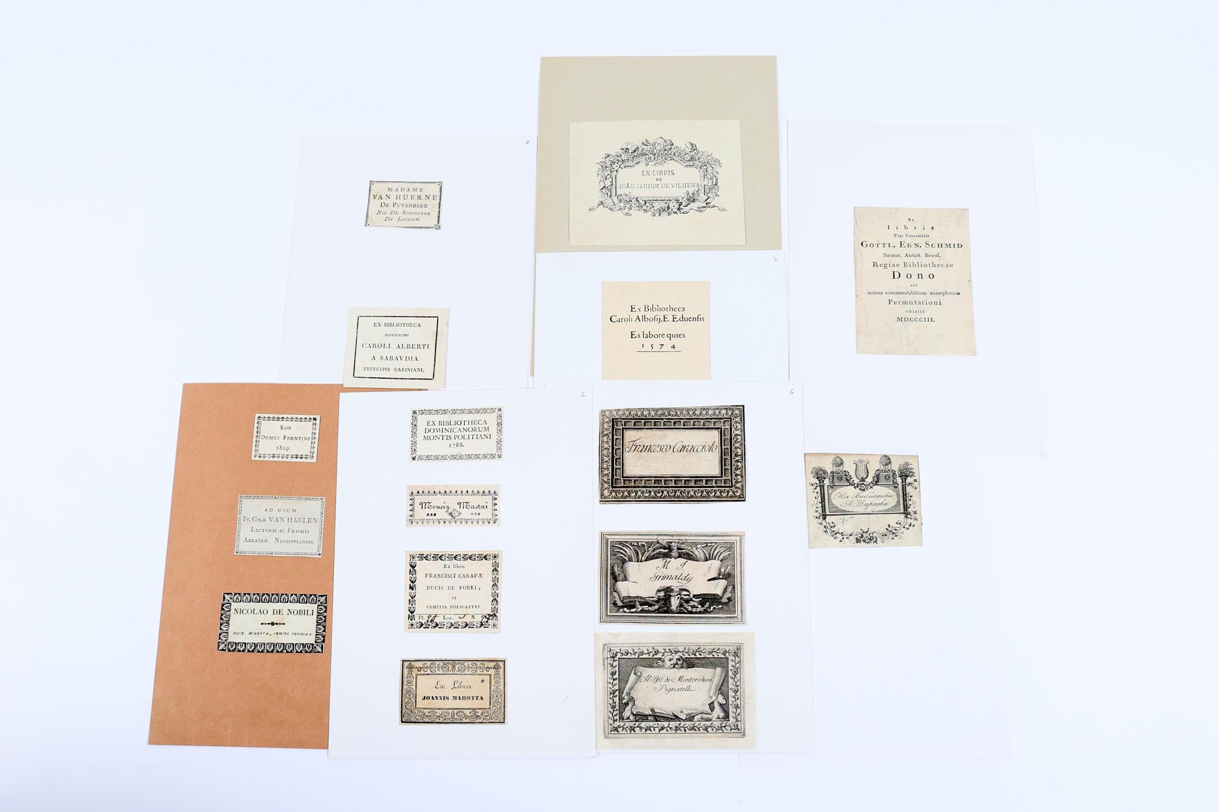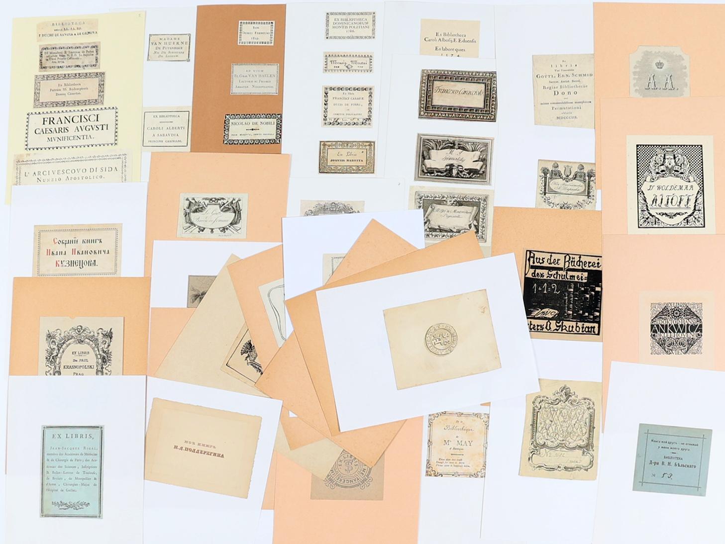 collectie van plm. 45 oude exlibris, vooral 18e en 19e eeuw. Diverse technieken, opgeplakt, niet gesigneerd.