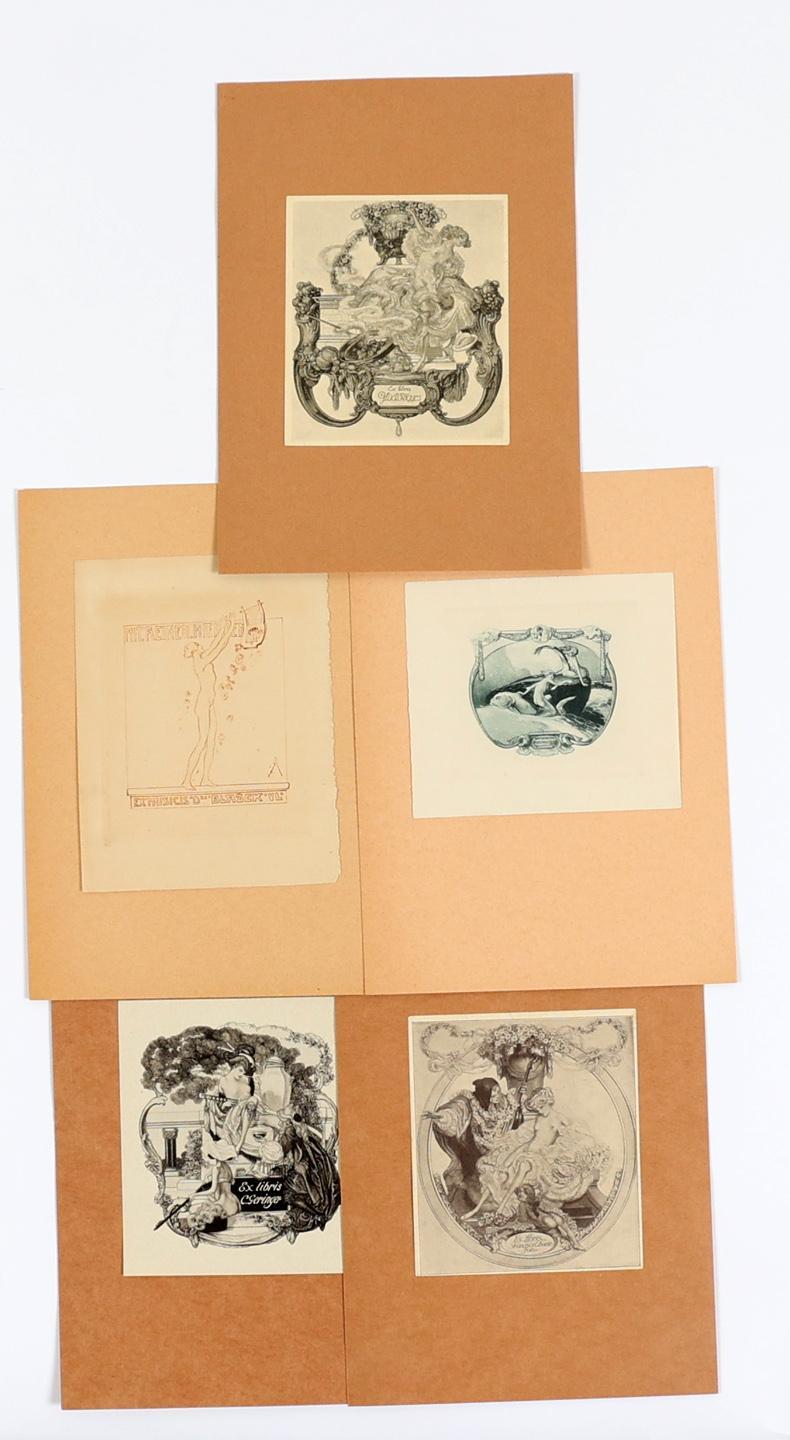 Bayros, Fr. von, 10 exlibris, opgeplakt. O.a. voor Geringer - heliogravure, op. 72, Buser - heliogravure, op 36, Blazek, diepdruk, op. 28, Chorin - cliche, op. 41, Frigues, heliogravure, op. 76, Rosen, diepdruk, op. 209.