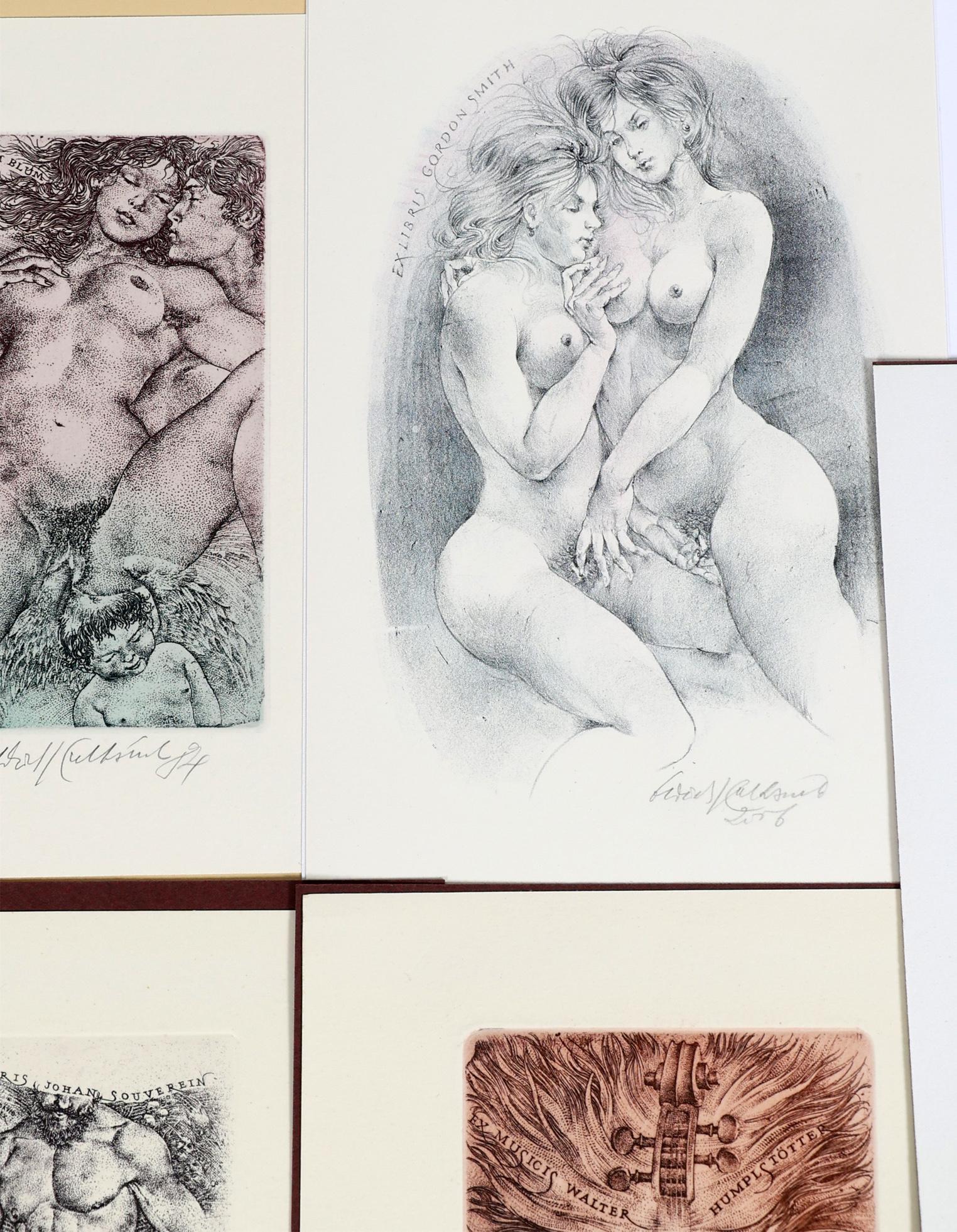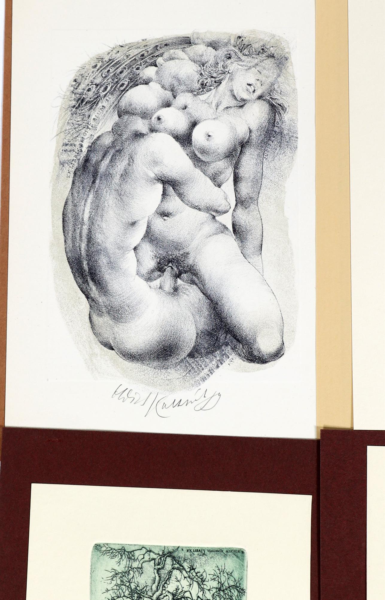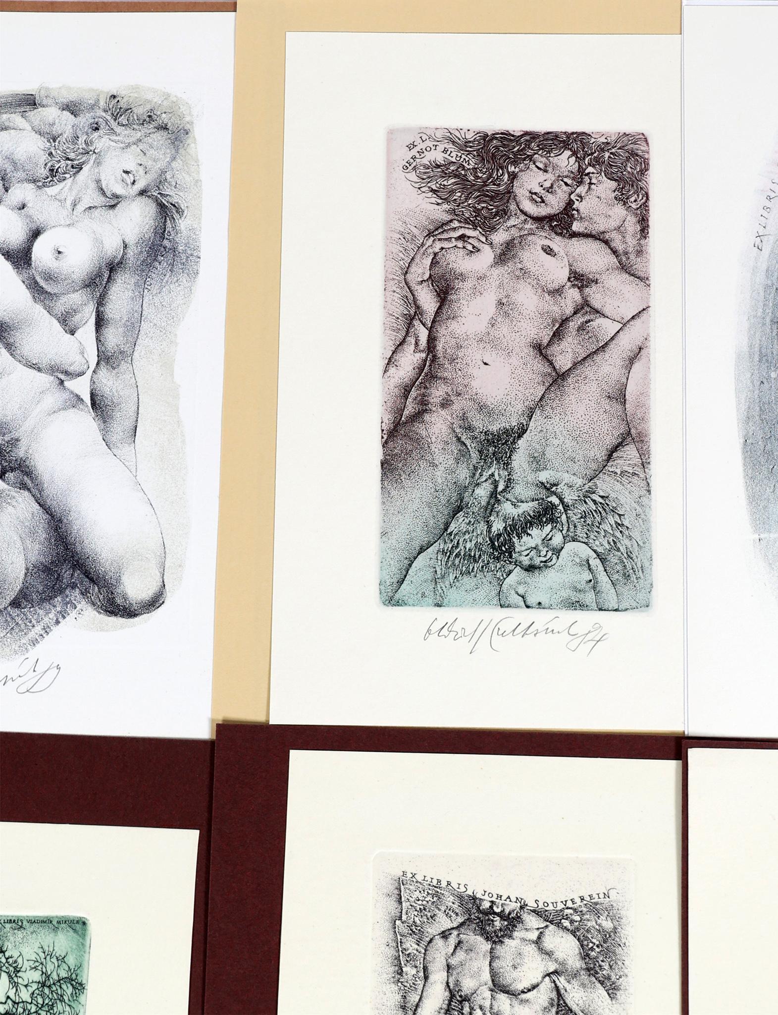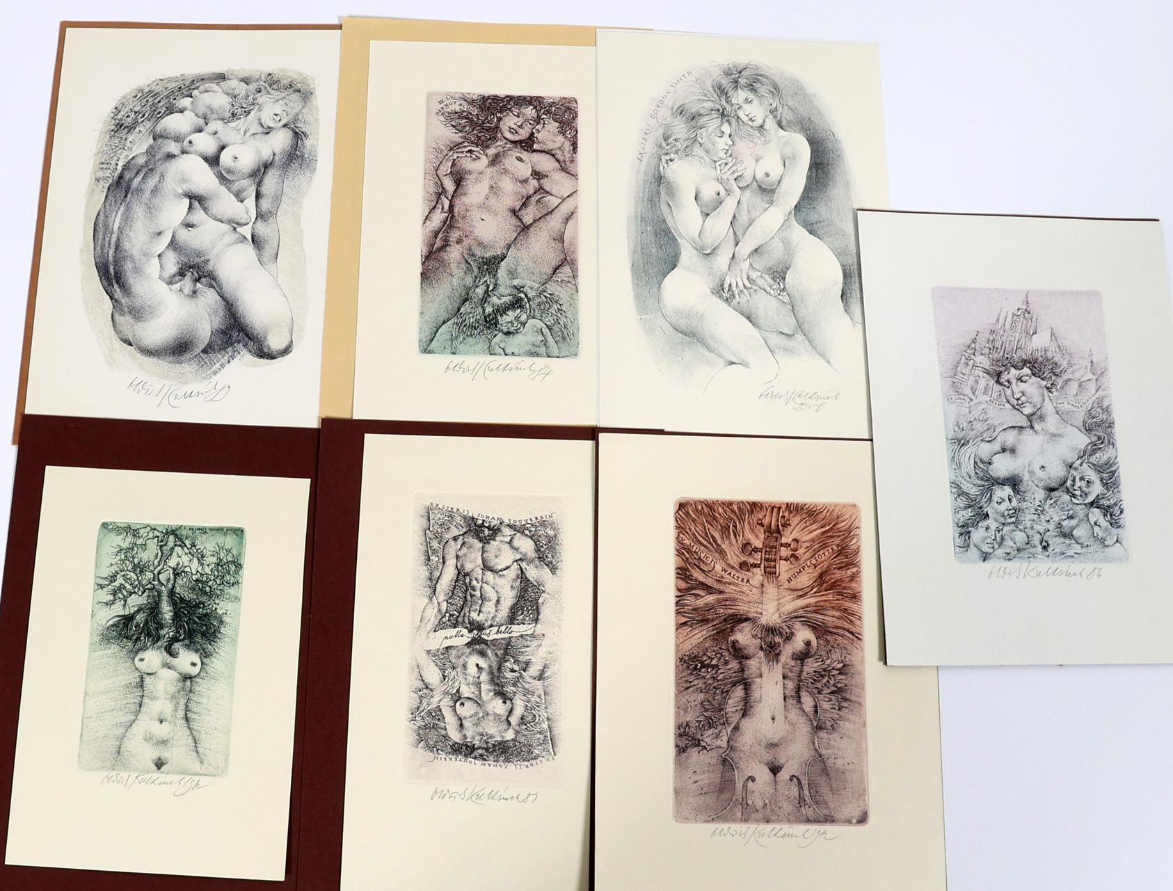 Kulhanek, O., 7 exlibris, 5 x diepdruk, 2 x litho. Thema: naakt / erotiek. Voor: Blum, Smith, Mikule, Souverein, Humplstotter, Van Waterschoot. Alle gesigneerd.