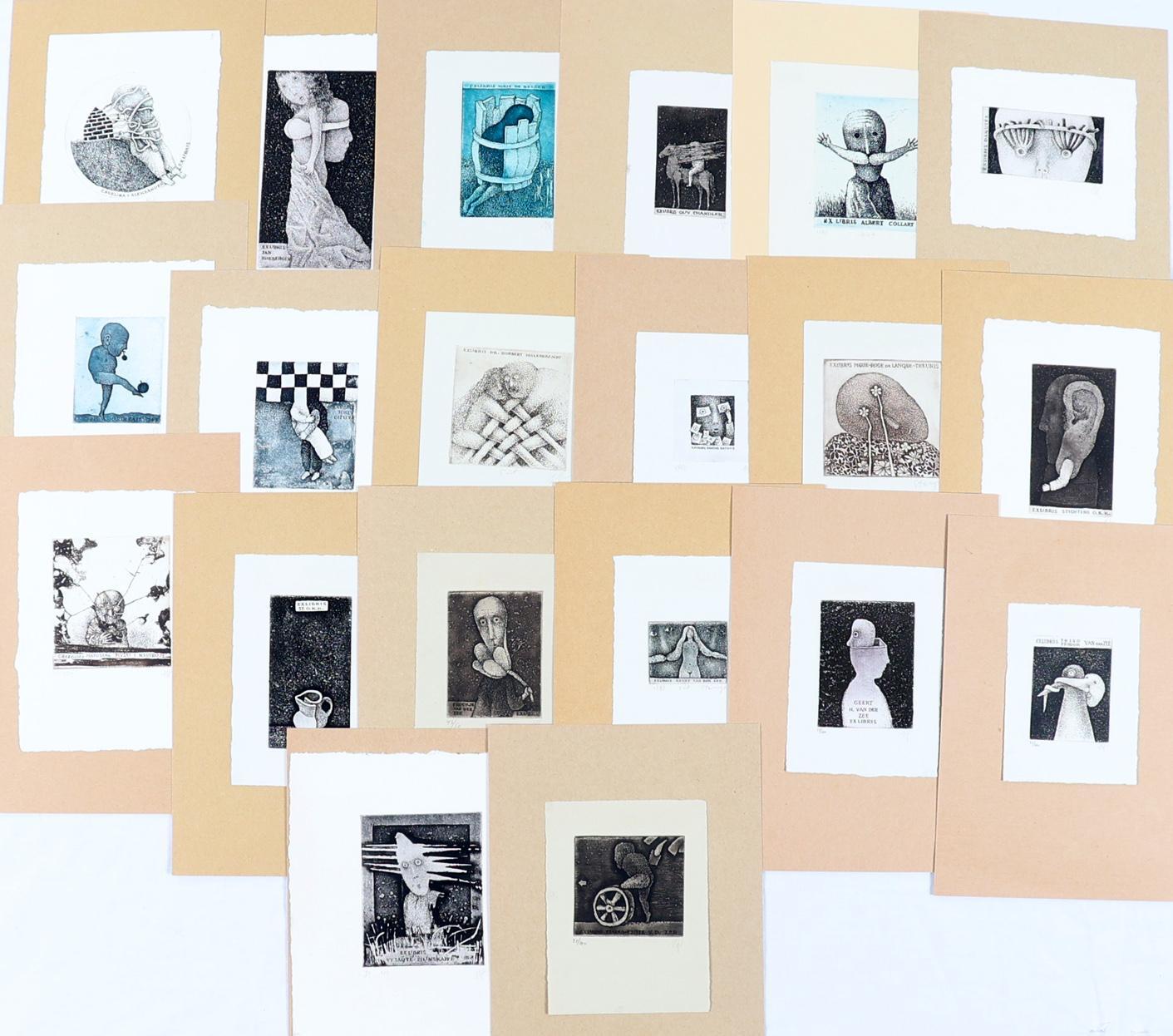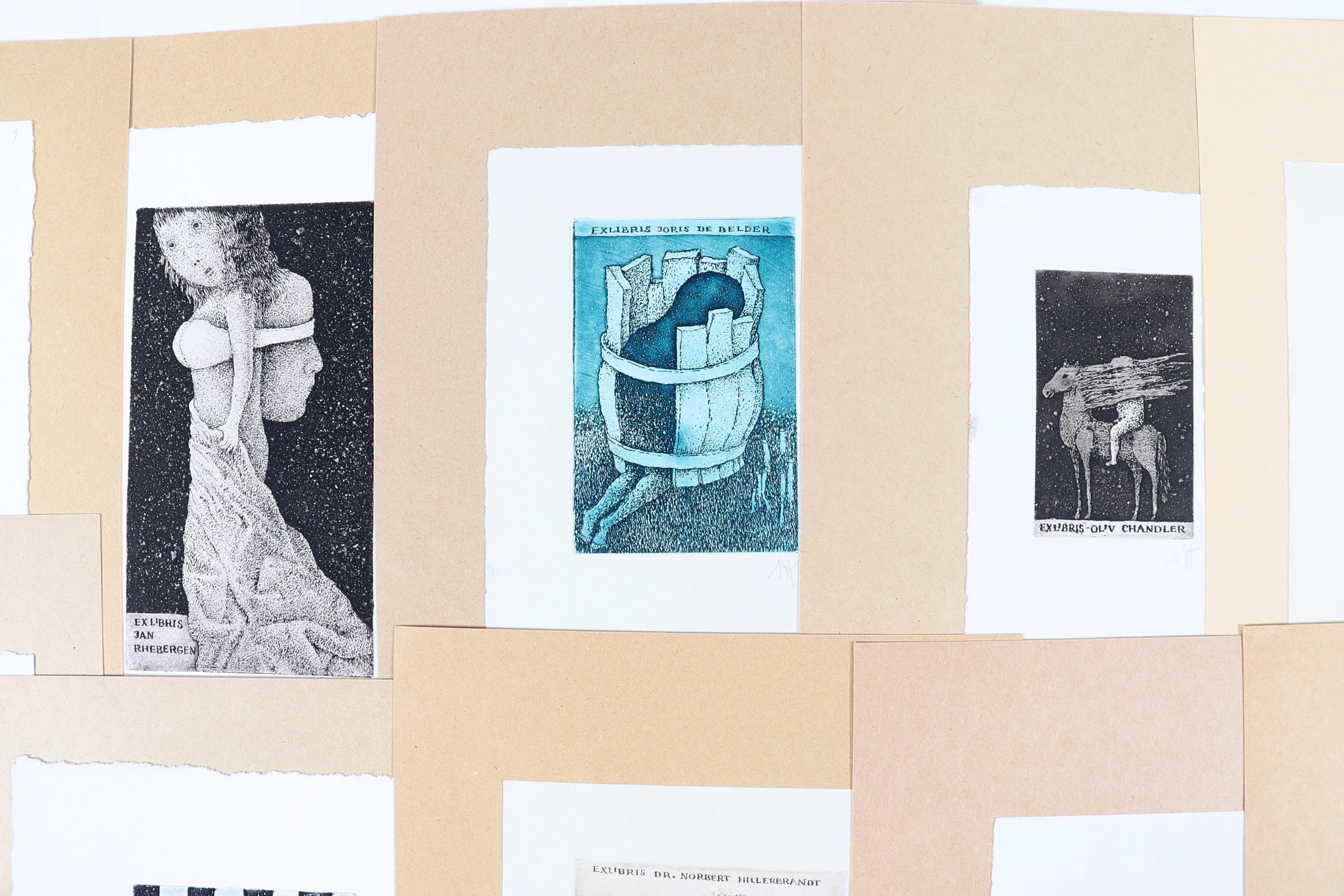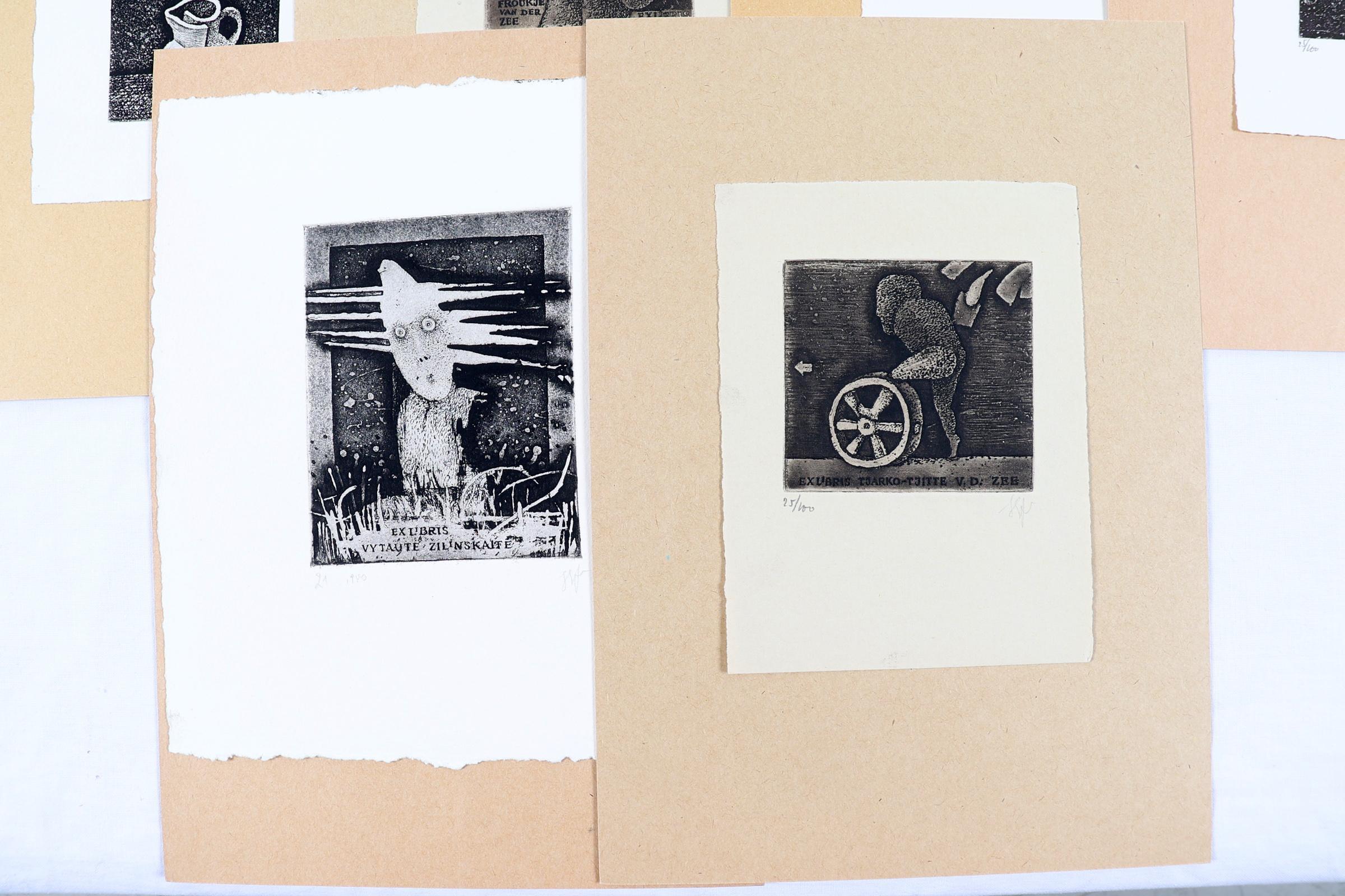EidrigeviciusSt., 20 exlibris, diepdrukken, alle gesigneerd. Opgeplakt. Voor o.a. Rhebergen, De Belder, Chandler, Collart, Danutes, Gajewski, Gizyck, Katkus, Theunis, Van der Xee.