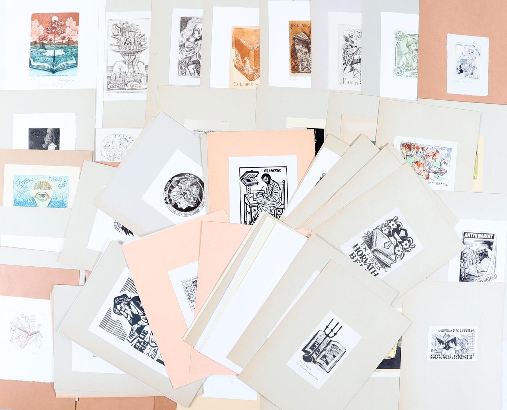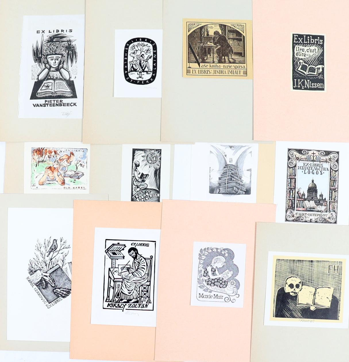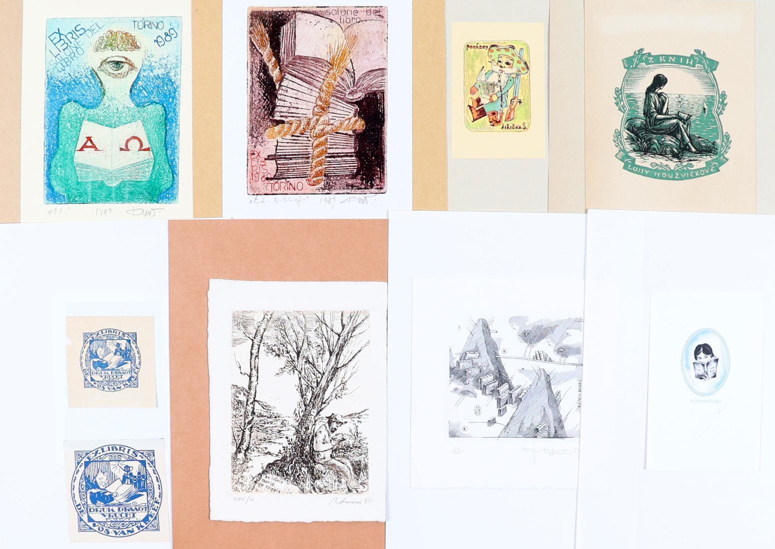 collectie van plm. 110 exlibris, thema: boeken. 30 x Diepdruk, rest hoogdruk / vlakdruk. Deels gesigneerd, opgeplakt. Kunstenaars o.a. Jakstas, Lukzak, De Koster, Lazarov, Kuyper, Kisza, Jamar, Kazimova, Kislinger, Jupatov.