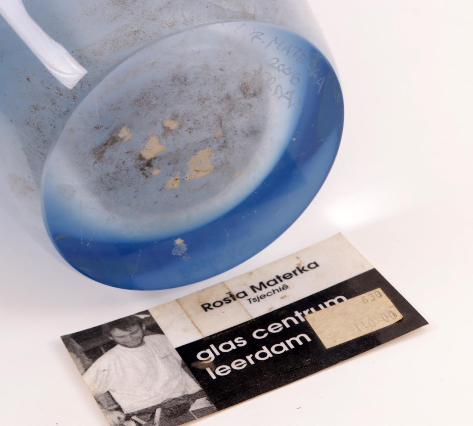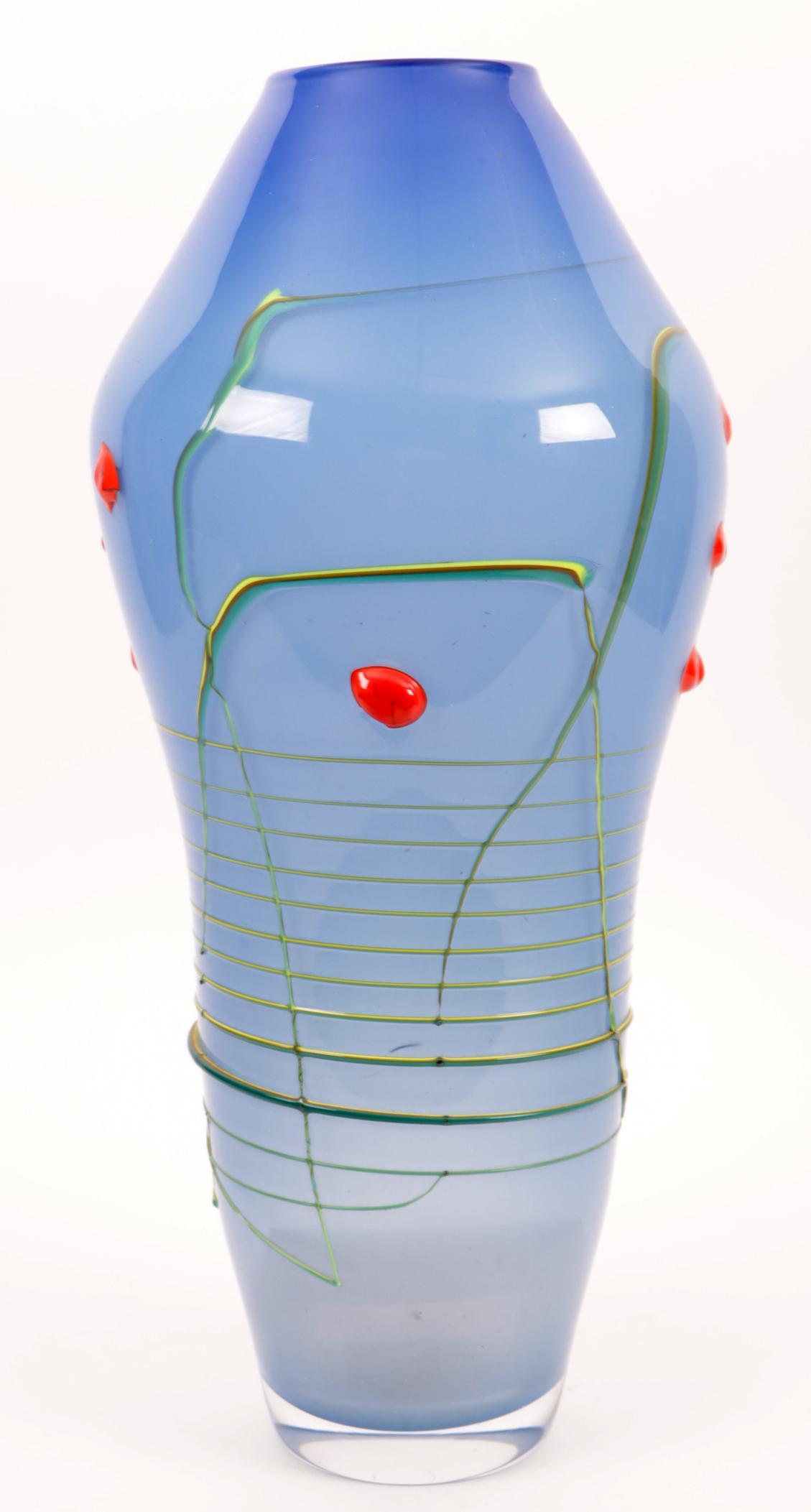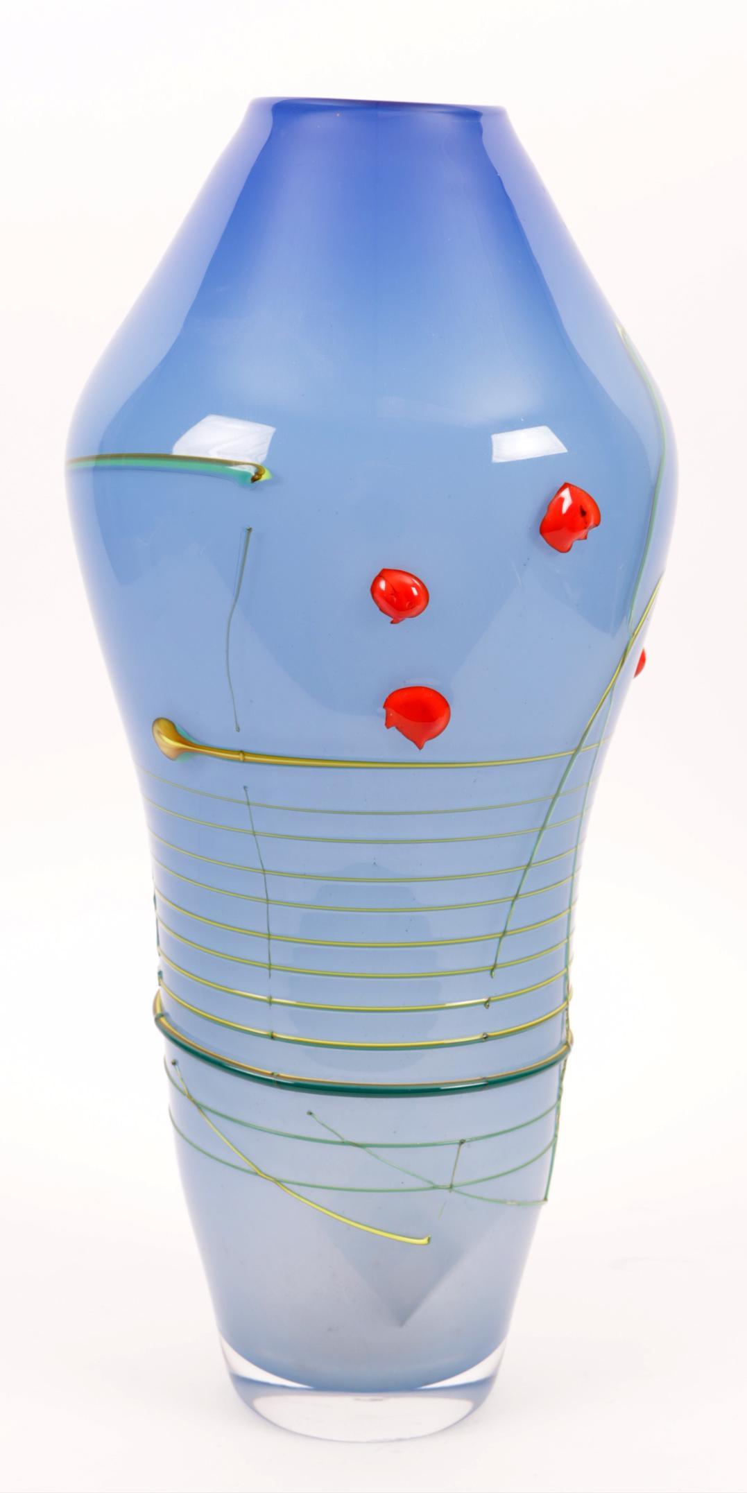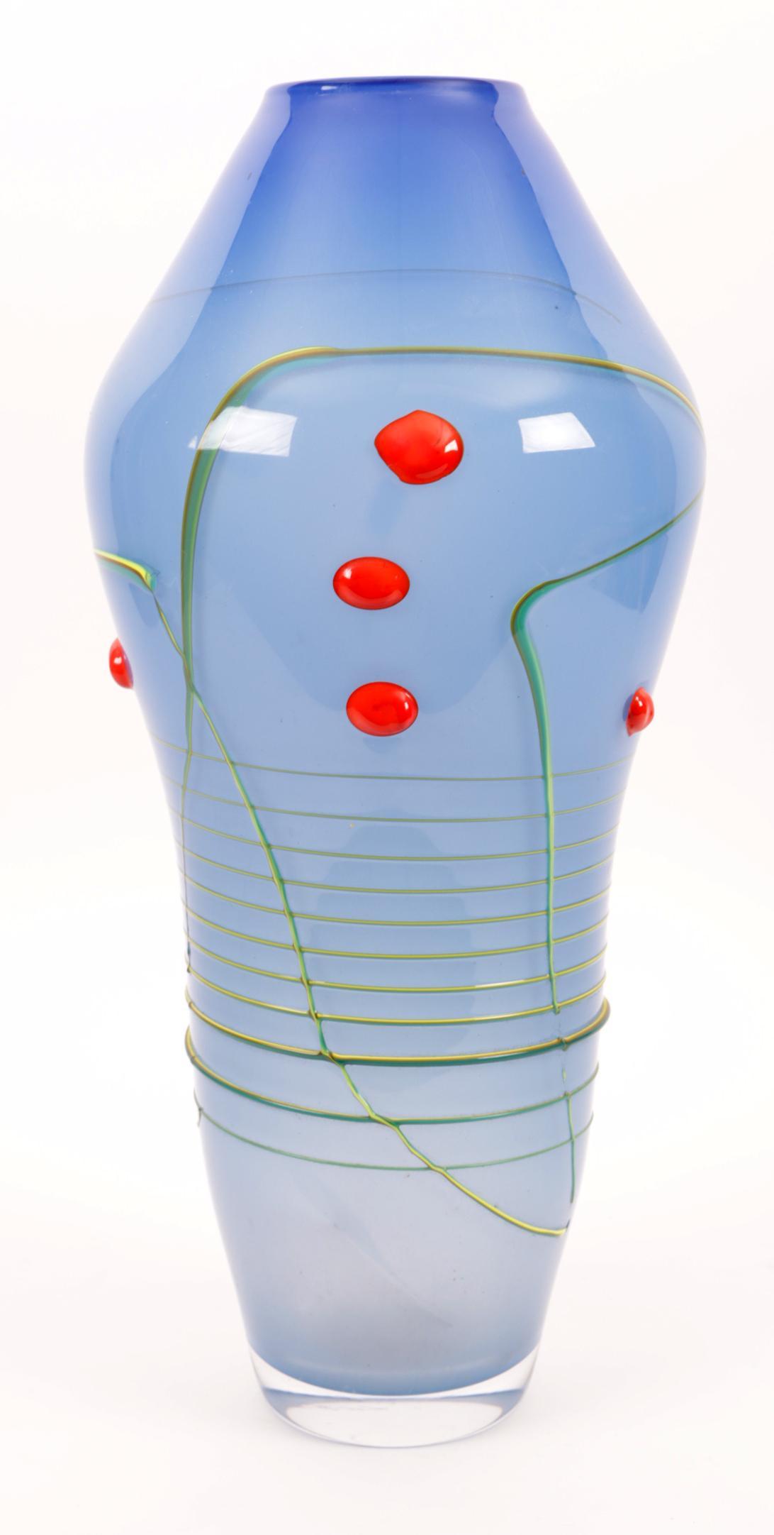 Rosta Materka voor Leerdam, blauw glazen siervaas met rode stippen en geel/groene lijnen, gedateerd 2006, h.44 cm.