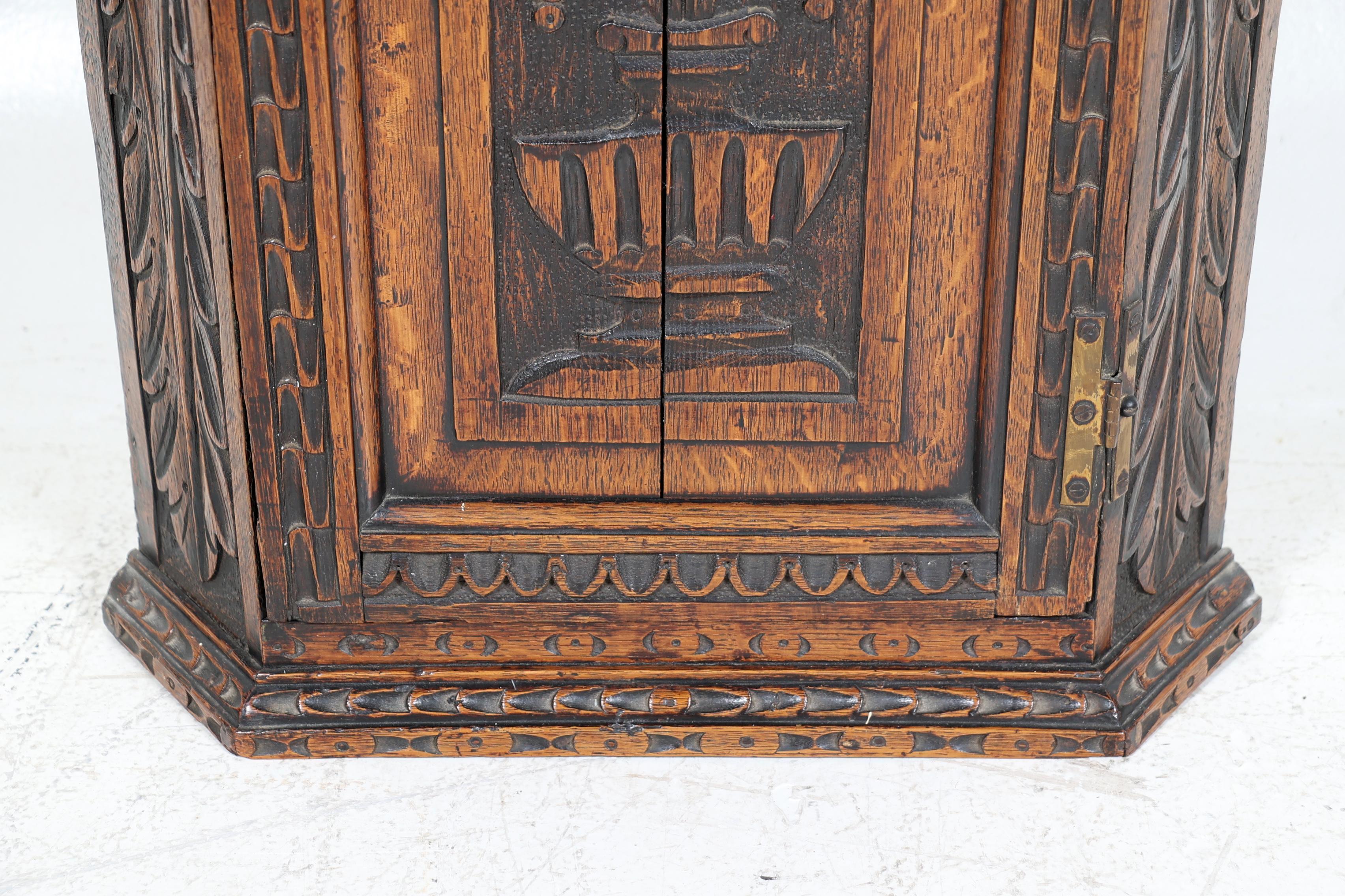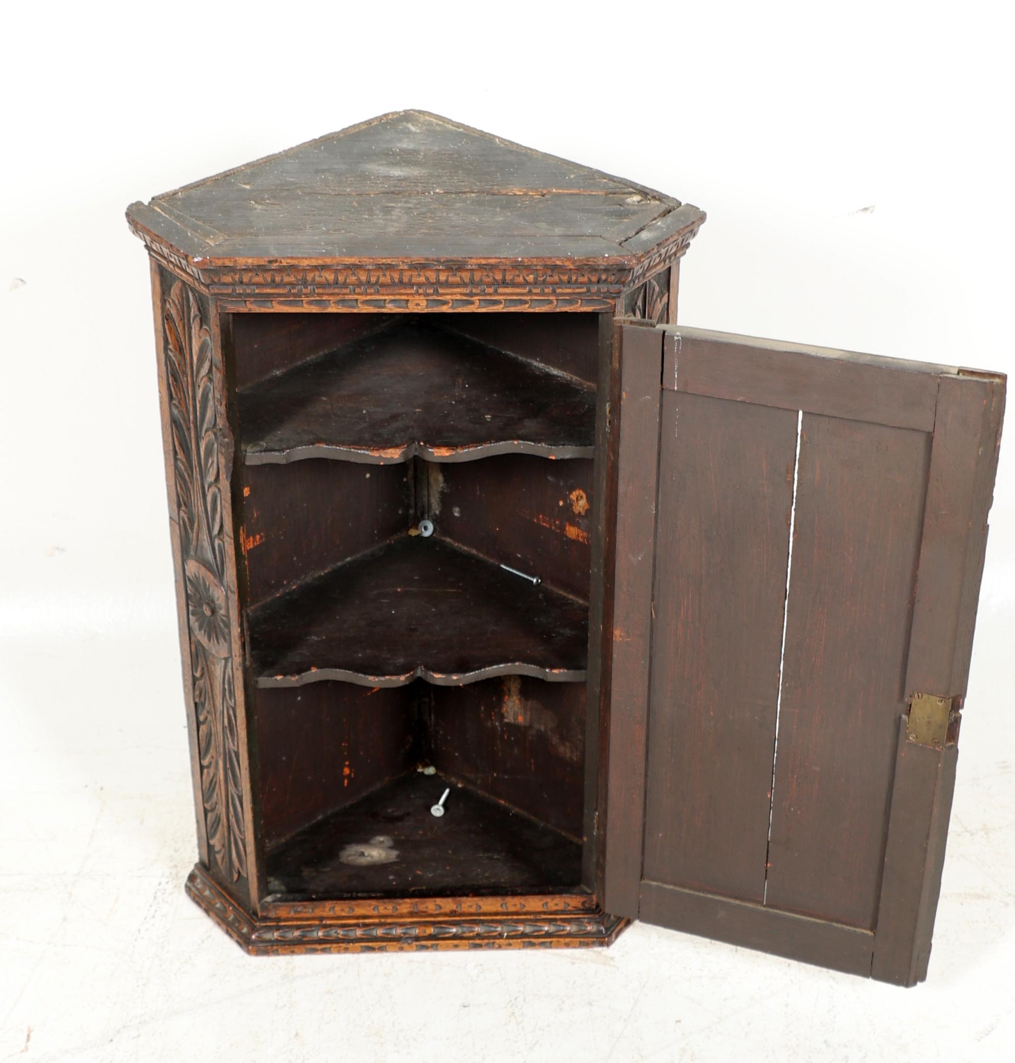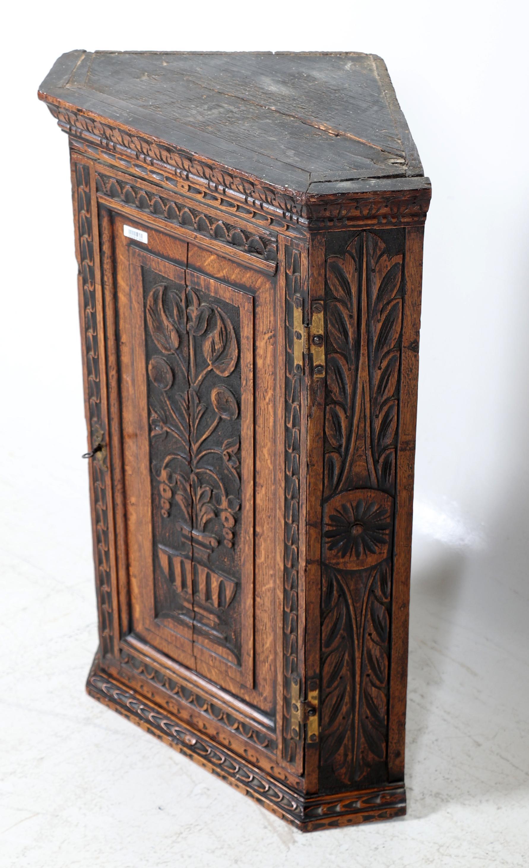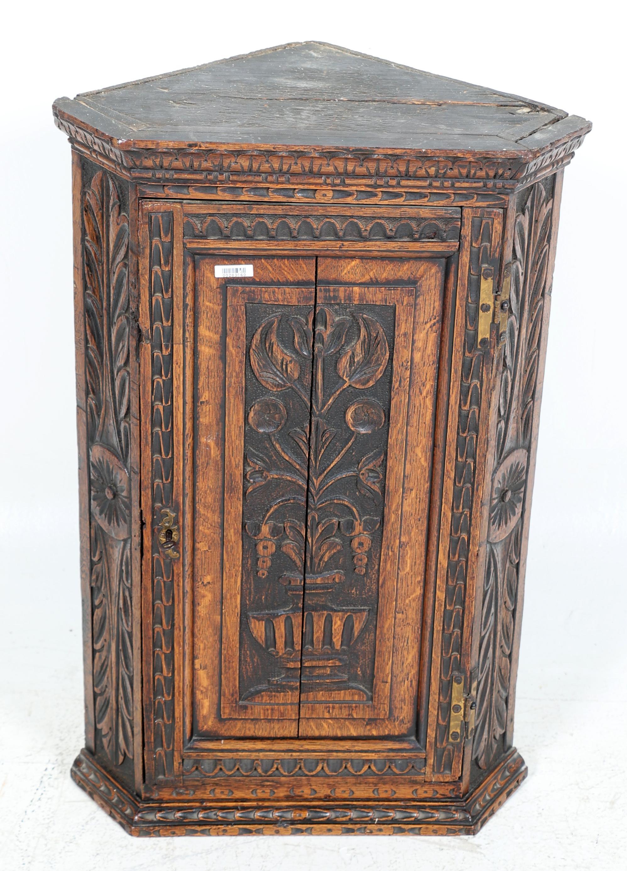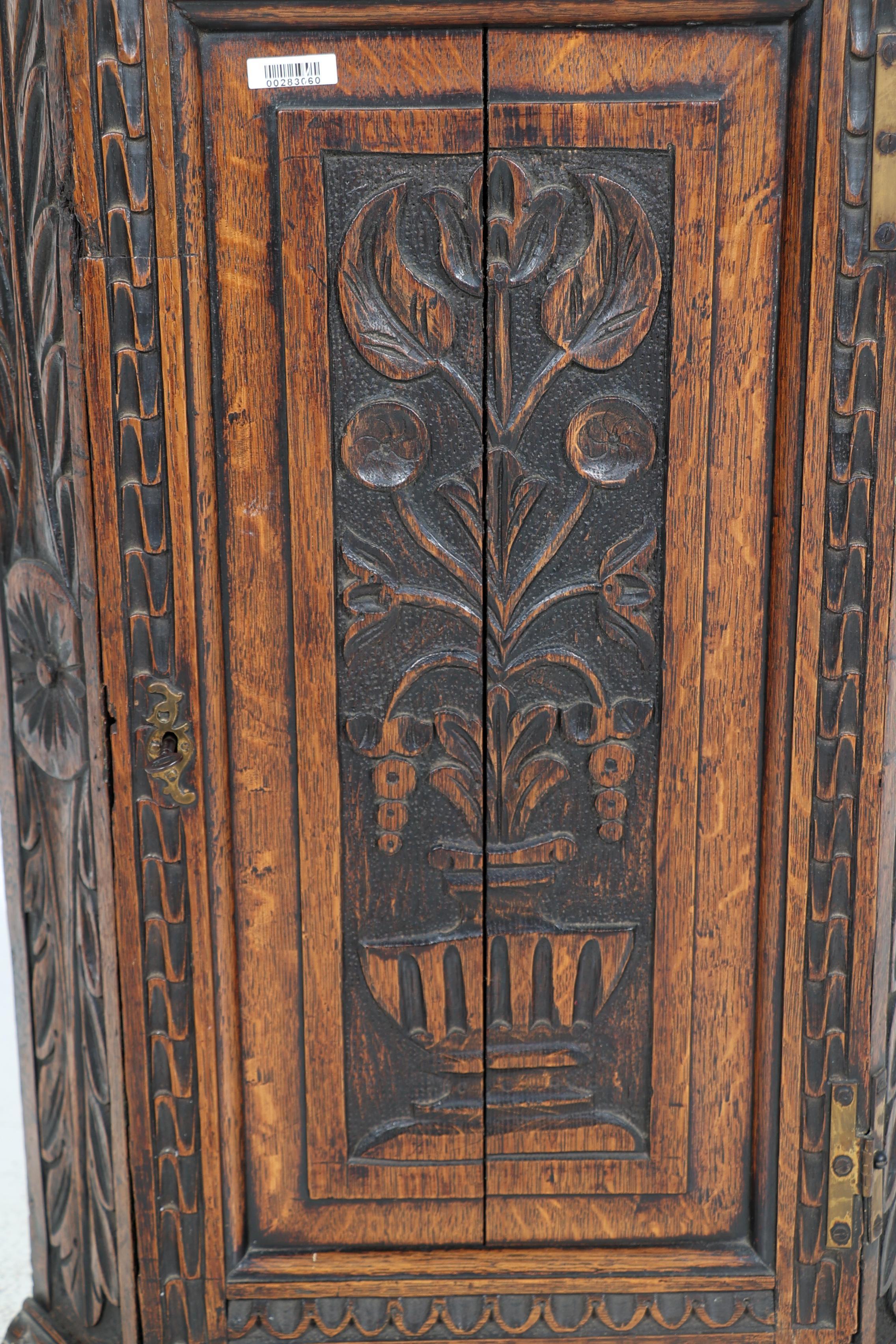Antieke rijkbewerkte eikenhouten hoekkast, h.72 x b.46 x d.30 cm.