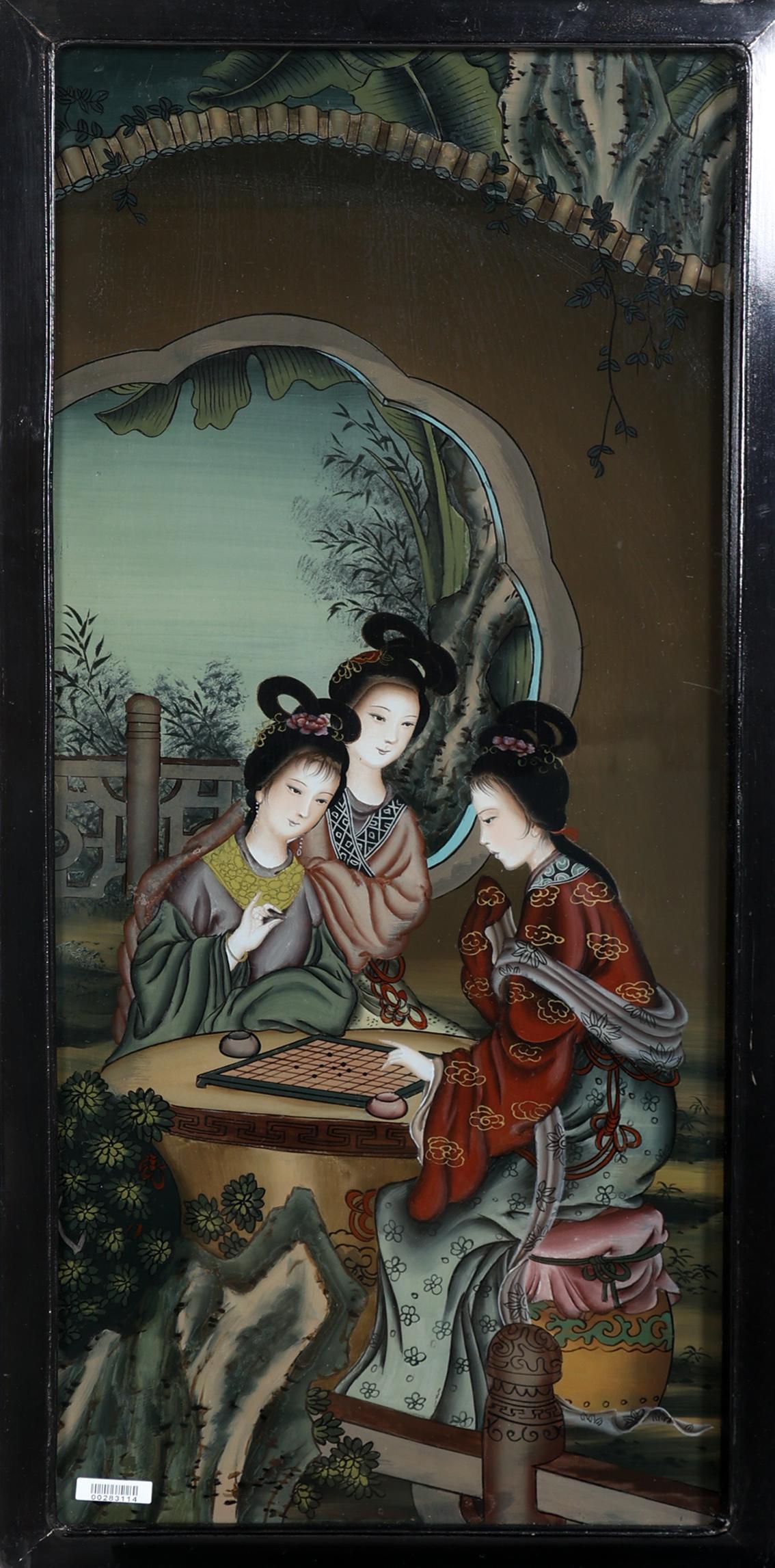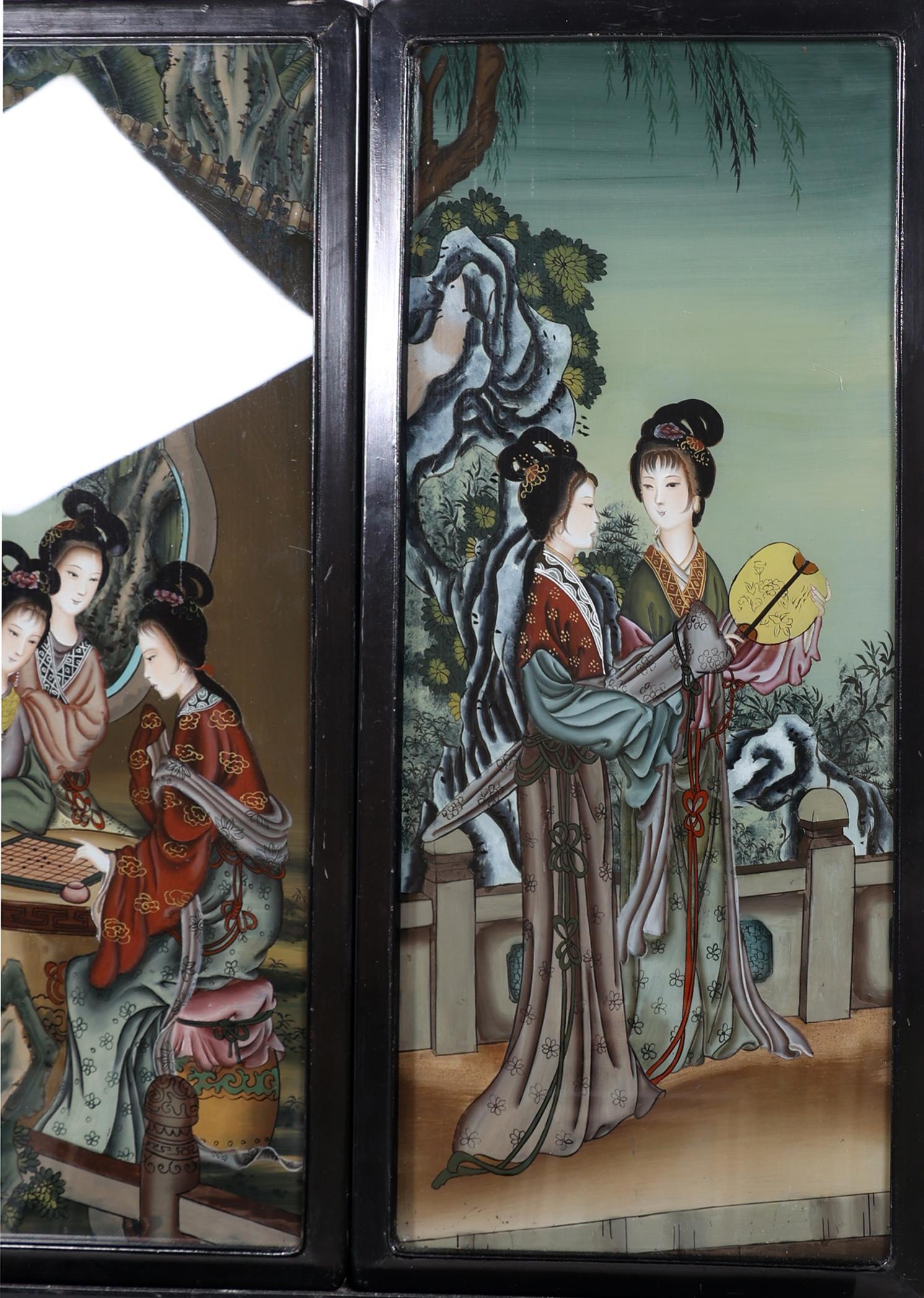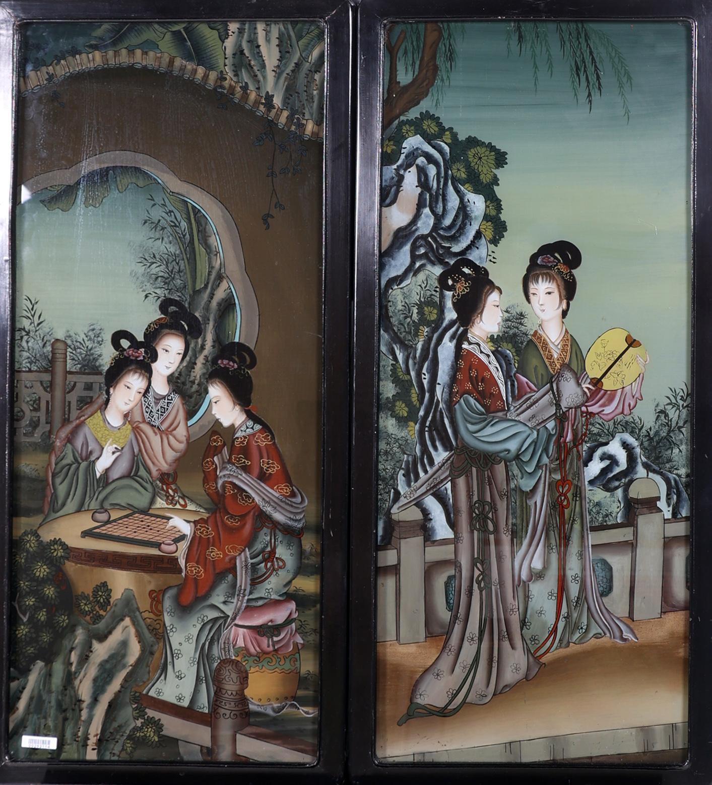 Stel Chinese geschilderde panelen achter glas met voorstelling van personen in interieur en tuin, 74 x 34 cm. per stuk