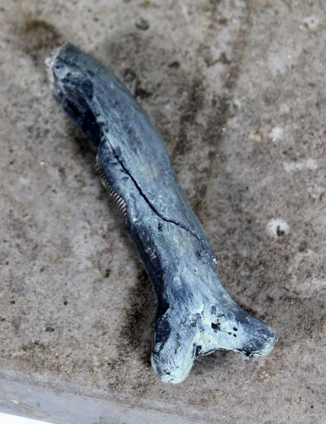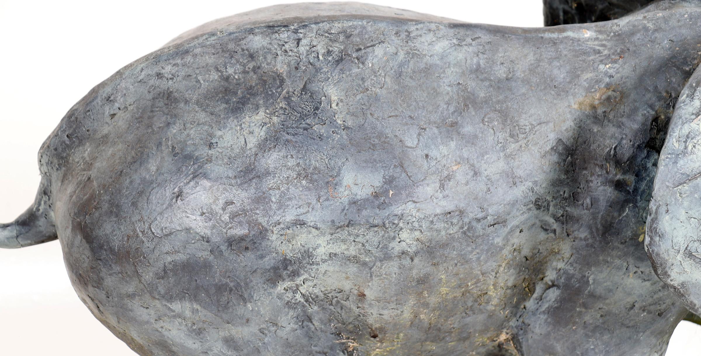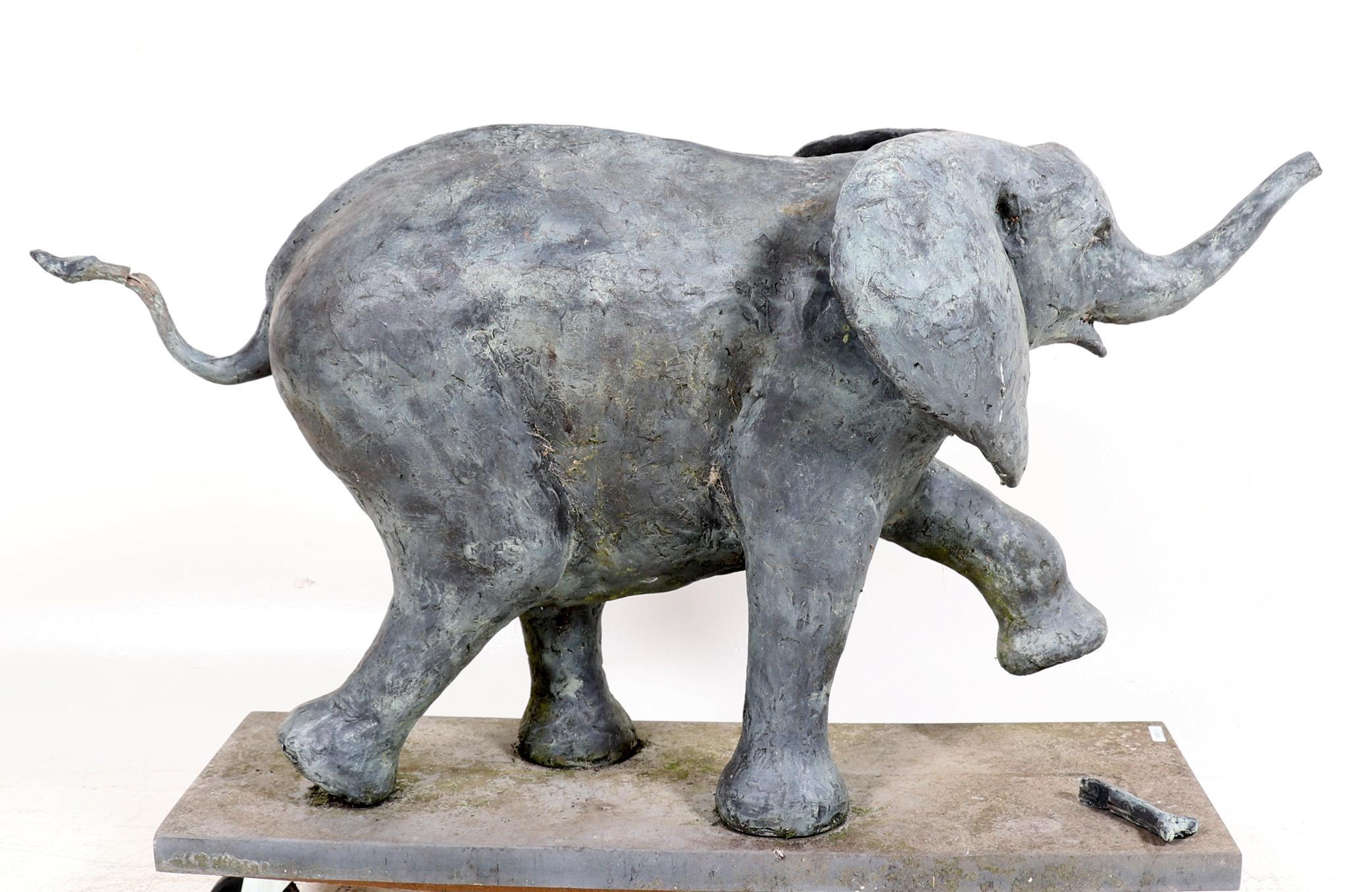 Bronskleurig composiet sculptuur van een olifant rustend op hardstenen voetstuk (slurf en staart defect), h.56 x b.36 x L.100 cm.