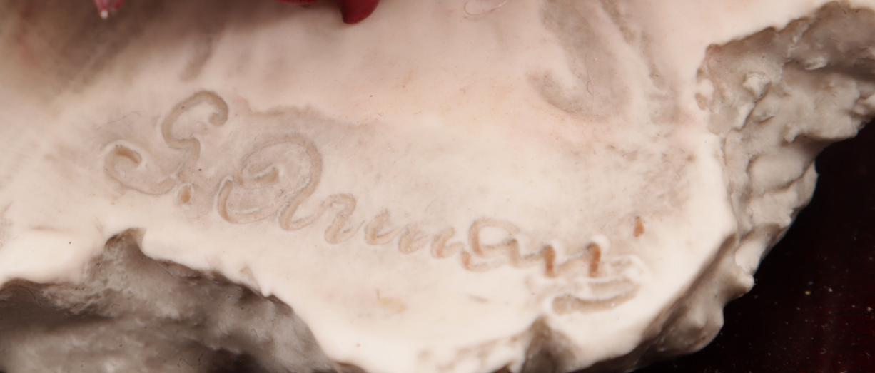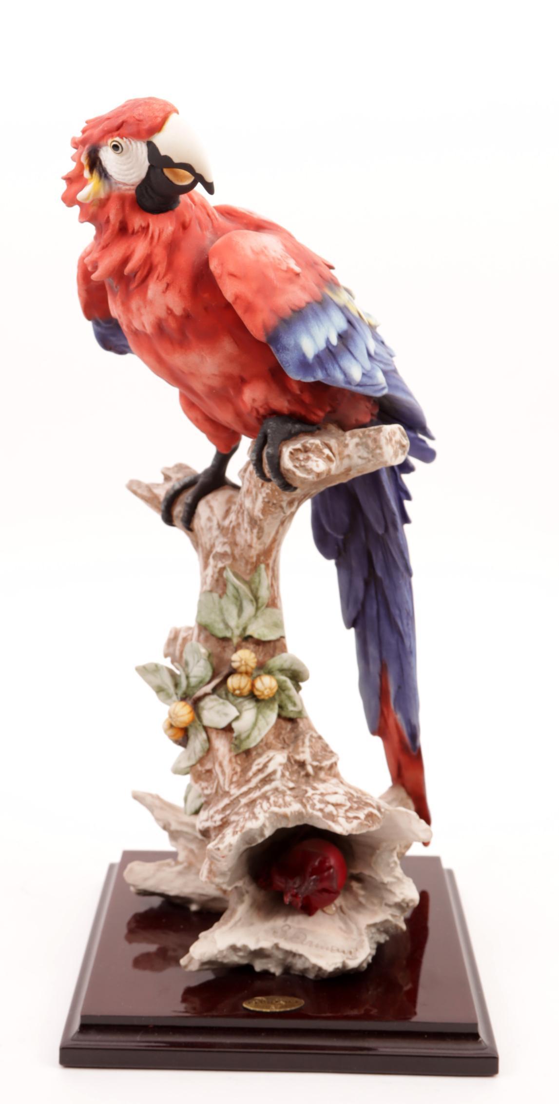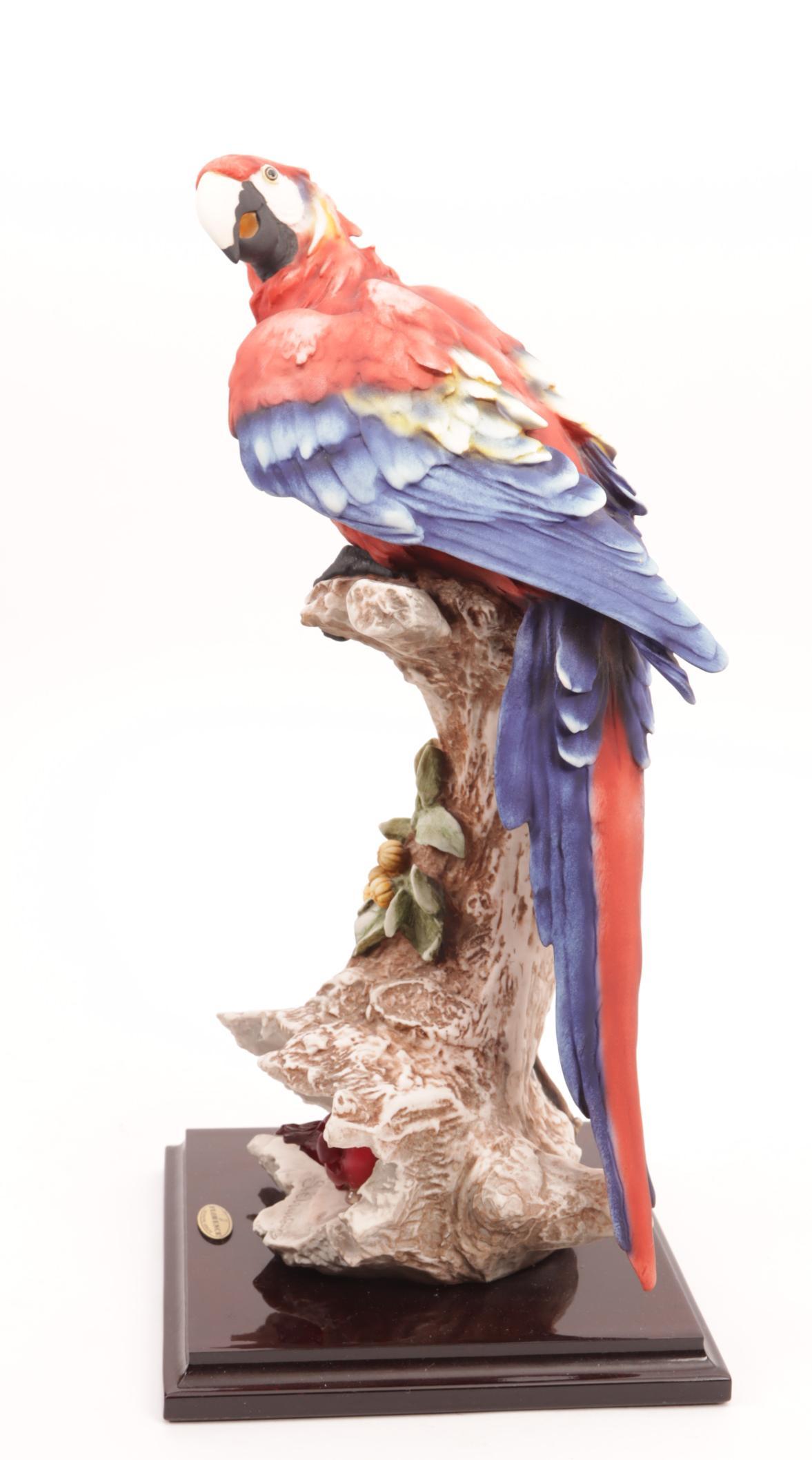 Gepolychromeerde Florance papegaai, Original Giuseppe Armani rustend op houten voetstuk, h.39 cm.