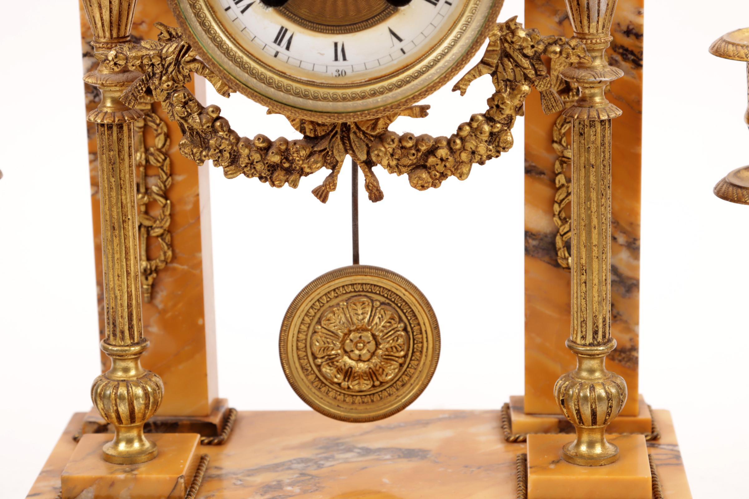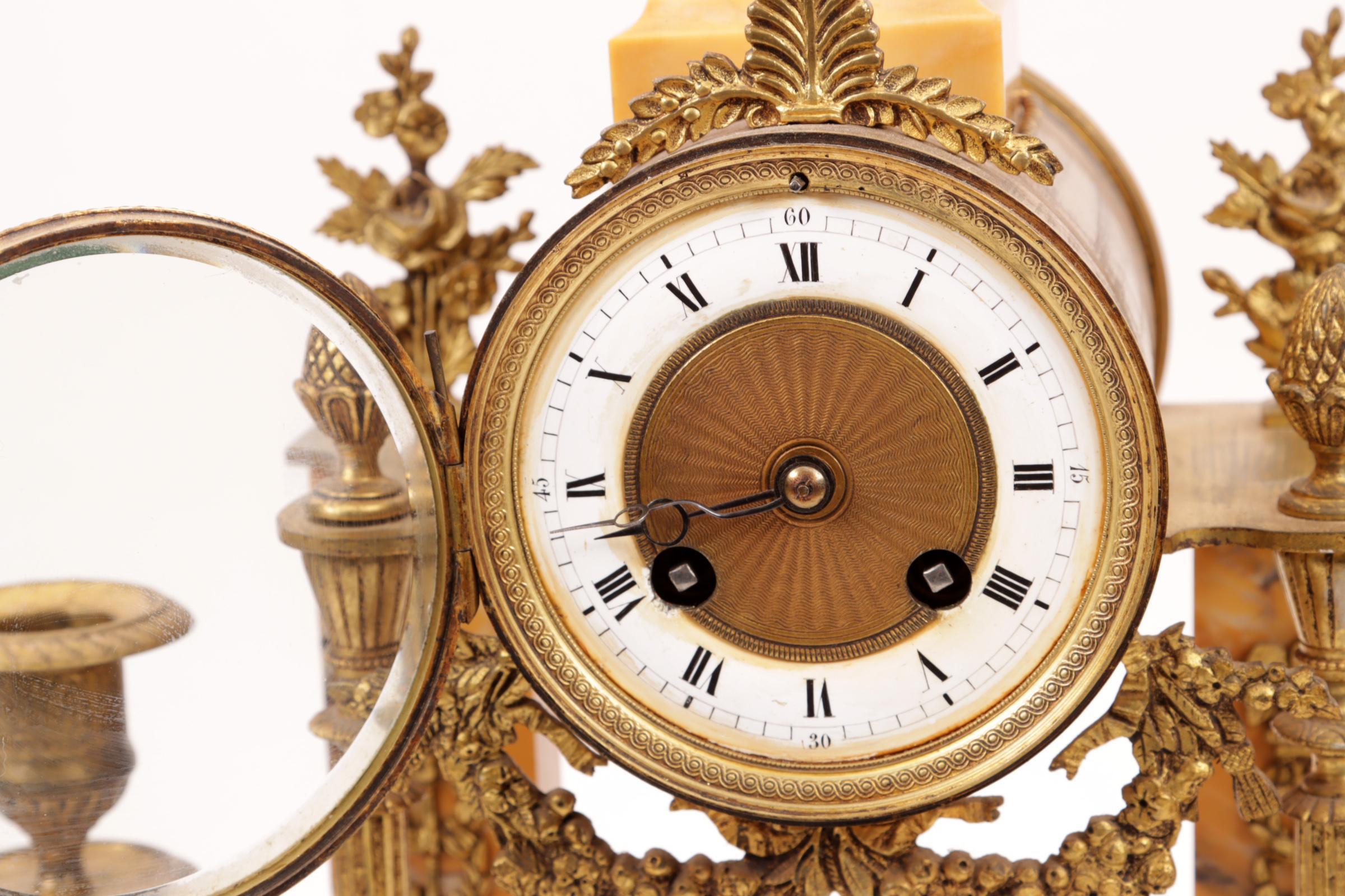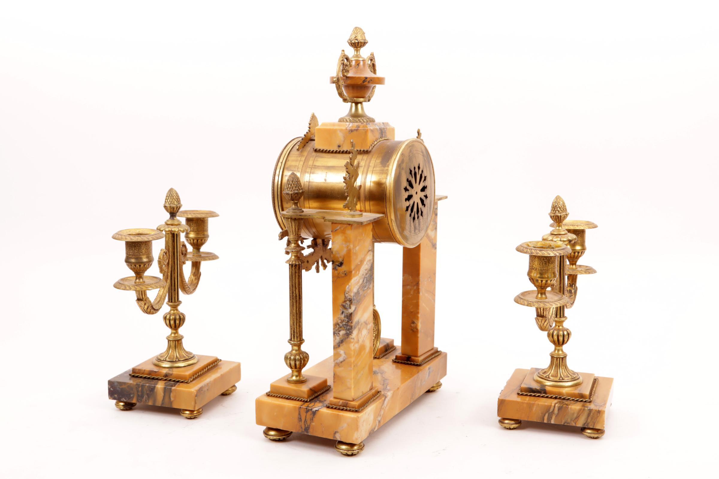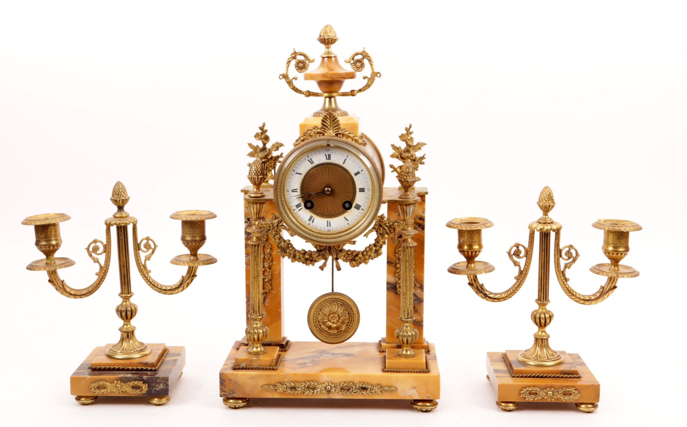 Albasten met koperen 3-delig klokkenstel, h.38 cm.