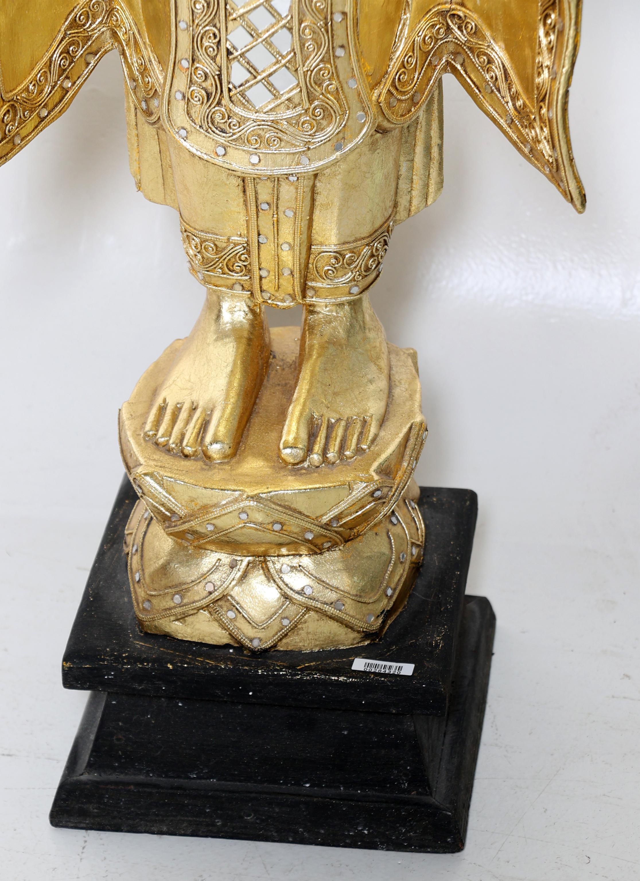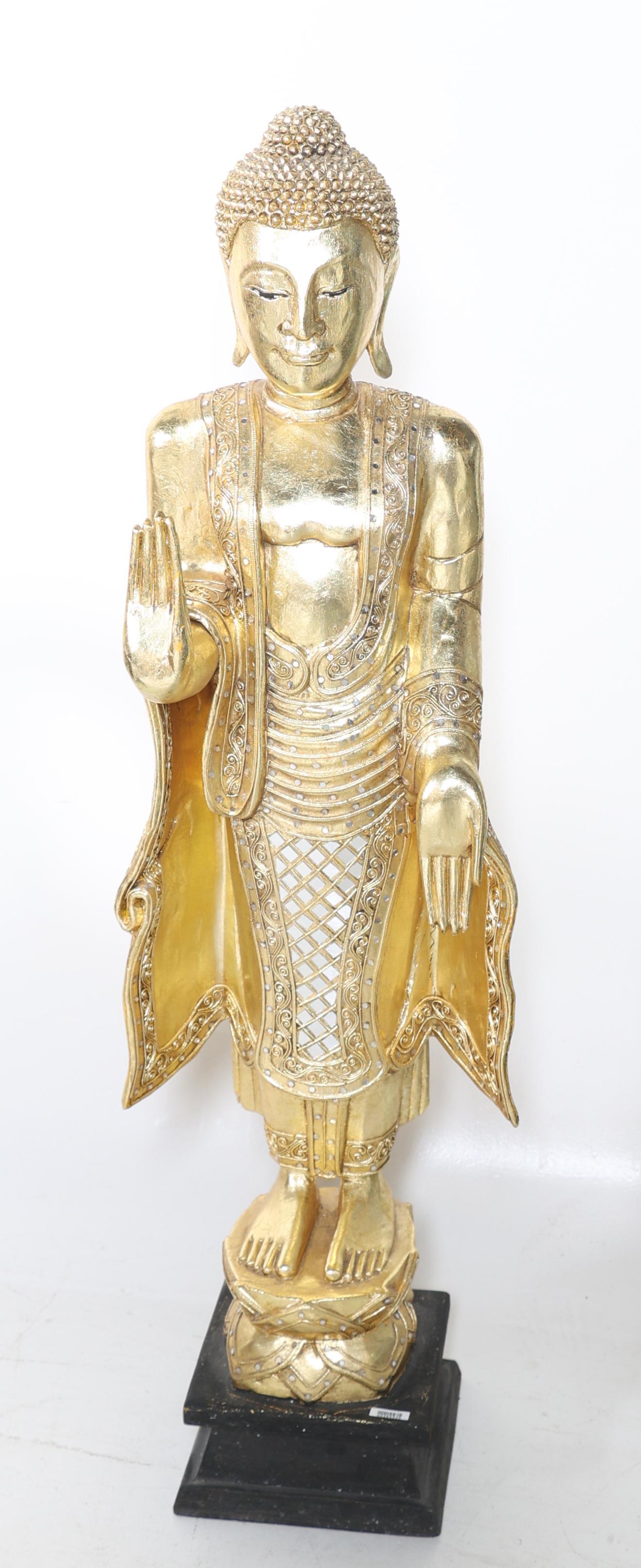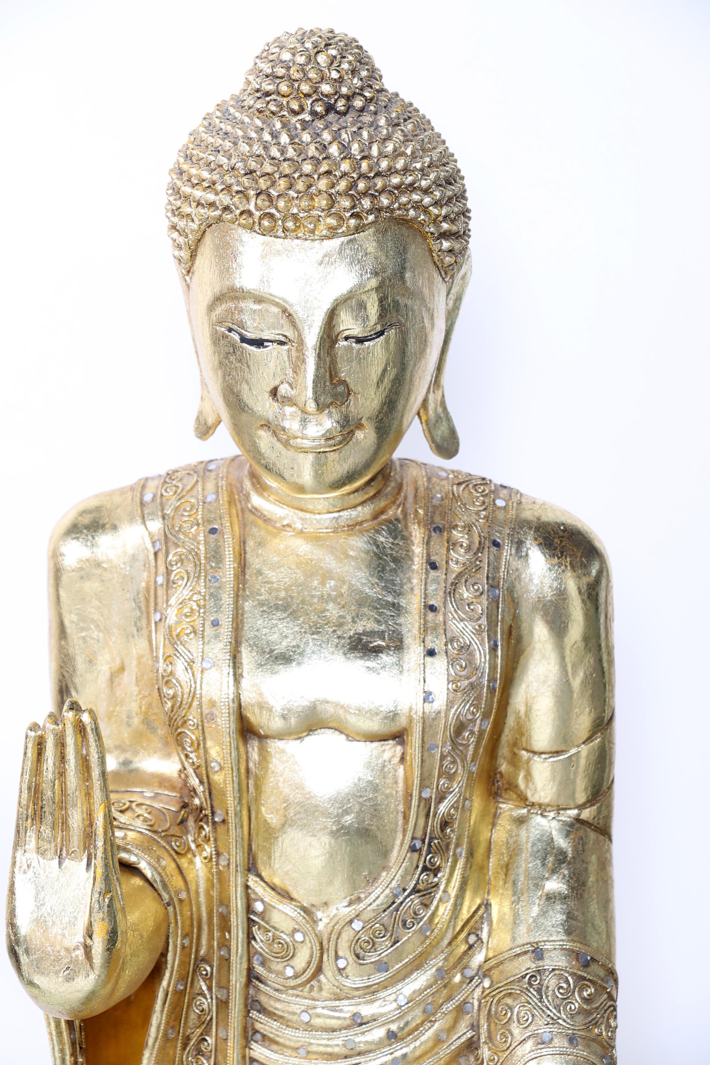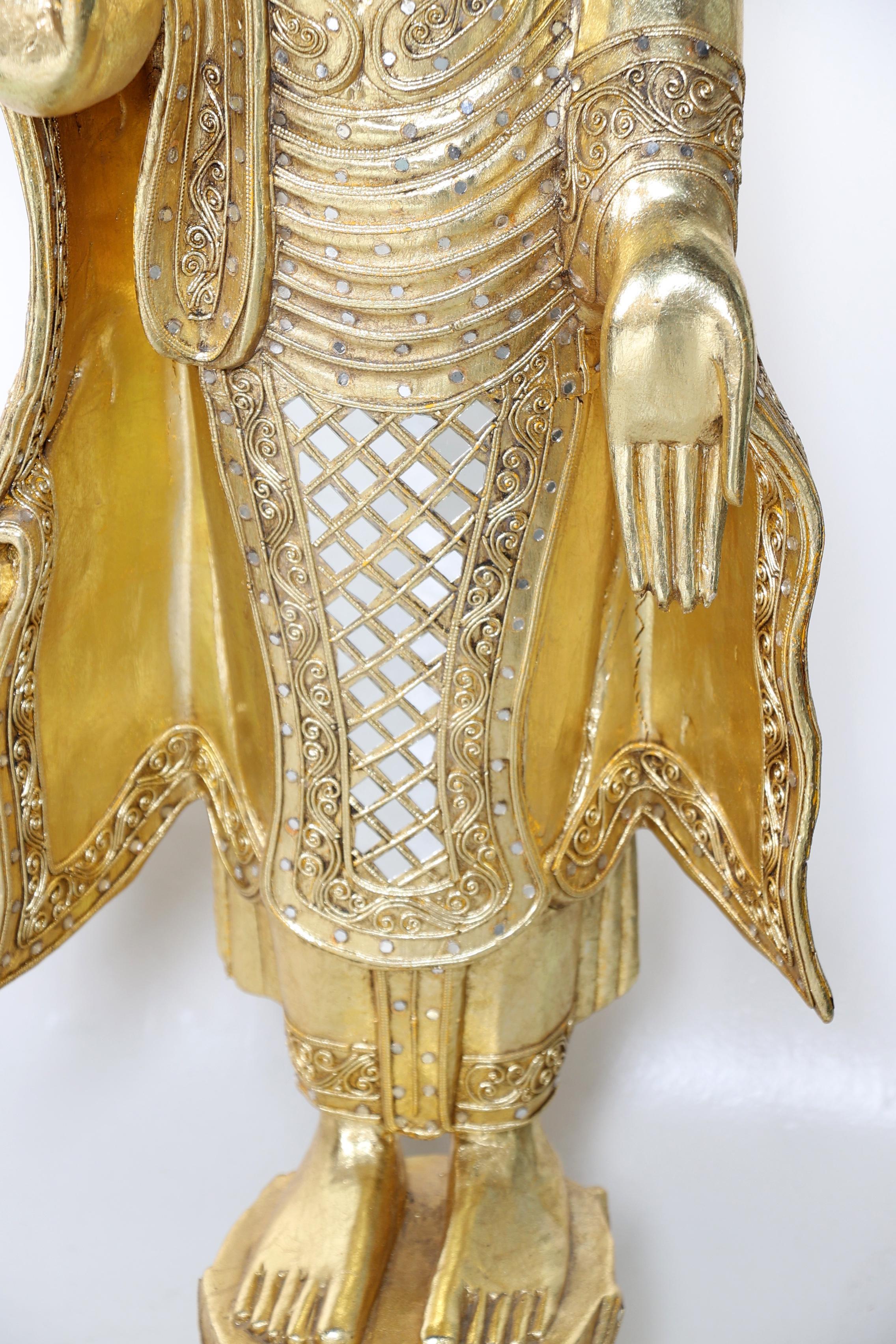 Goud gelakte met spiegel gedecoreerde staande houten Thaise Boeddha, h.113 cm.