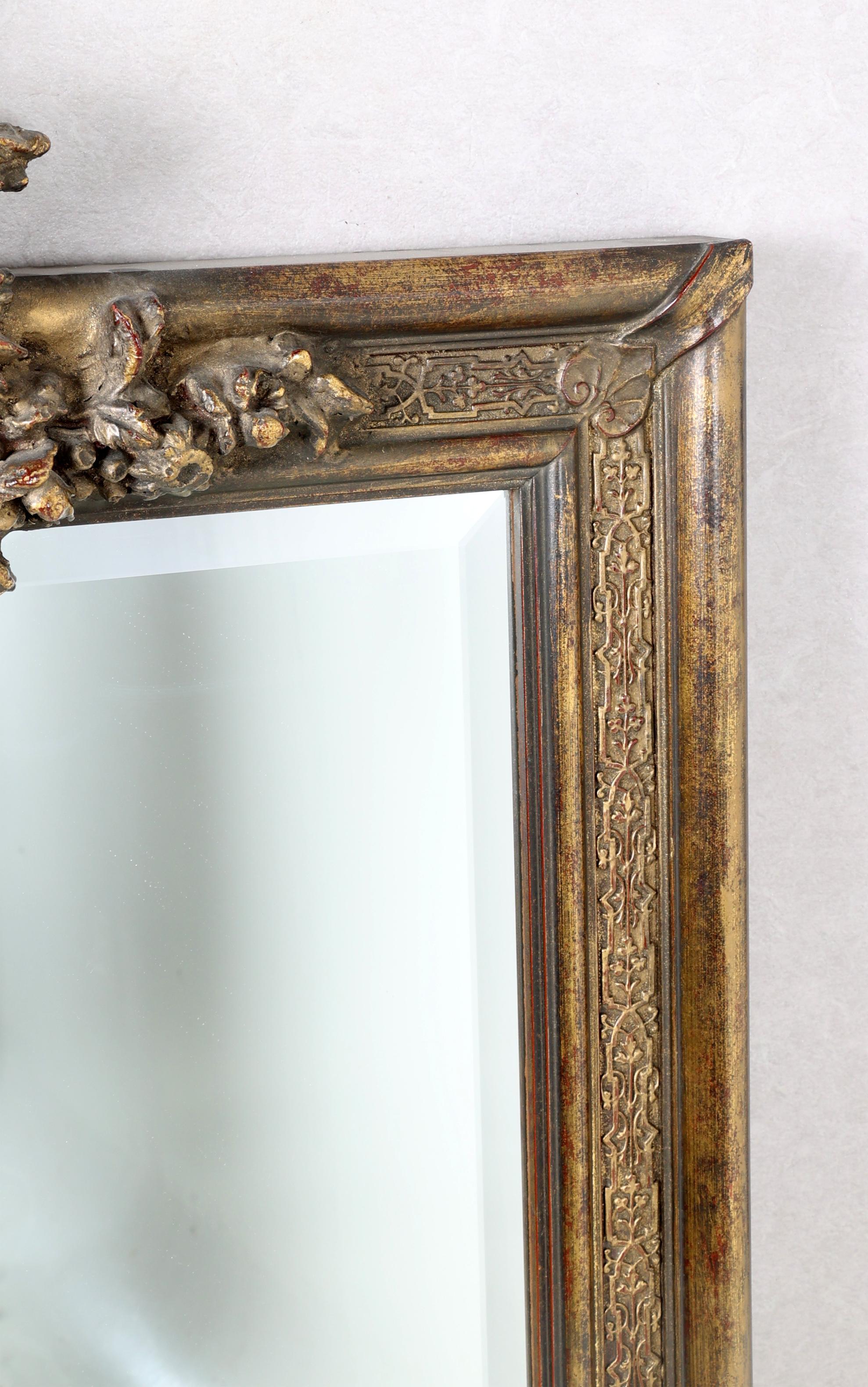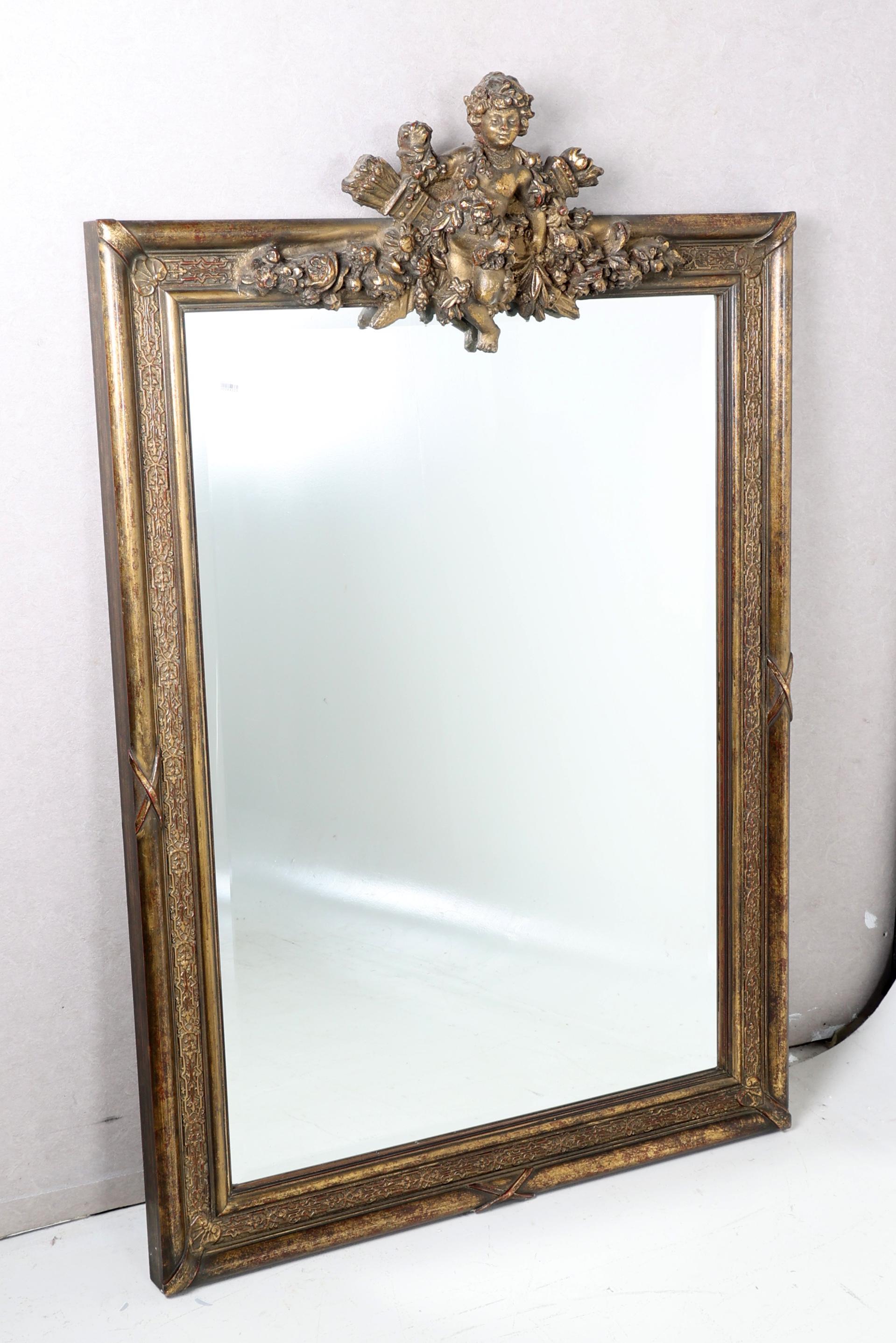 Geslepen spiegel in met engelen gedecoreerde goudkleurige kuiflijst, h.132 x b.88 cm.