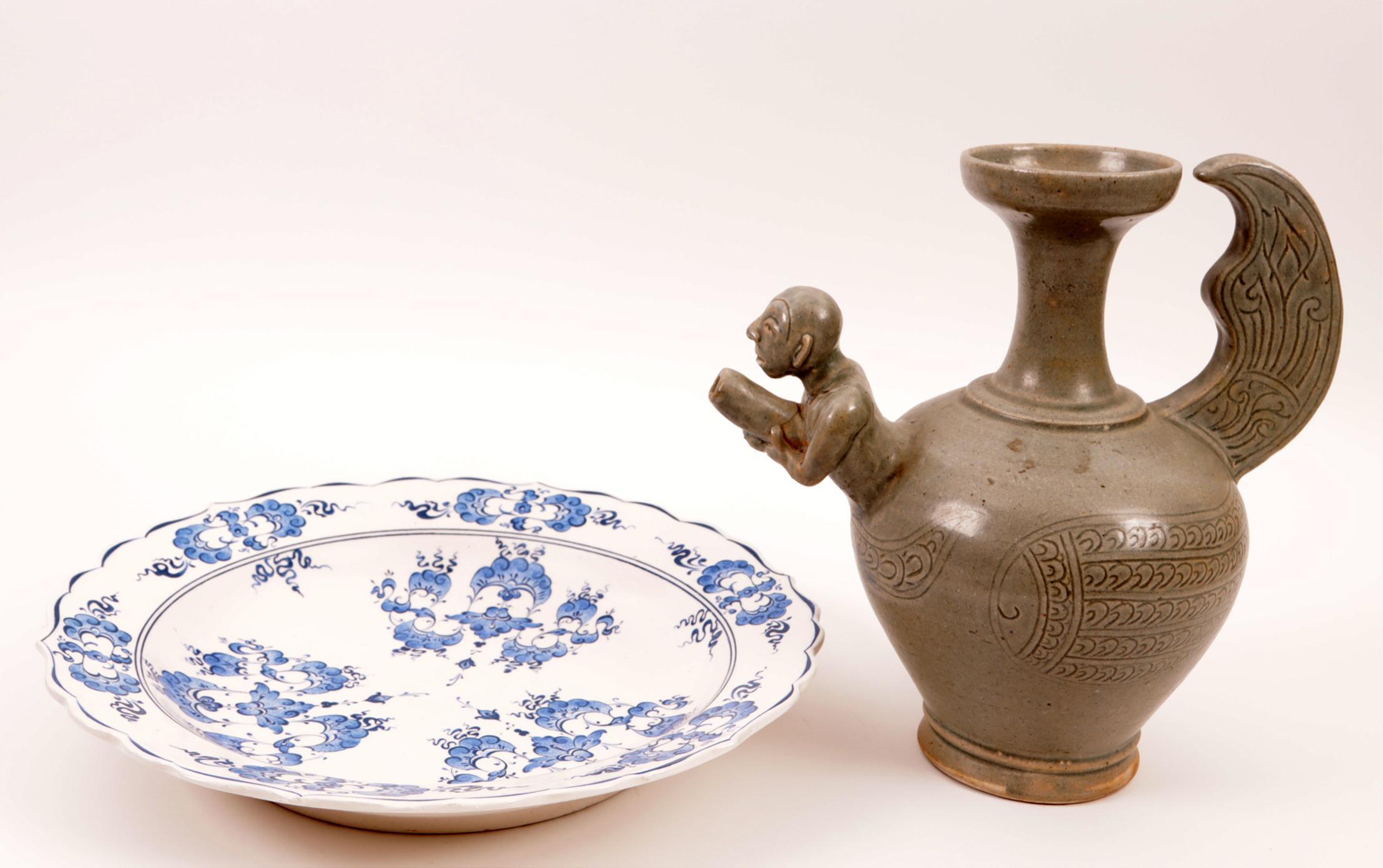 Blauw/wit Turks aardewerken schotel en een Celadon schenkkan (gelijmd)