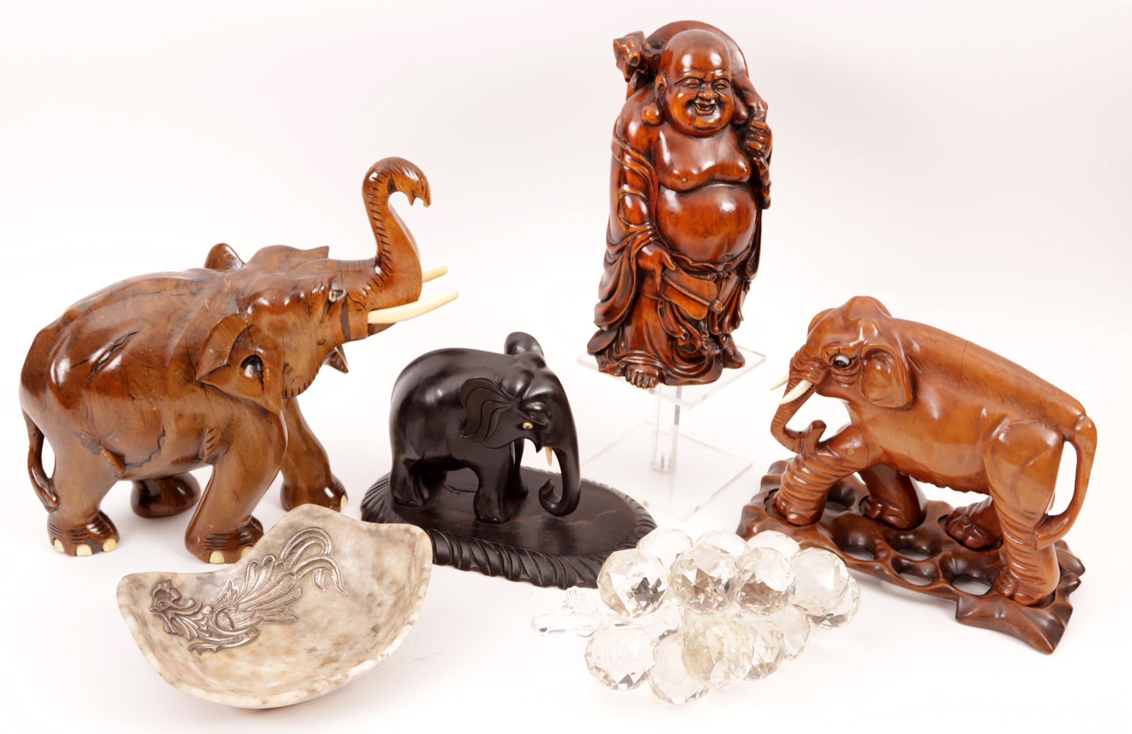 Koop diverse Oosterse houten beelden, kristallen druiventros en een natuurstenen schaaltje
