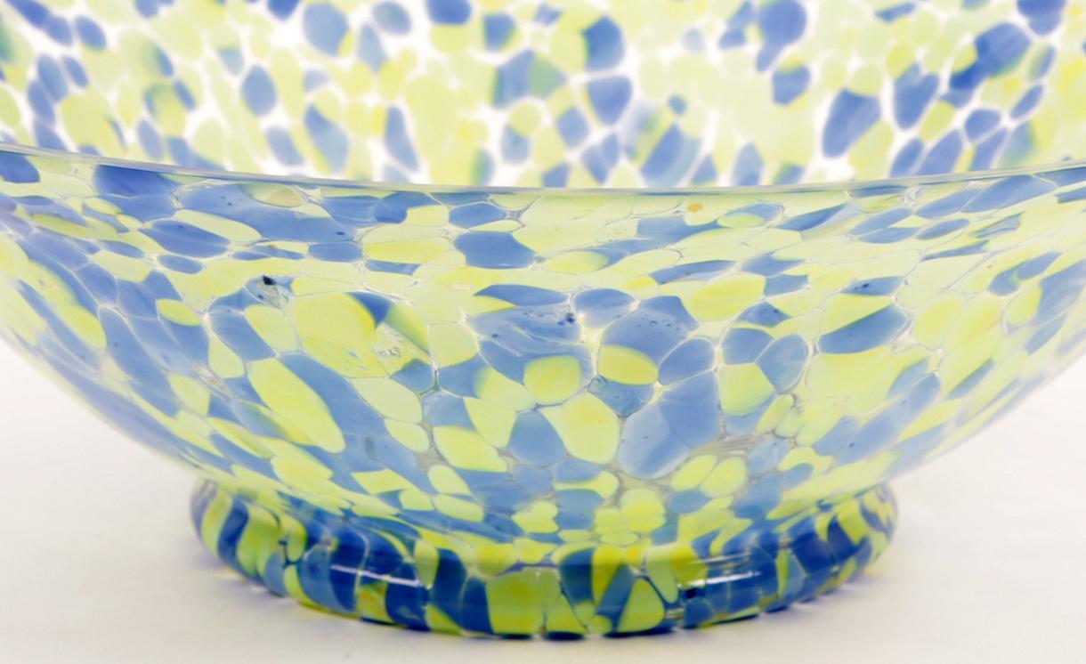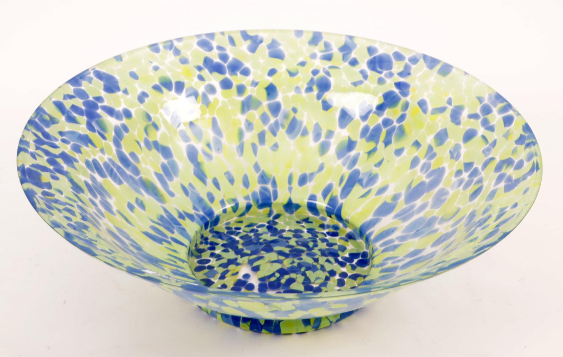 Groen met blauw glazen fruitschaal, diam.34 cm.