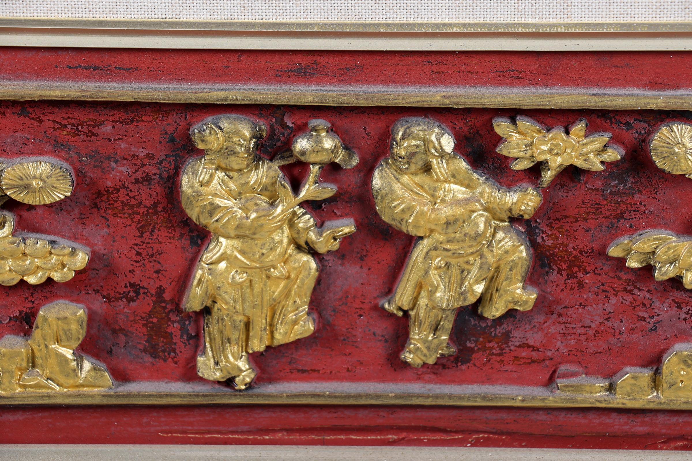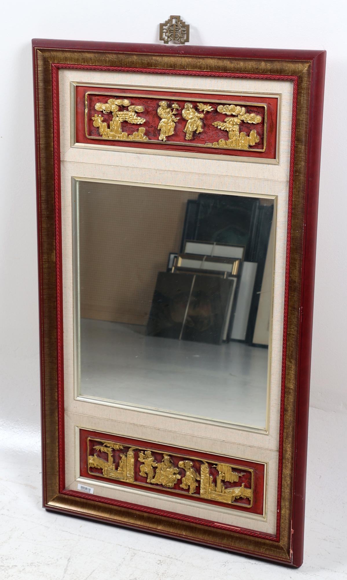 Oude spiegel met houten Chinese ornamenten, 84 x 49 cm. (kleine beschadigingen)
