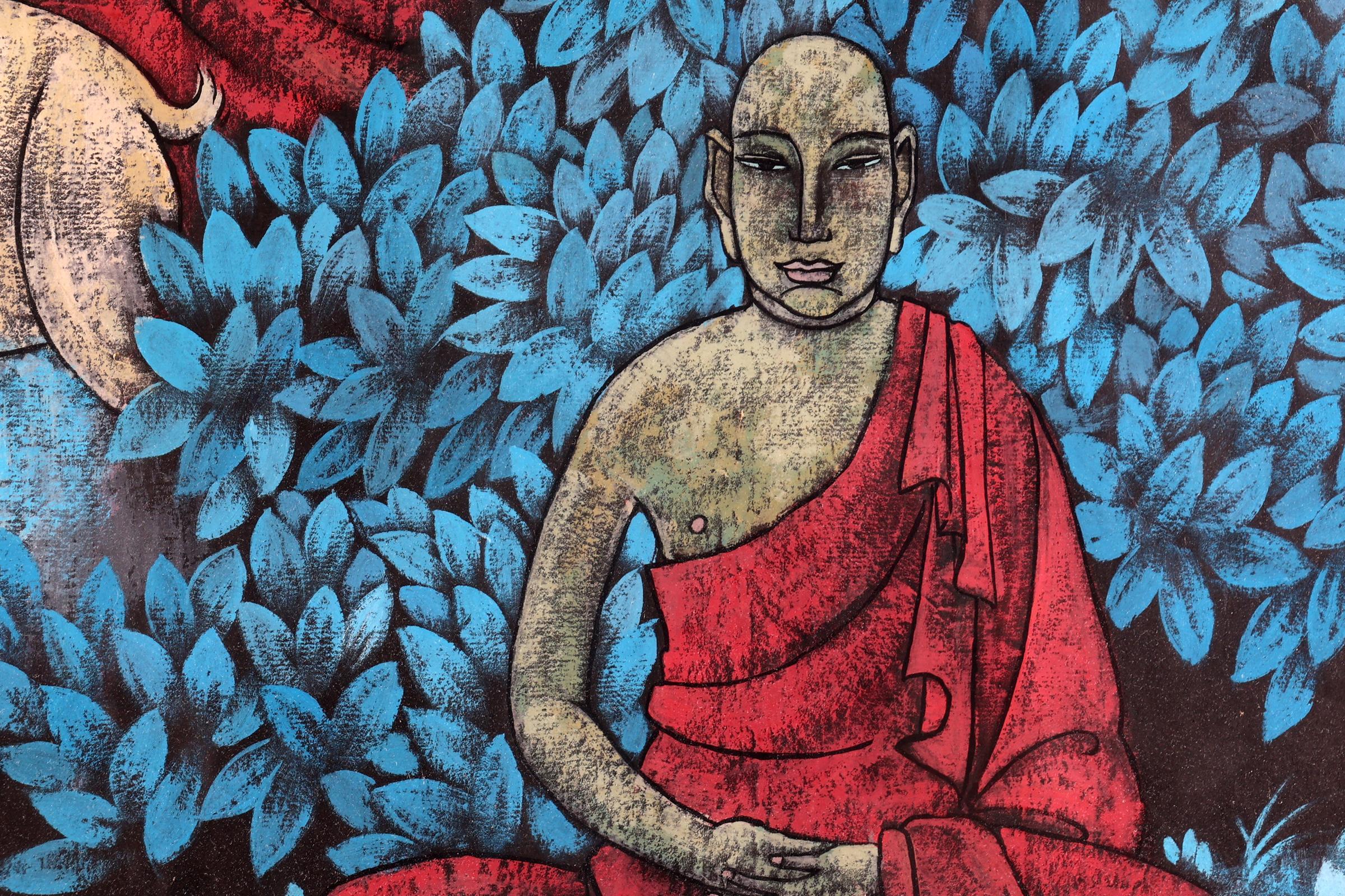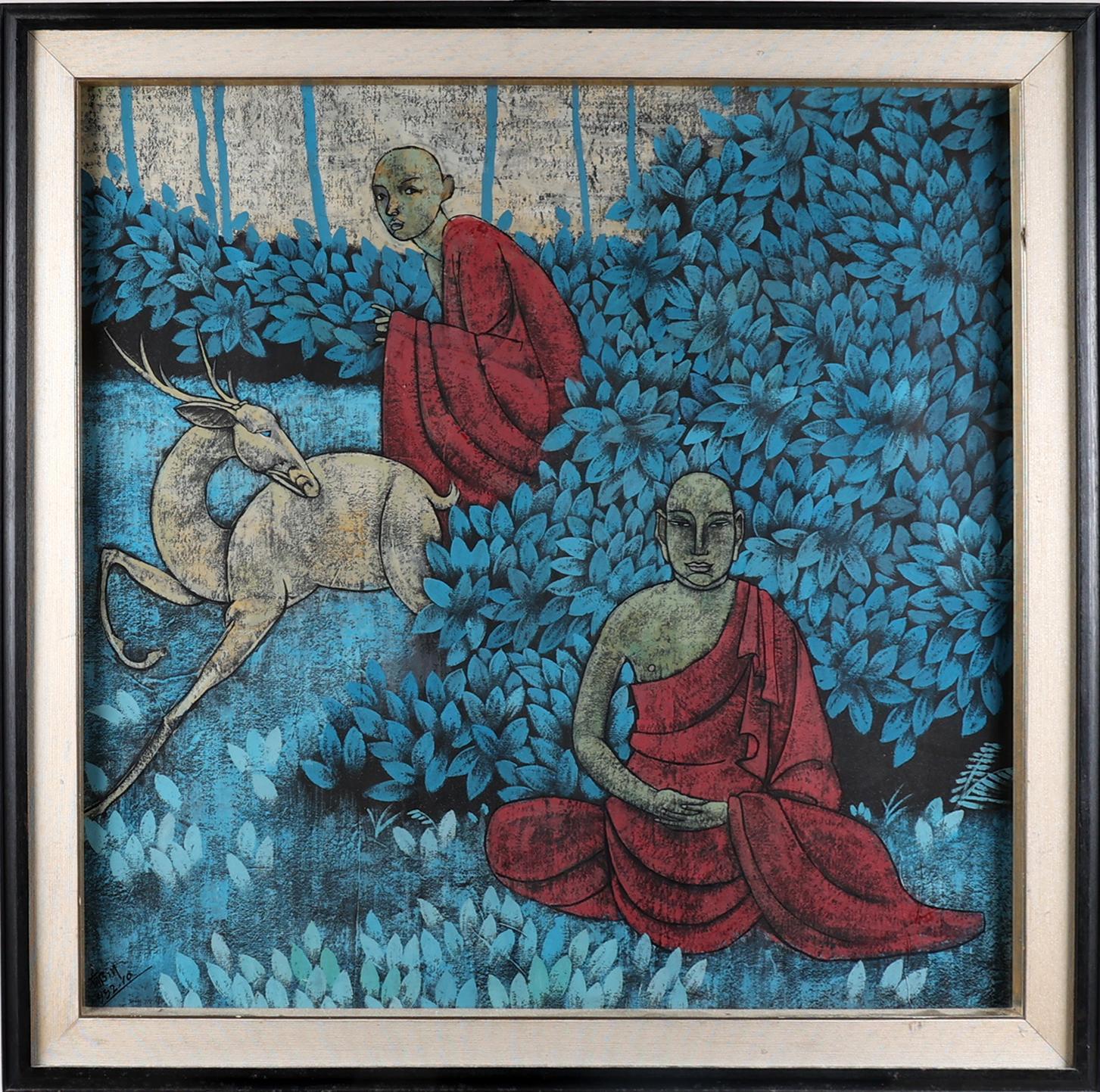 Chinese school, Twee Boeddhistische monniken in landschap met hert, acryl op papier achter glas, gedateerd 1992, 78 x 78 cm.