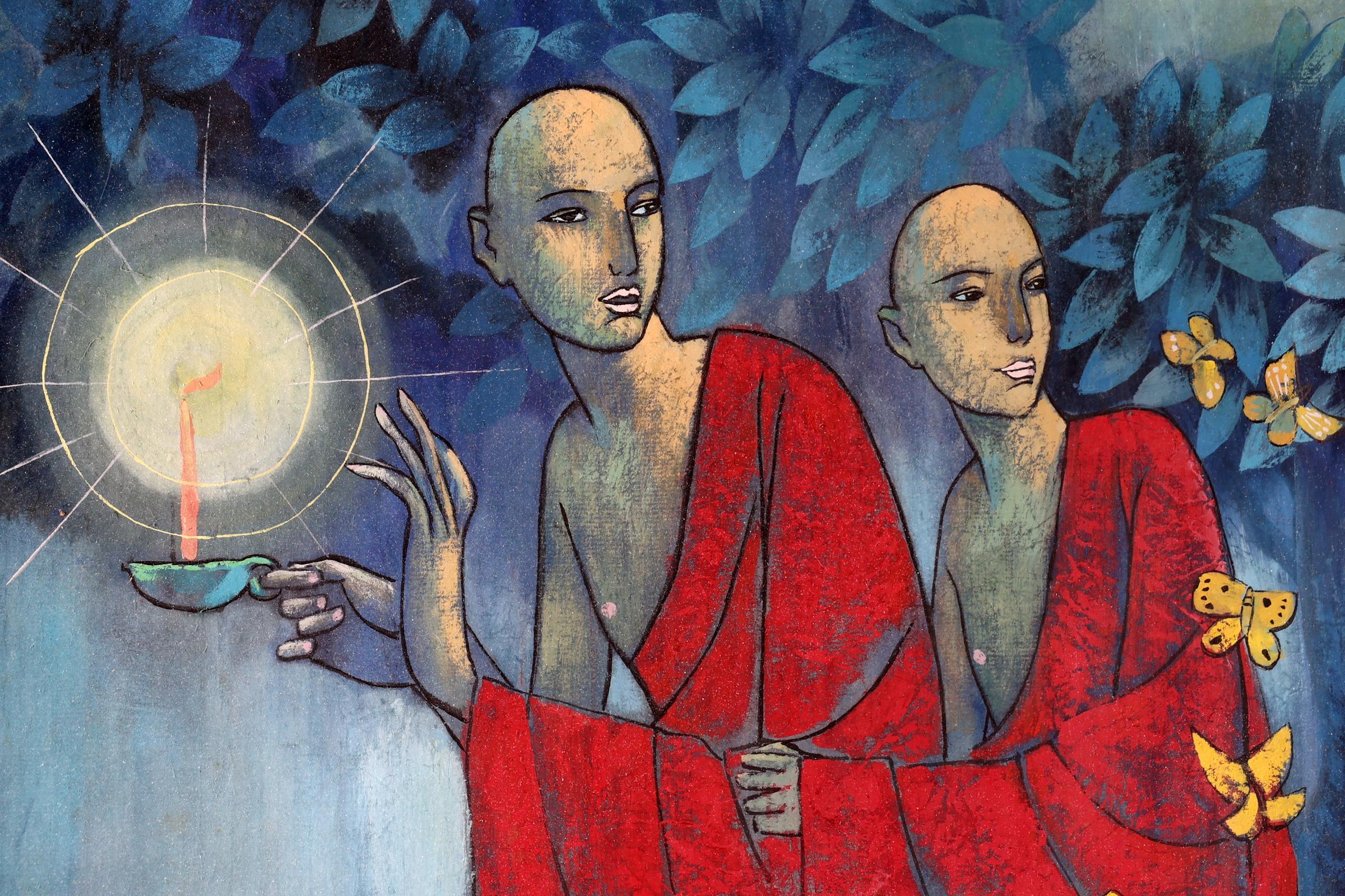 Chinese school, Twee Boeddhistische monniken met kaarsje in de nacht, acryl op papier achter glas, gesigneerd en gedateerd '99, 87 x 85 cm.
