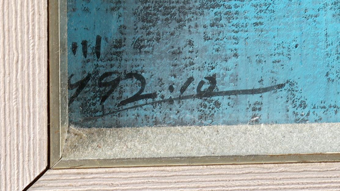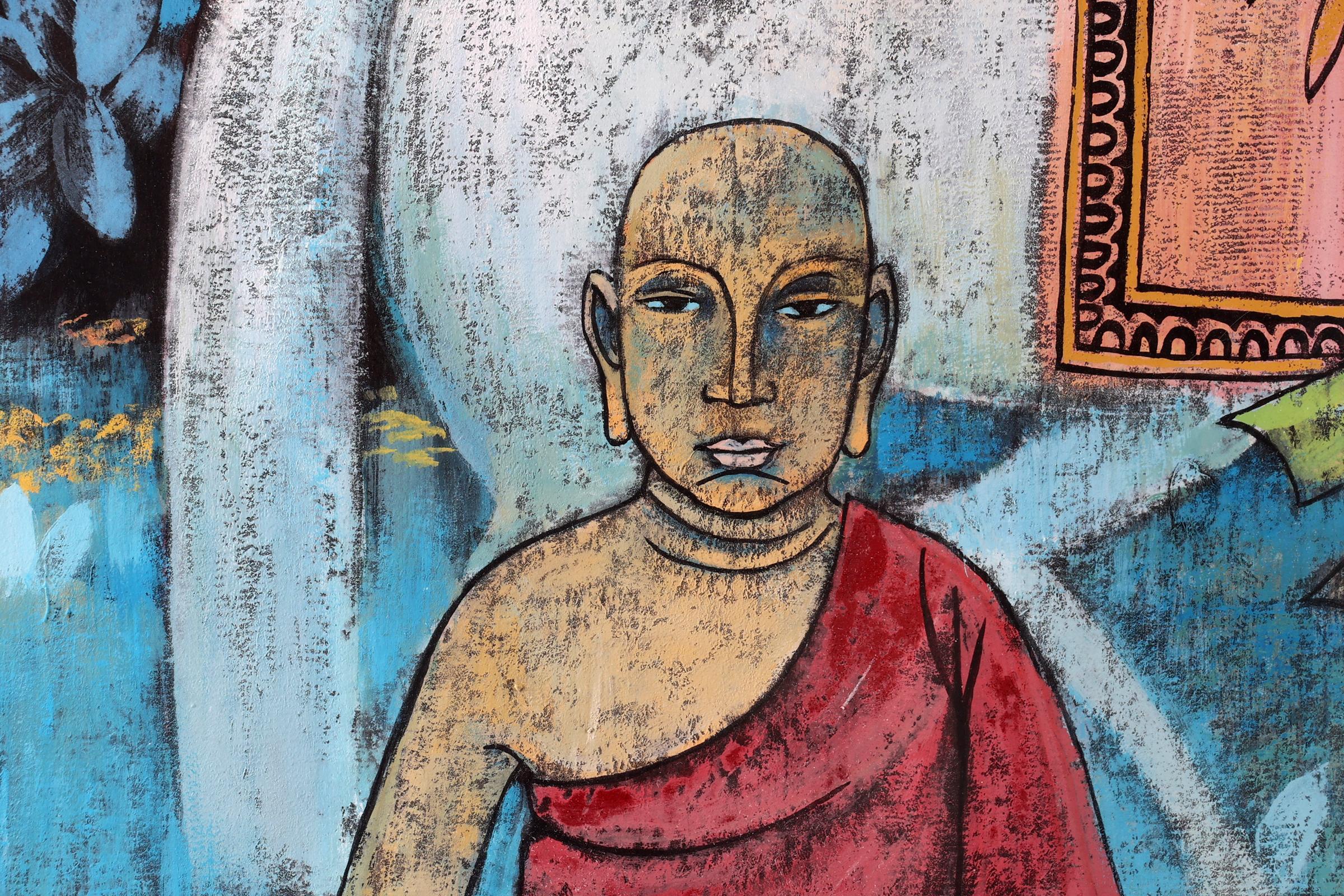 Chinese school, Twee Boeddhistische monniken in landschap met paard, acryl op papier achter glas, gedateerd 1992, 81,5 x 76,5 cm.