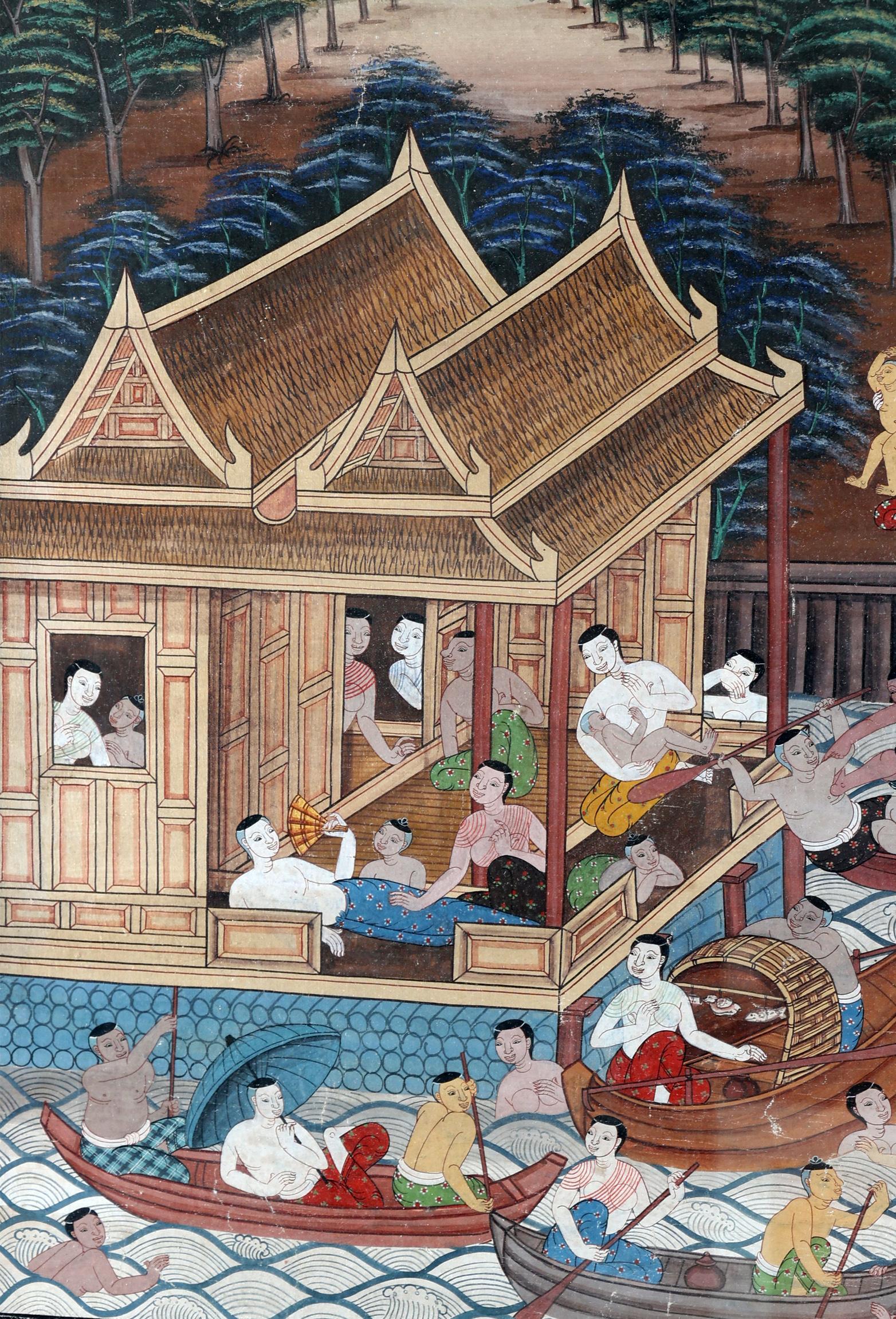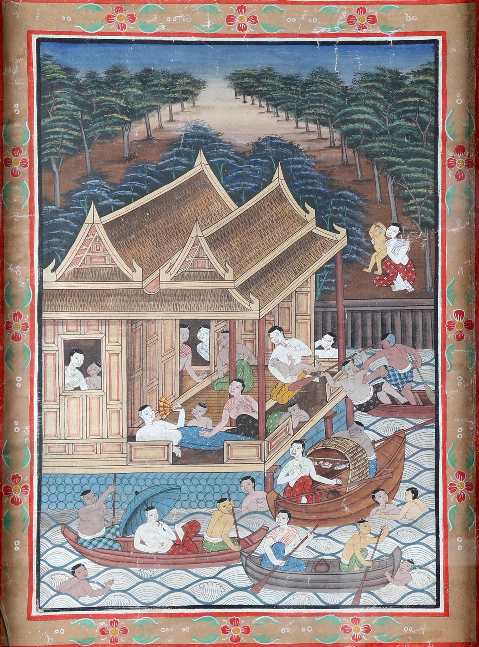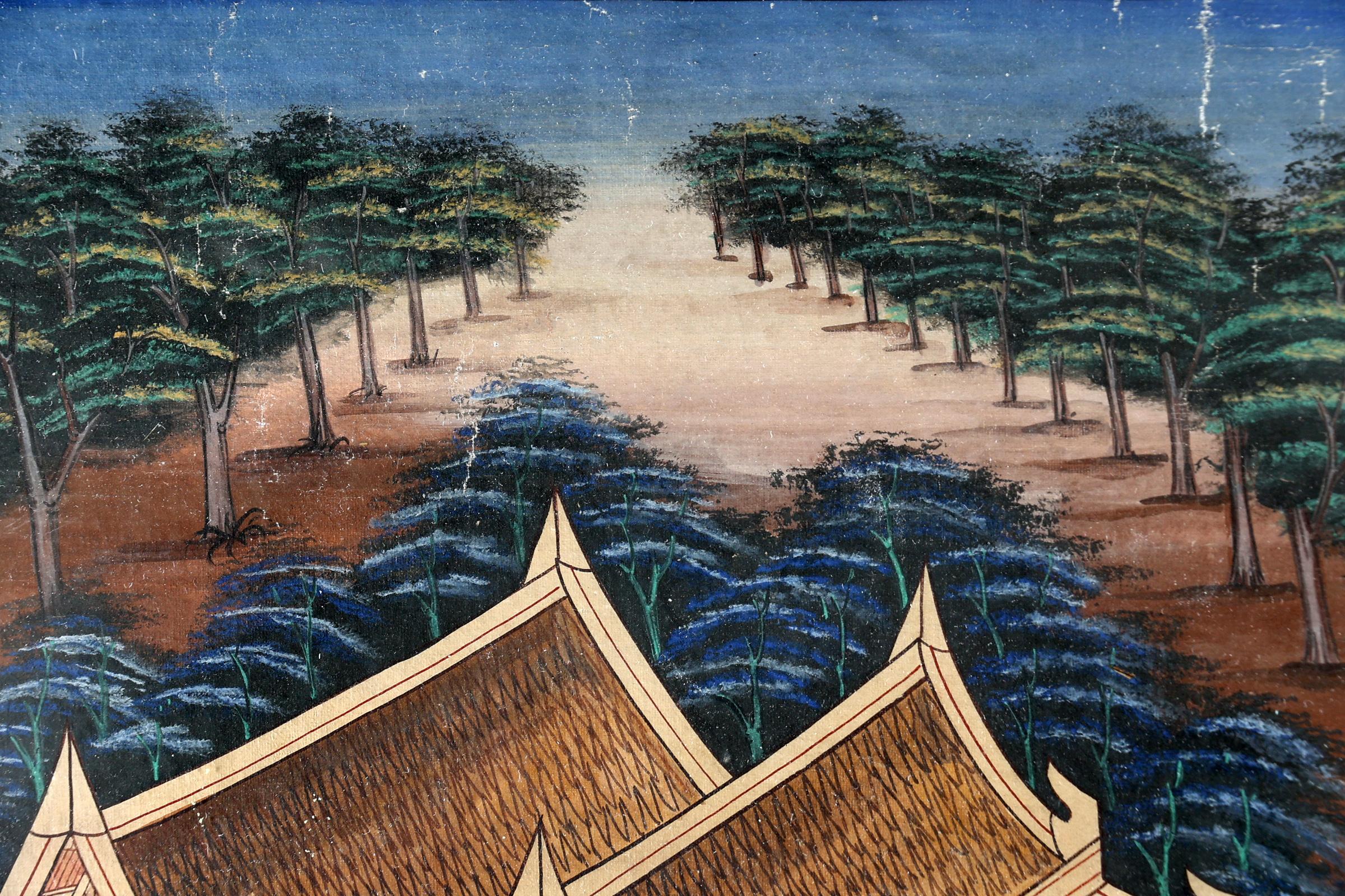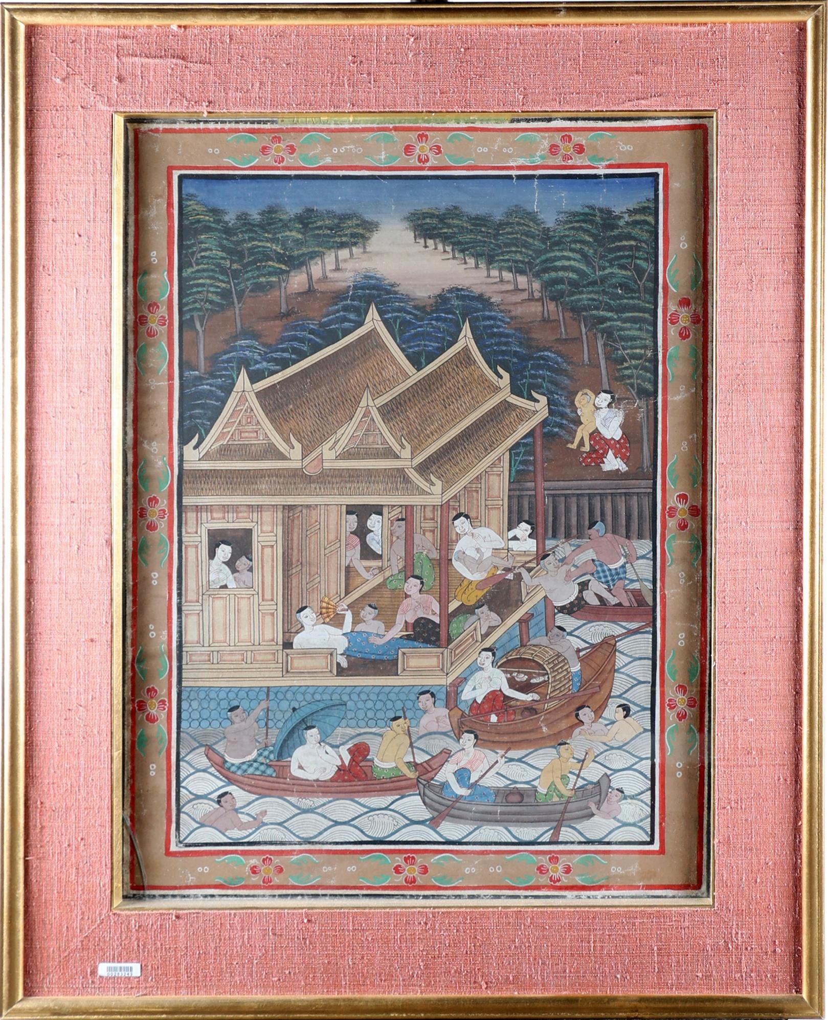 Onb. meester, Aziatische voorstelling, gouache op doek, 63 x 47 cm. (barst in glas)