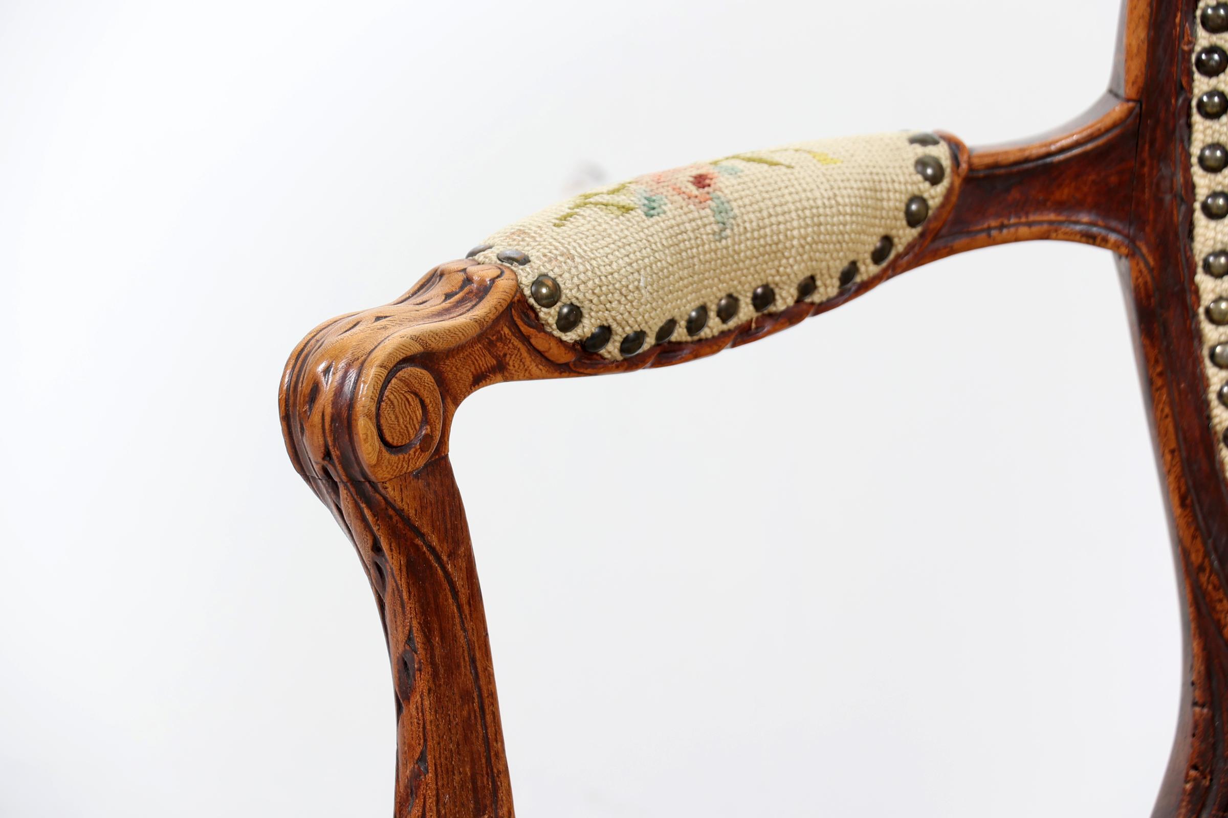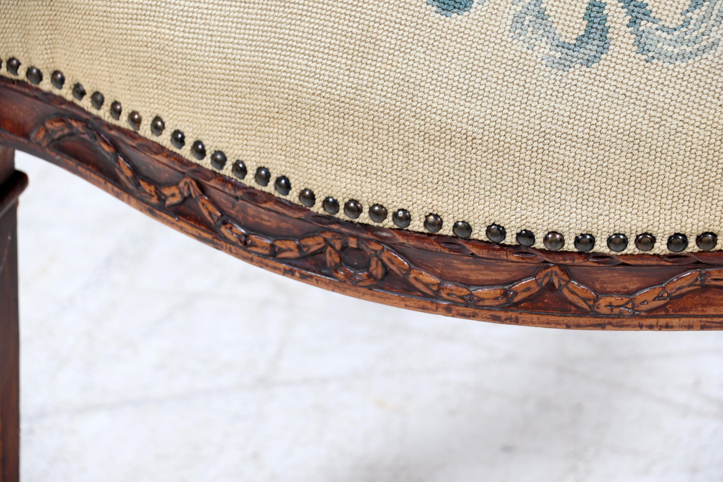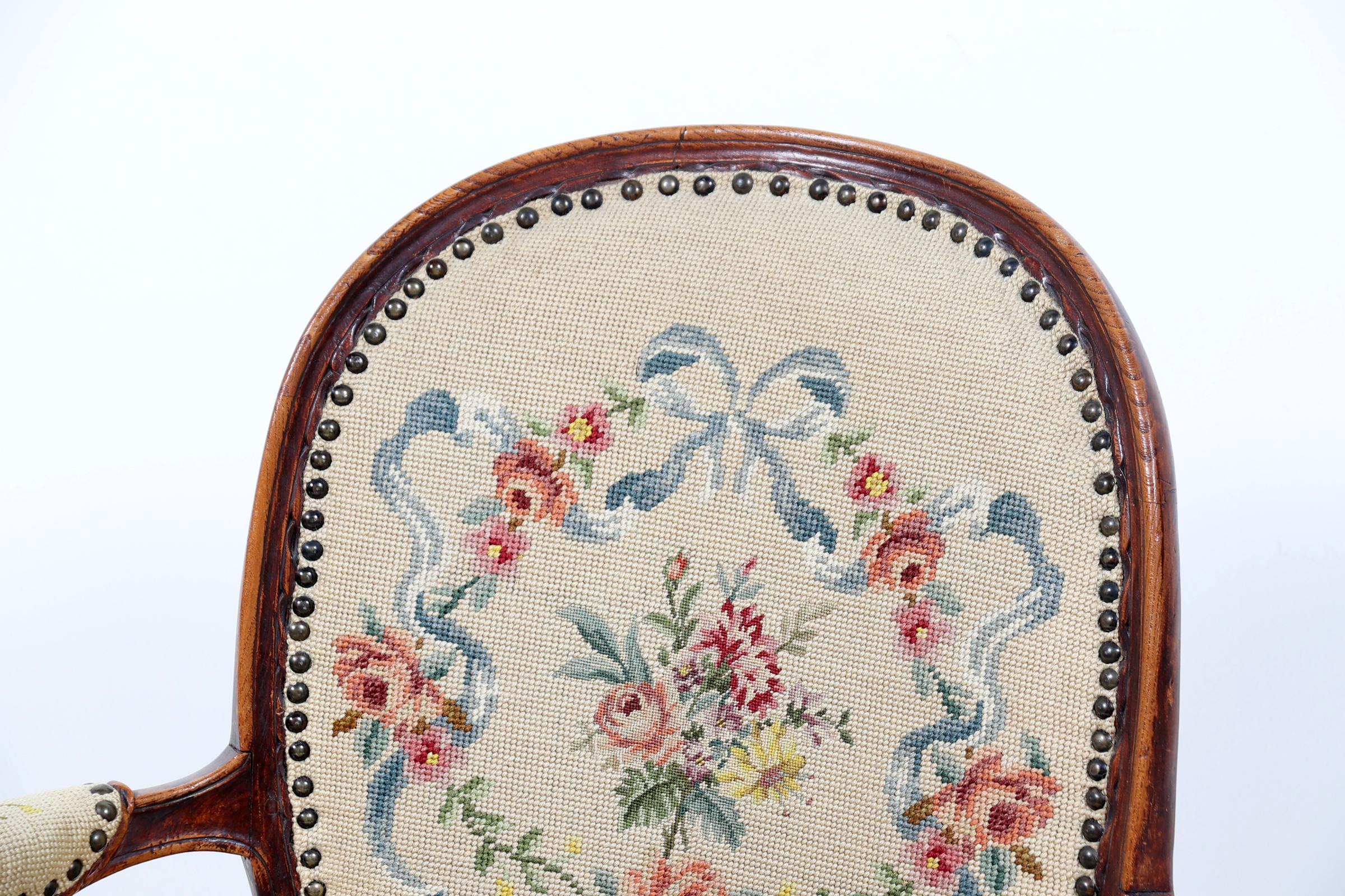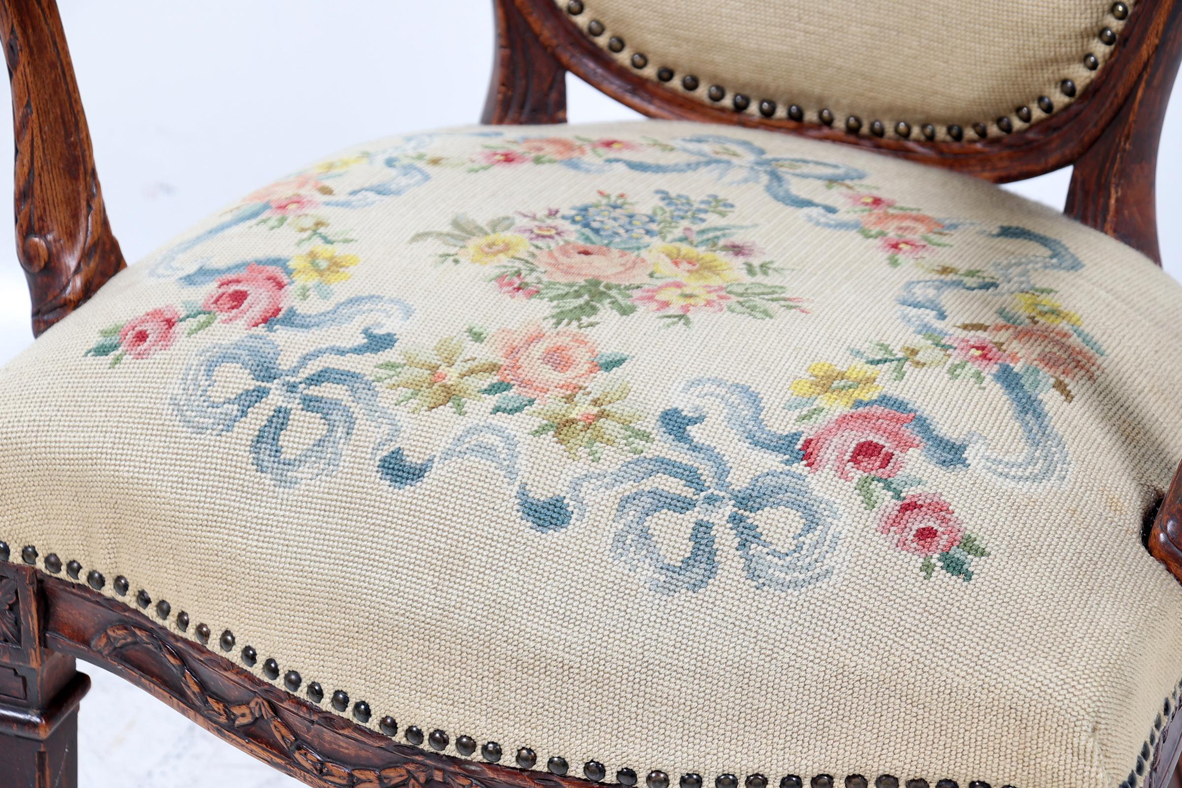 Antieke iepenhouten Louis Seize-stijl armfauteuil met geborduurde stoffering
