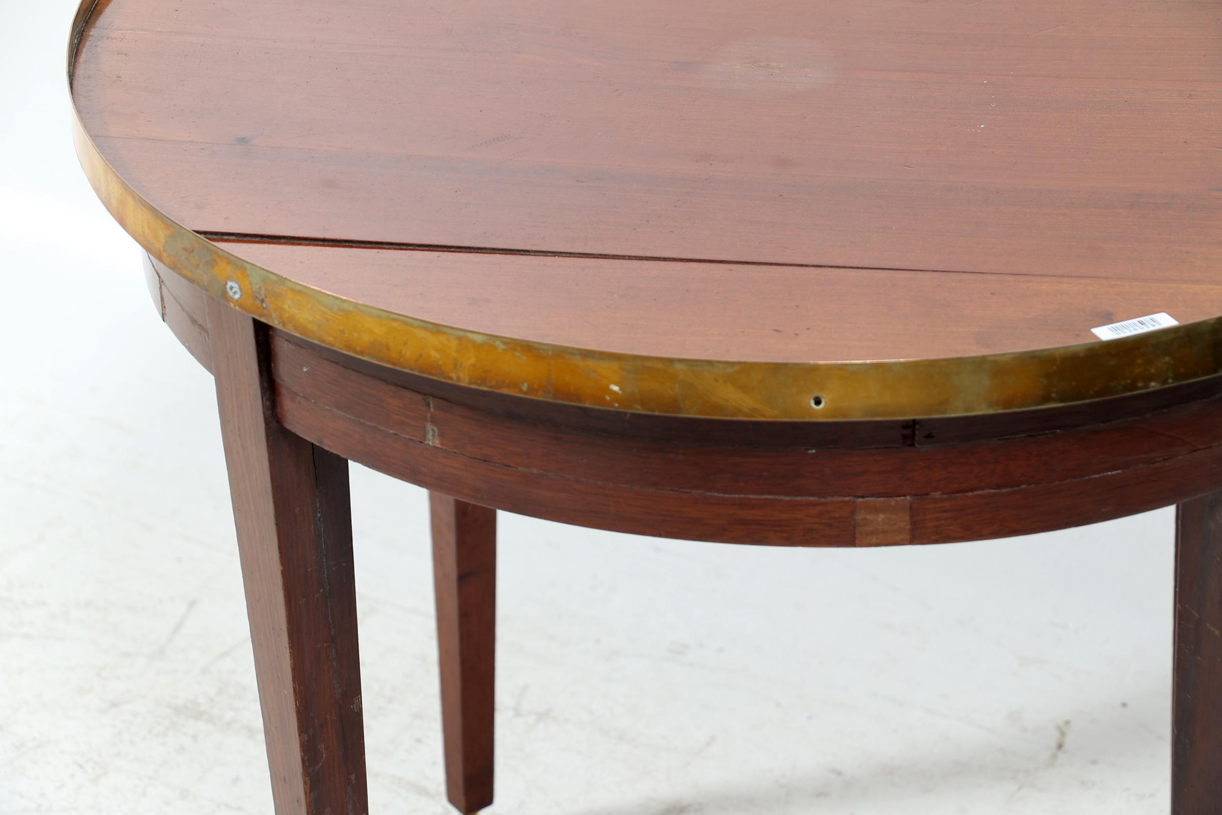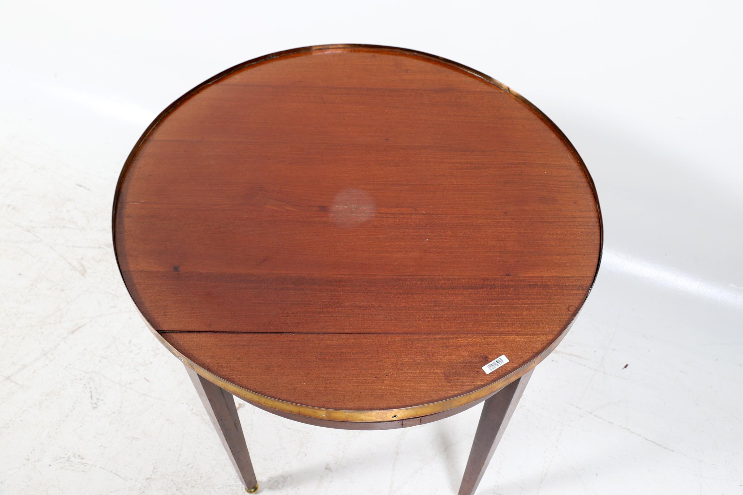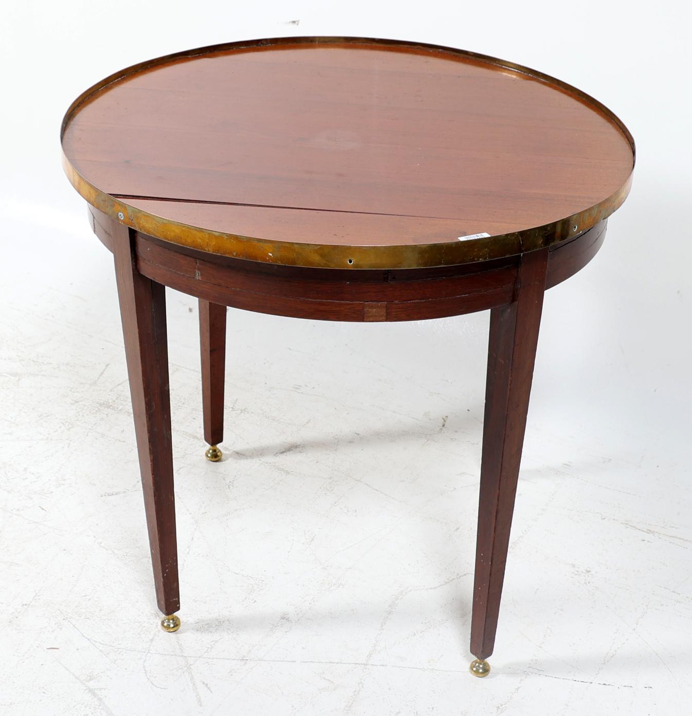 Mahoniehouten bijzettafel met koperen galerijrand, h.60 x diam.65 cm.