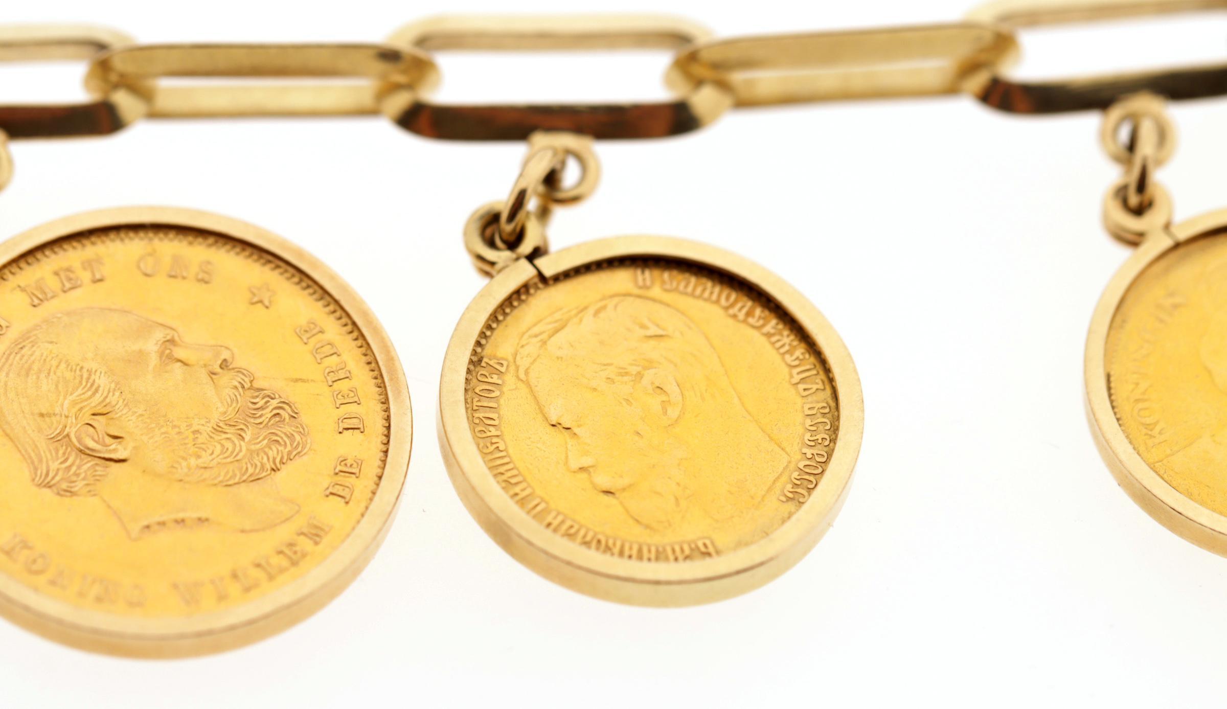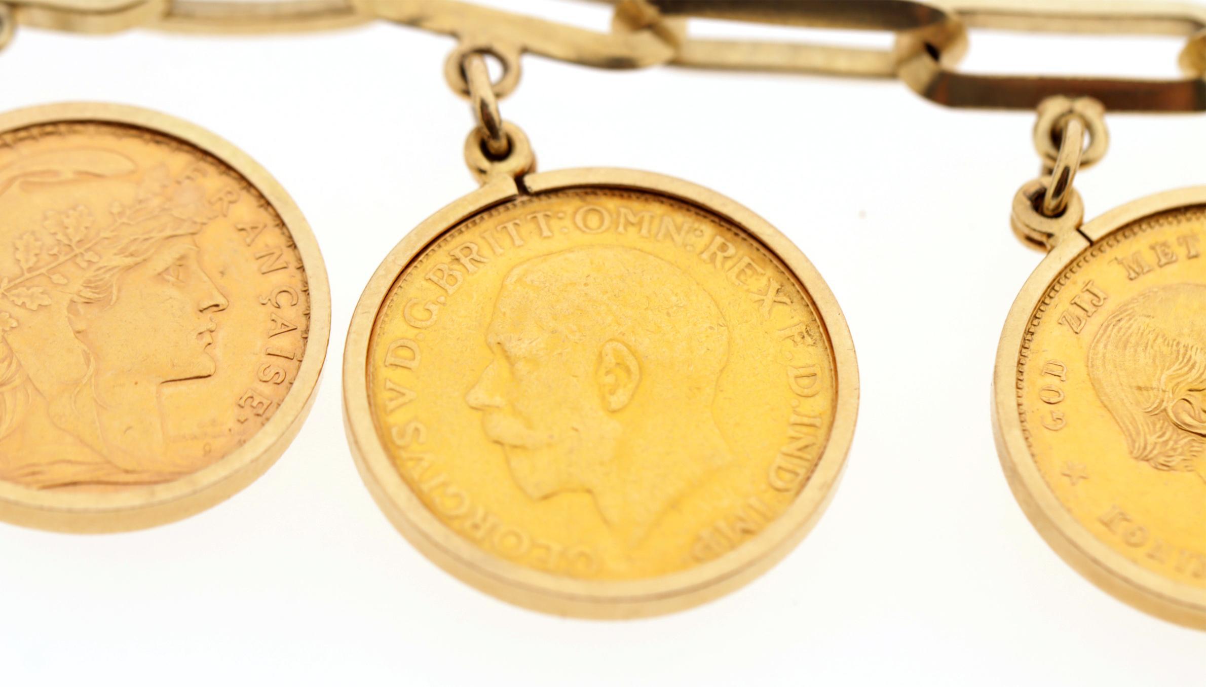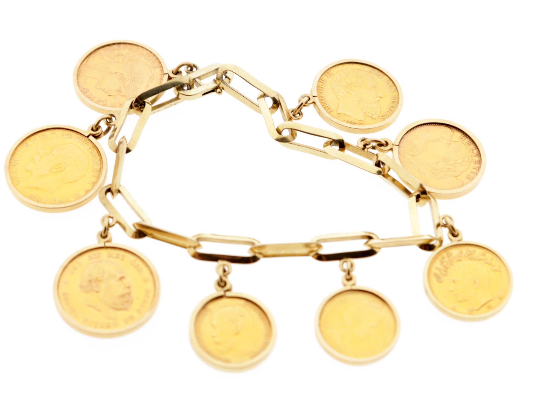 14 Kt. gouden schakelarmband met diverse fijngouden munten, etc., totaal 71,2 gram