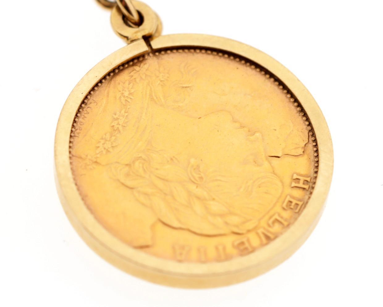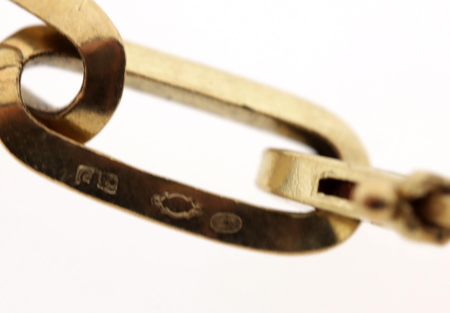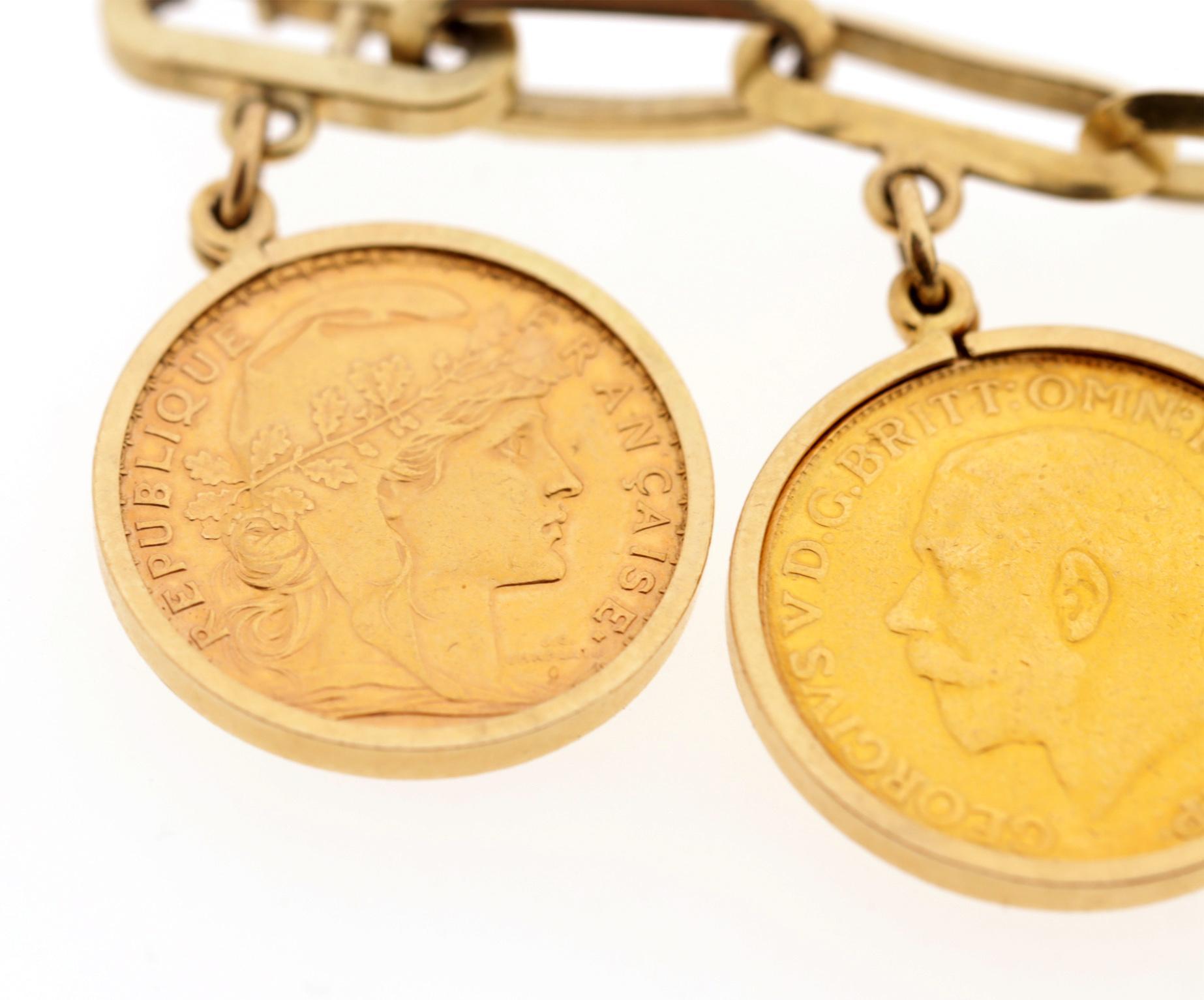 14 Kt. gouden schakelarmband met diverse fijngouden munten, etc., totaal 71,2 gram