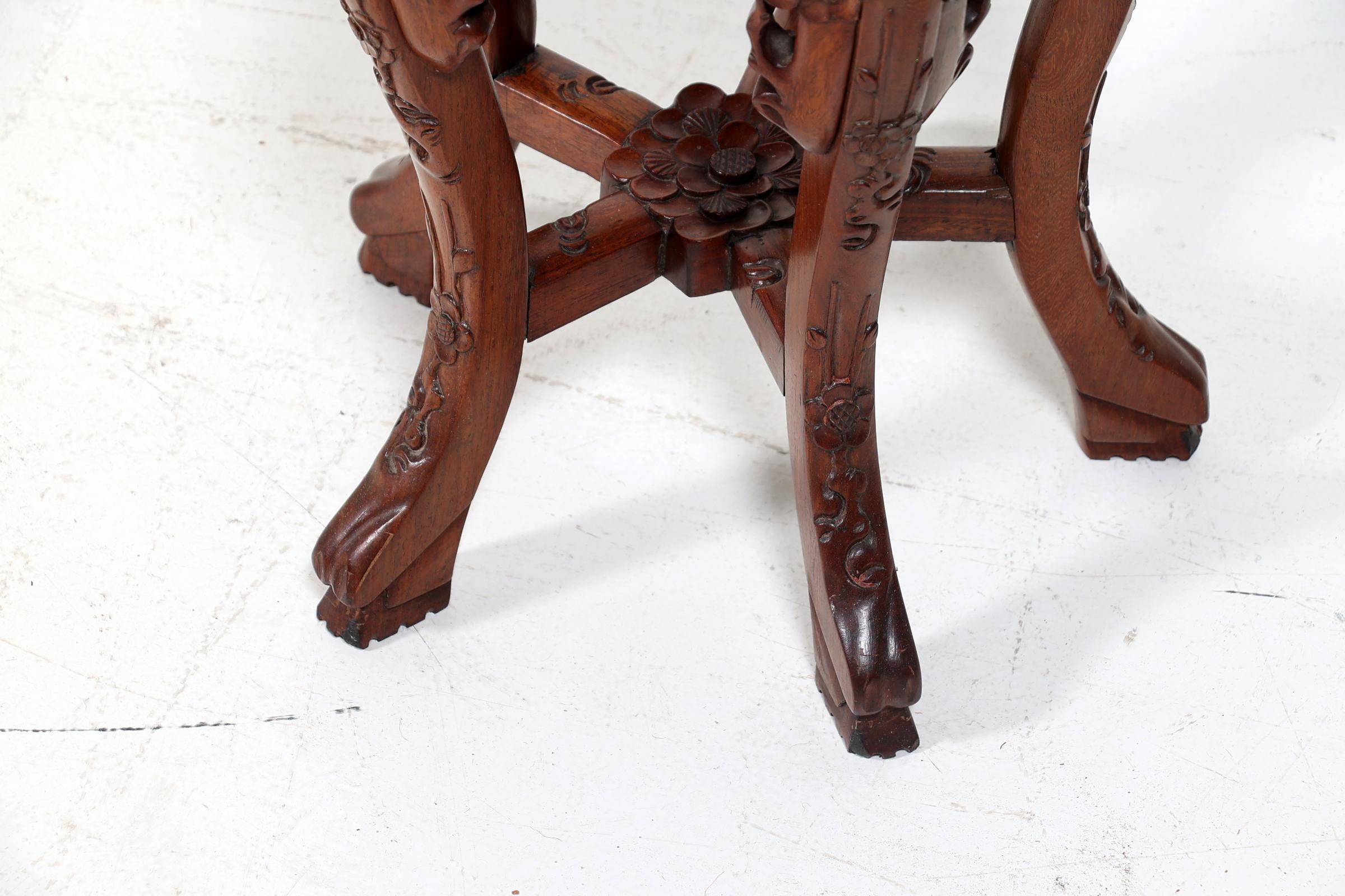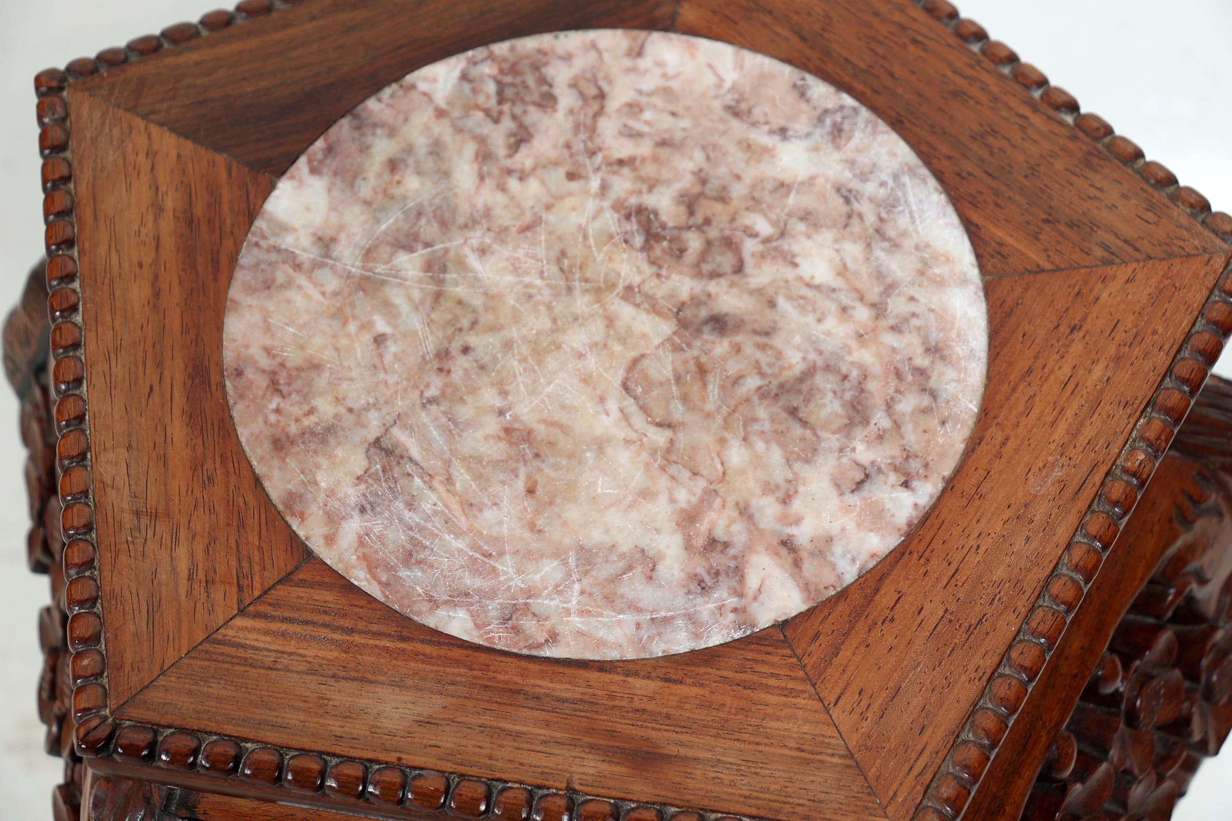 Opengewerkte houten 5-kantig hokker met marmeren blad, h.48,5 cm.