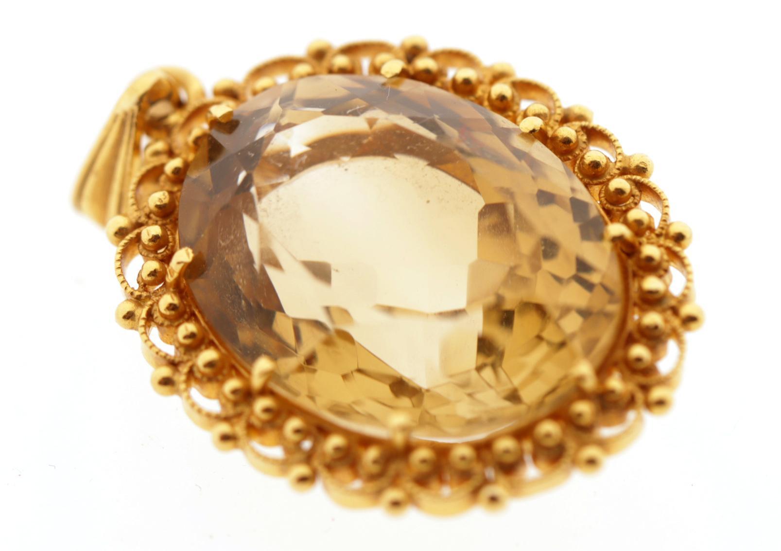 20 Kt. geelgouden hanger bezet met gefacetteerde citrien, totaalgewicht 16,9 gram