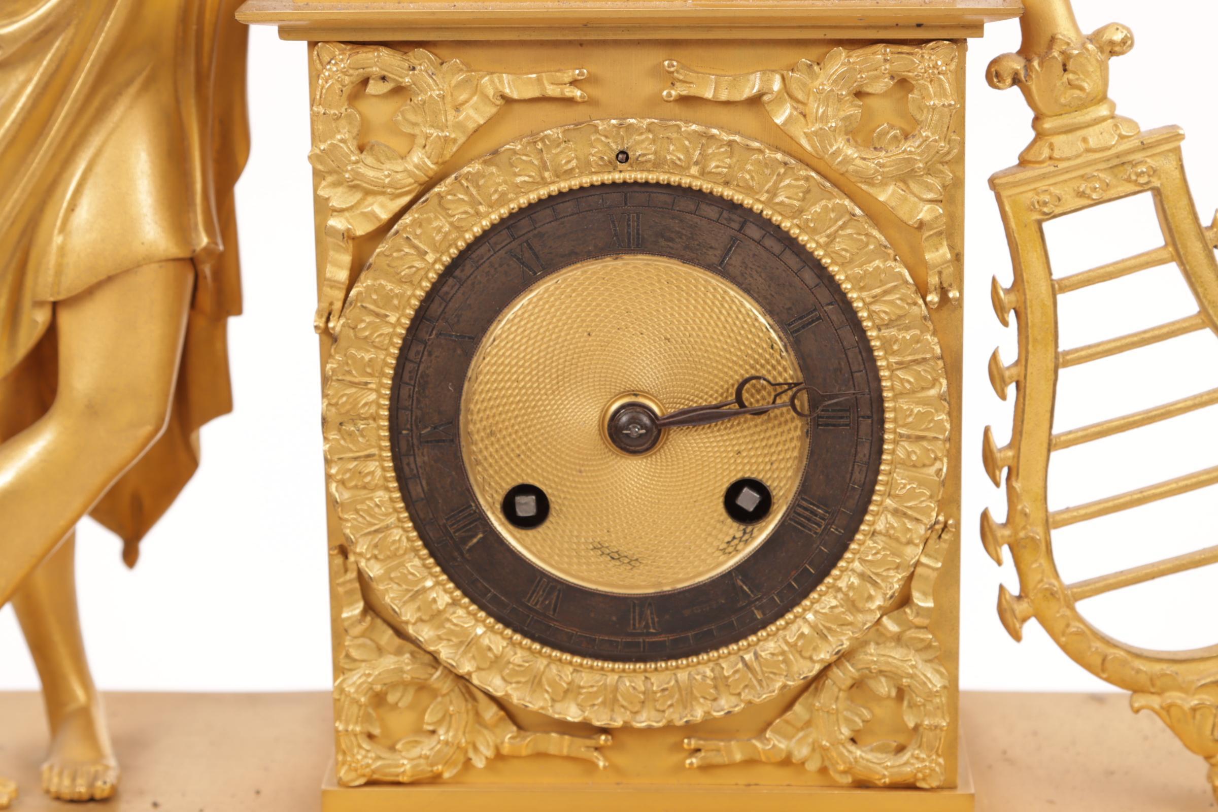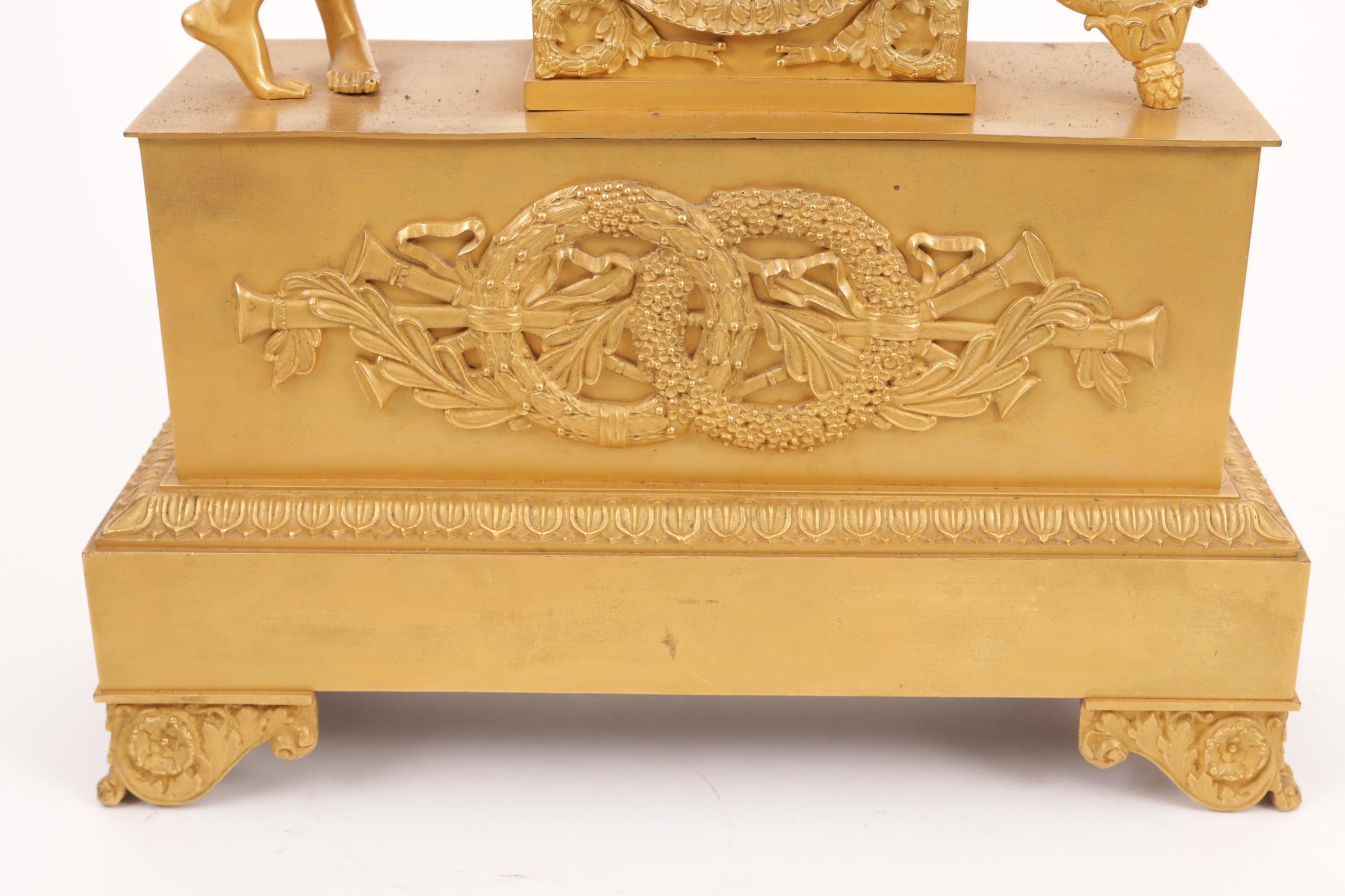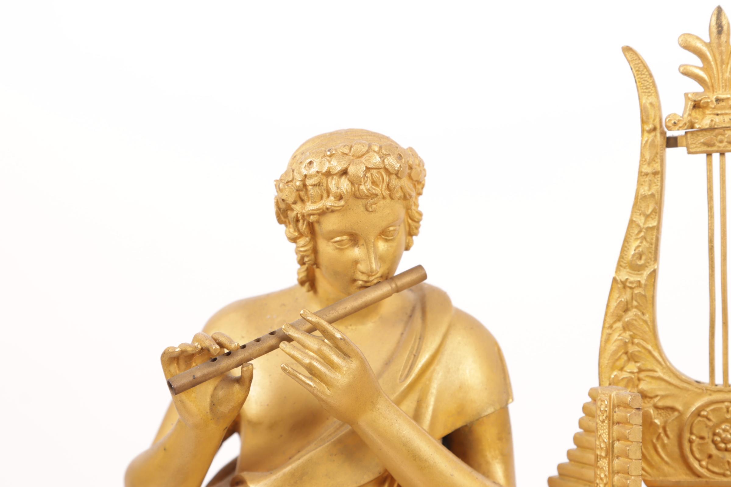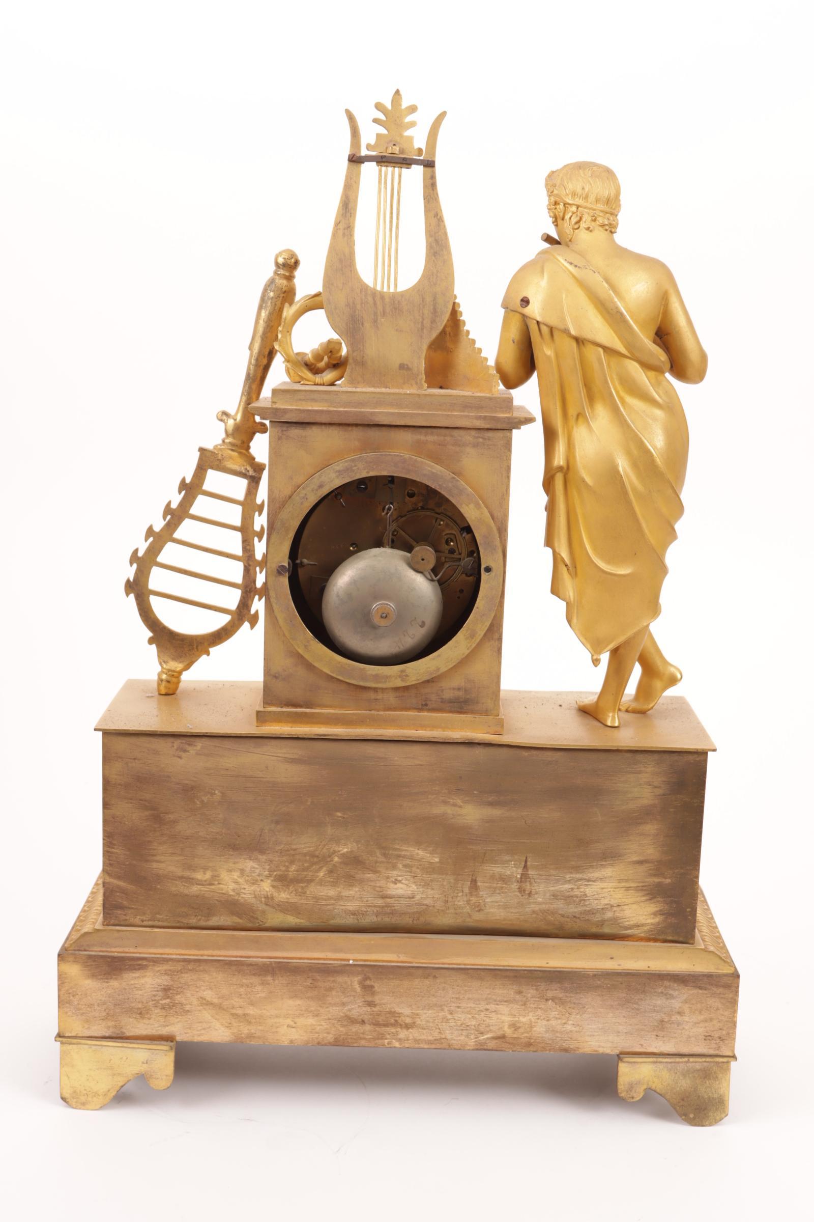 Vuurvergulde Franse Empire pendule met naast het uurwerk een fluitspelende man, h.47 cm.
