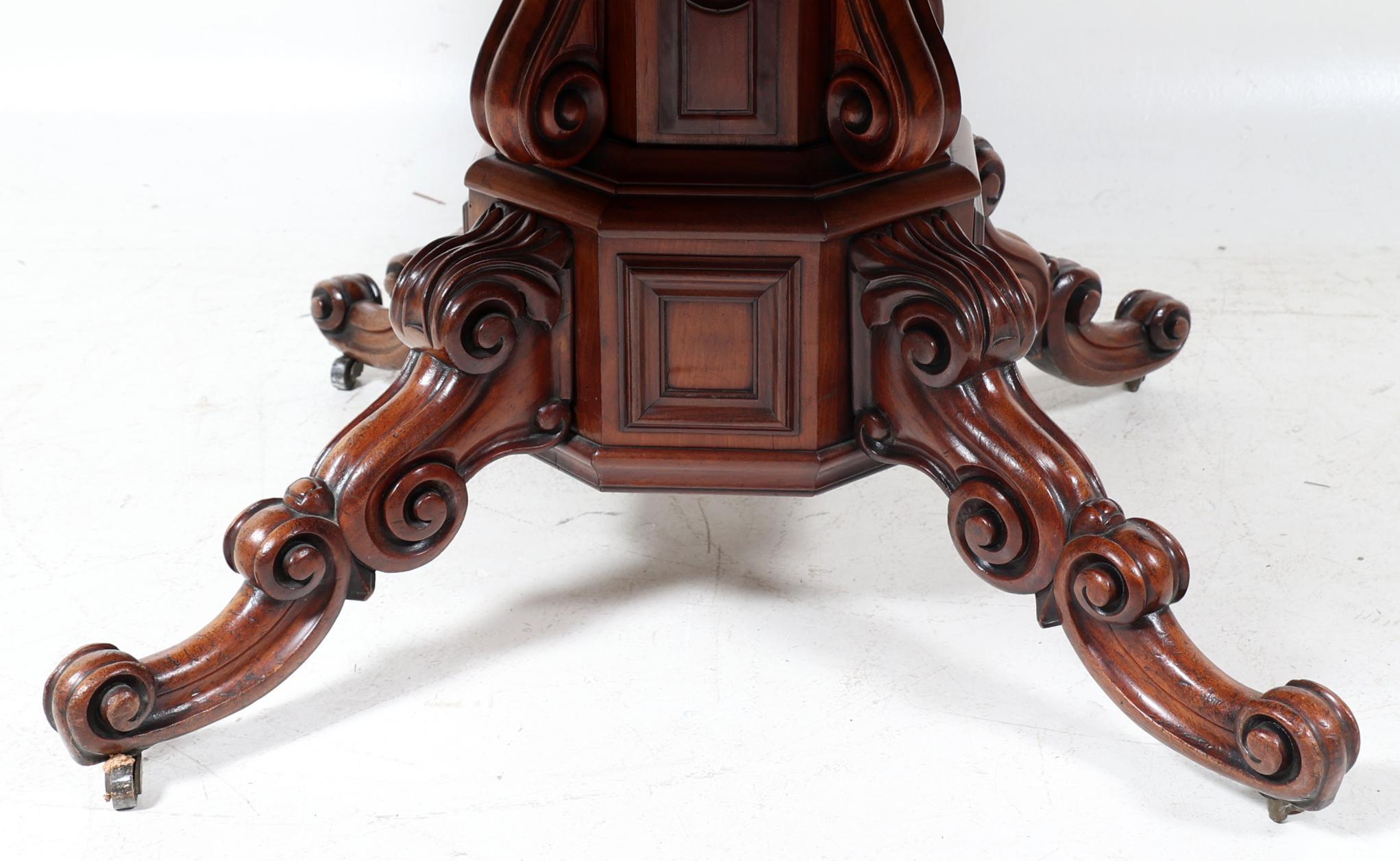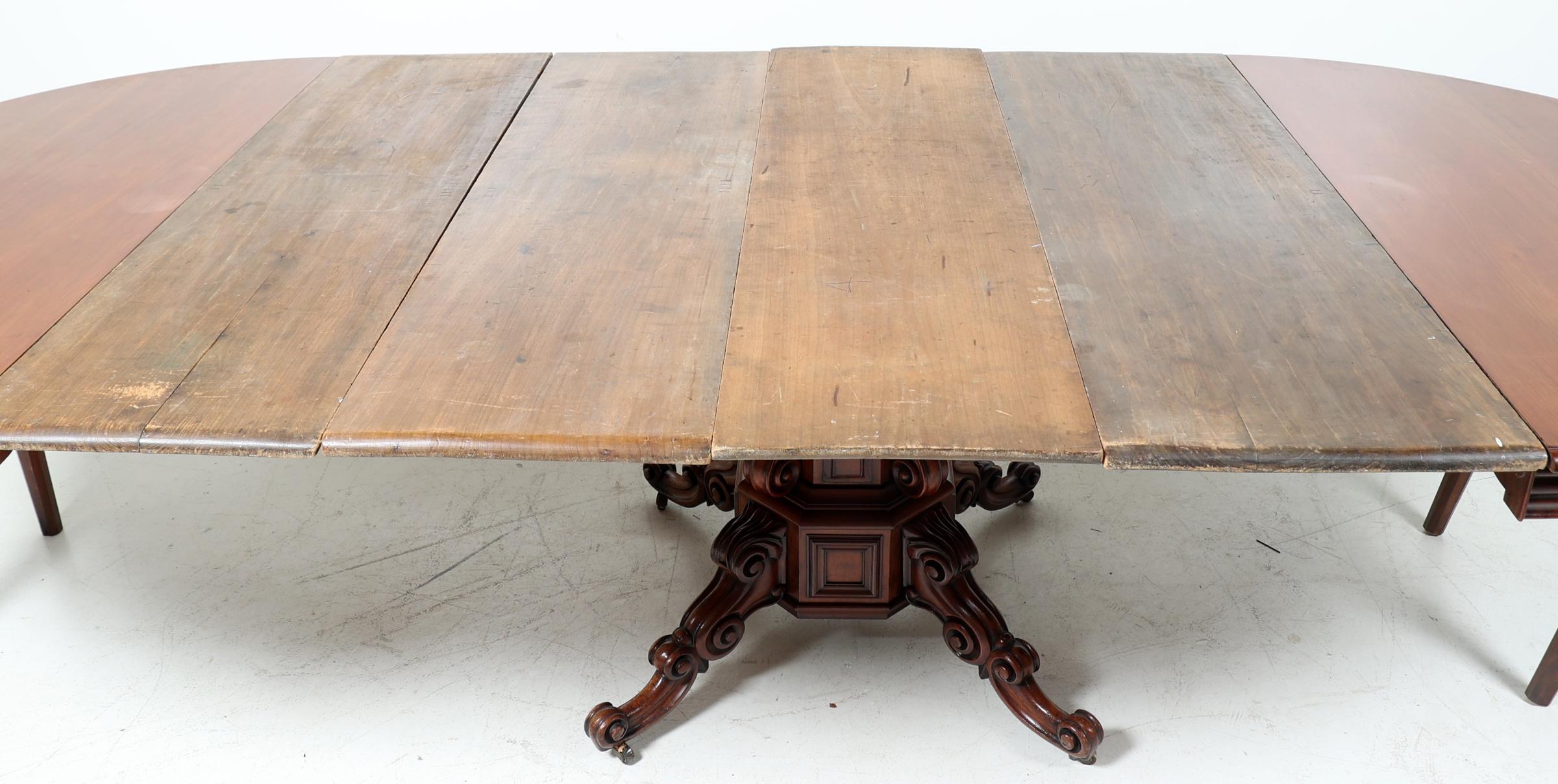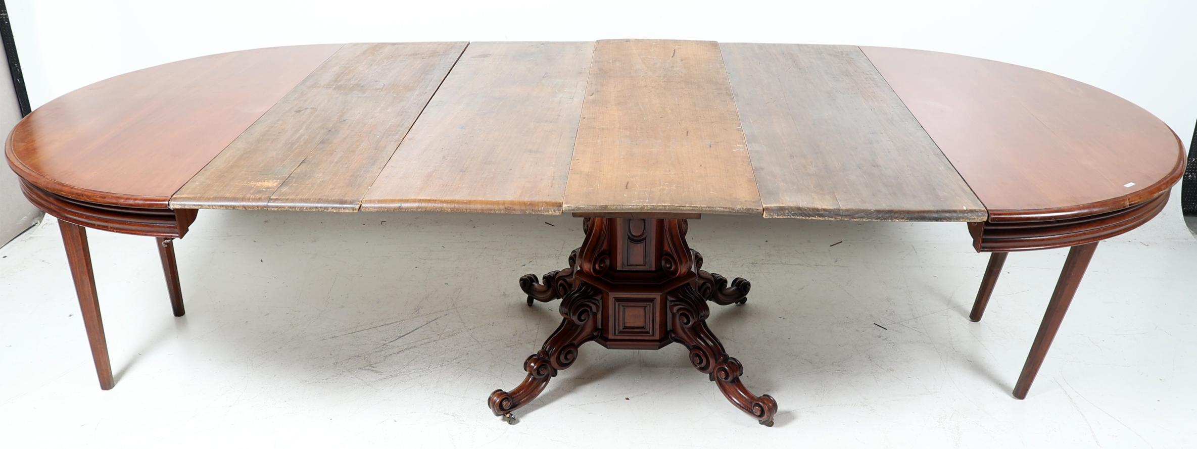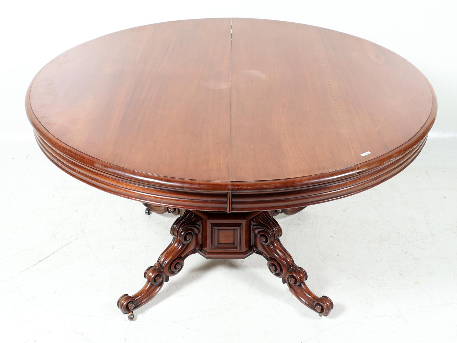 Antieke mahoniehouten coulissetafel met 4 aanvullende tussenbladen, h.80 x diam.140 cm. (verlengbaar met 1.25 cm.)