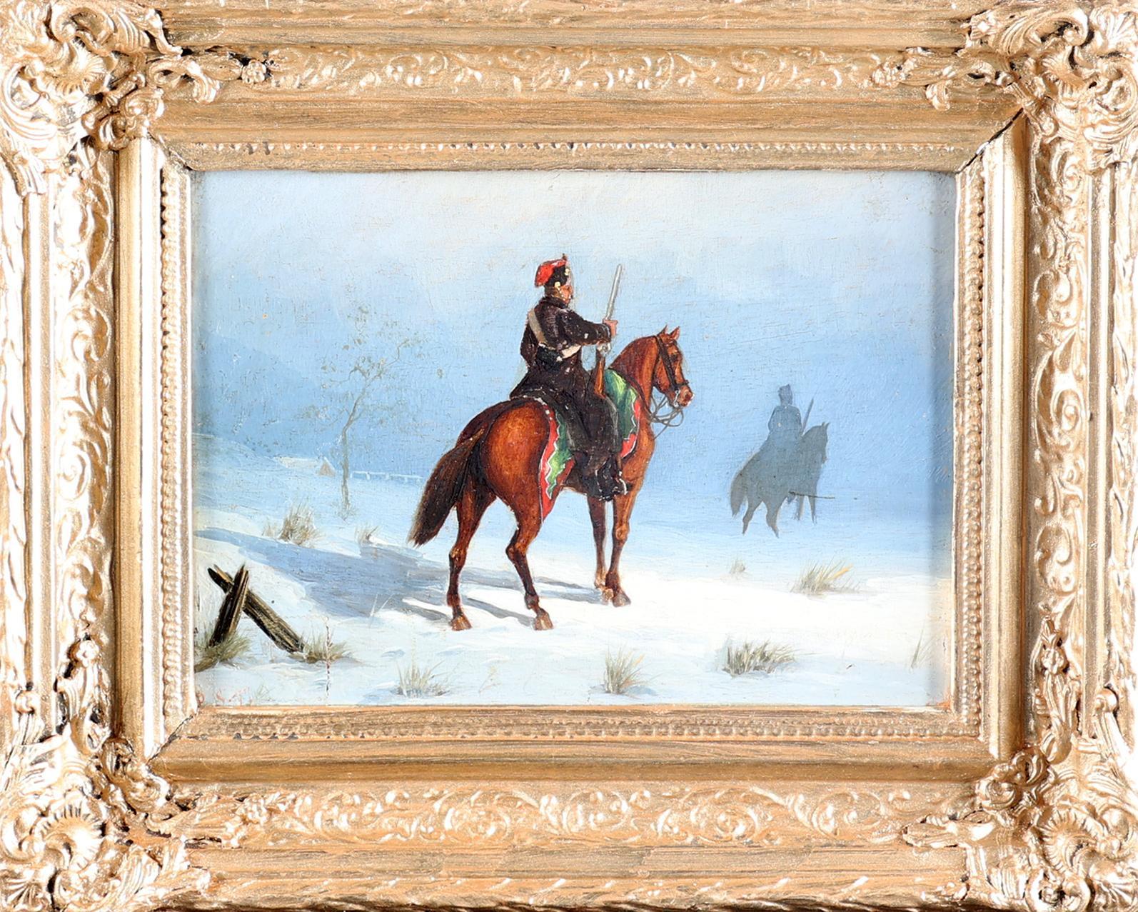 Toegeschreven aan Piet Schipperus (1840-1929), Cavaleristen in de winter, olieverf op paneel, 20 x 26 cm., monogram r.o.P.S.’77