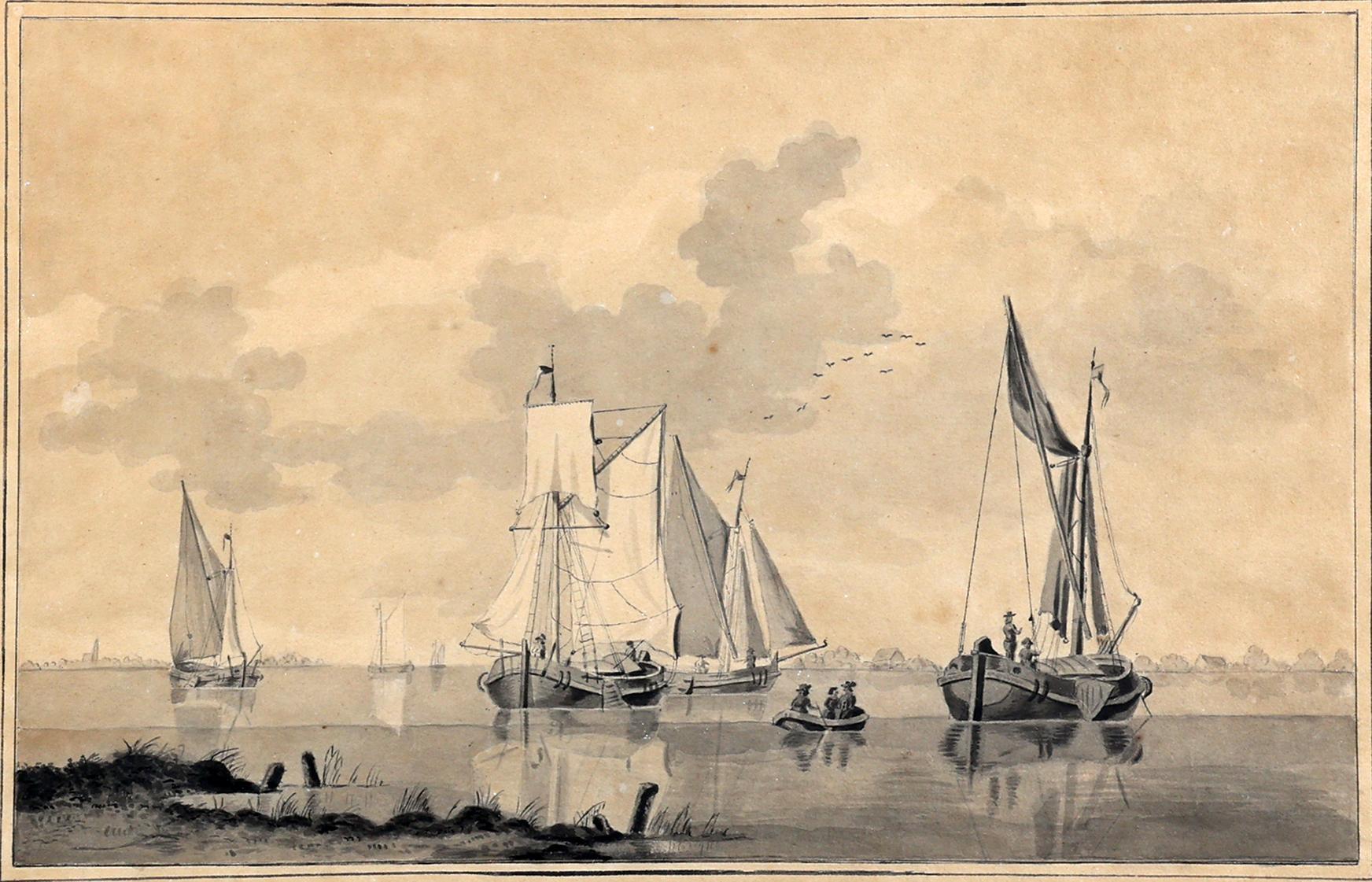 Toegeschreven aan A. Waldorp (1803-1866), Schepen voor de kust, sepia, 20 x 32 cm.