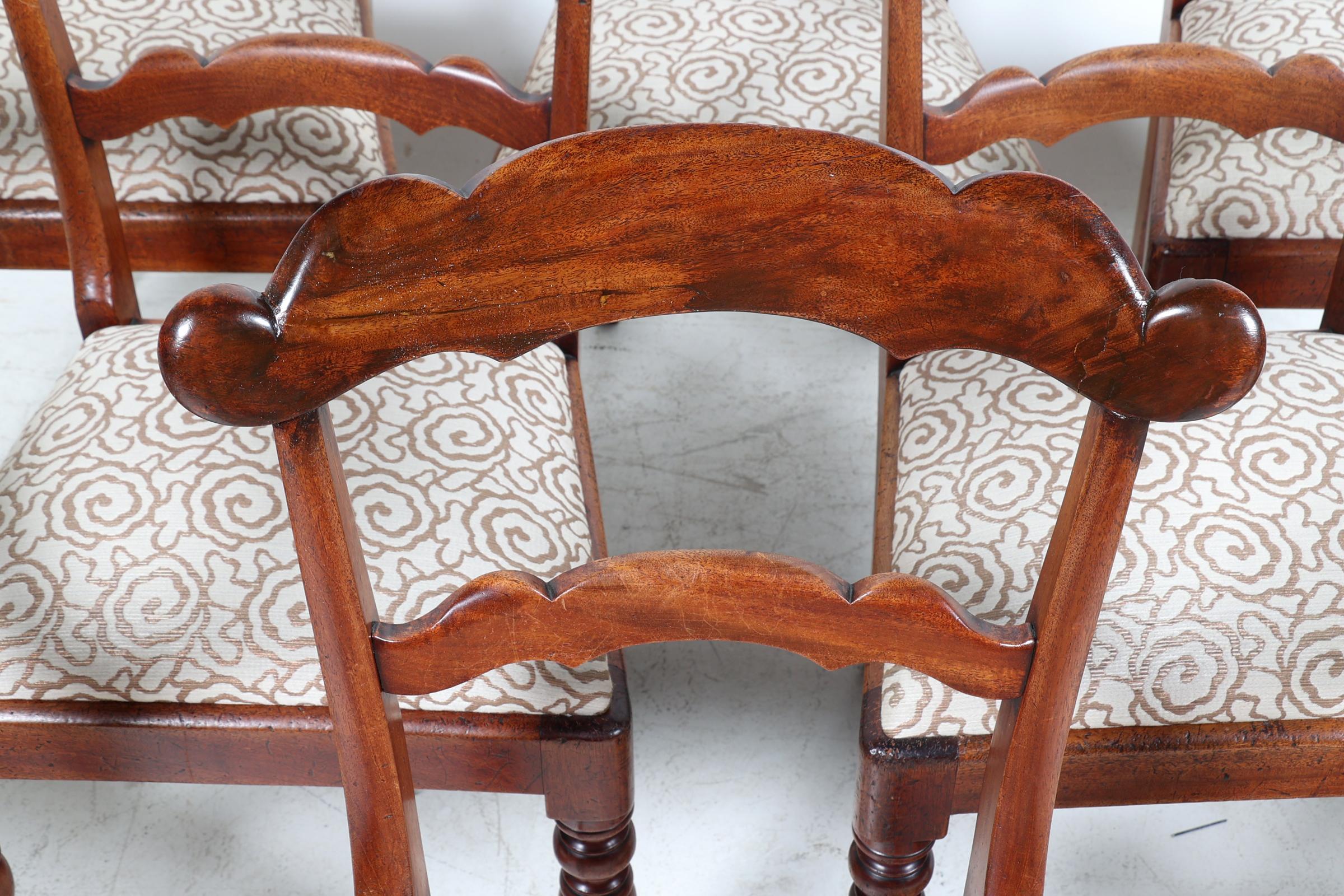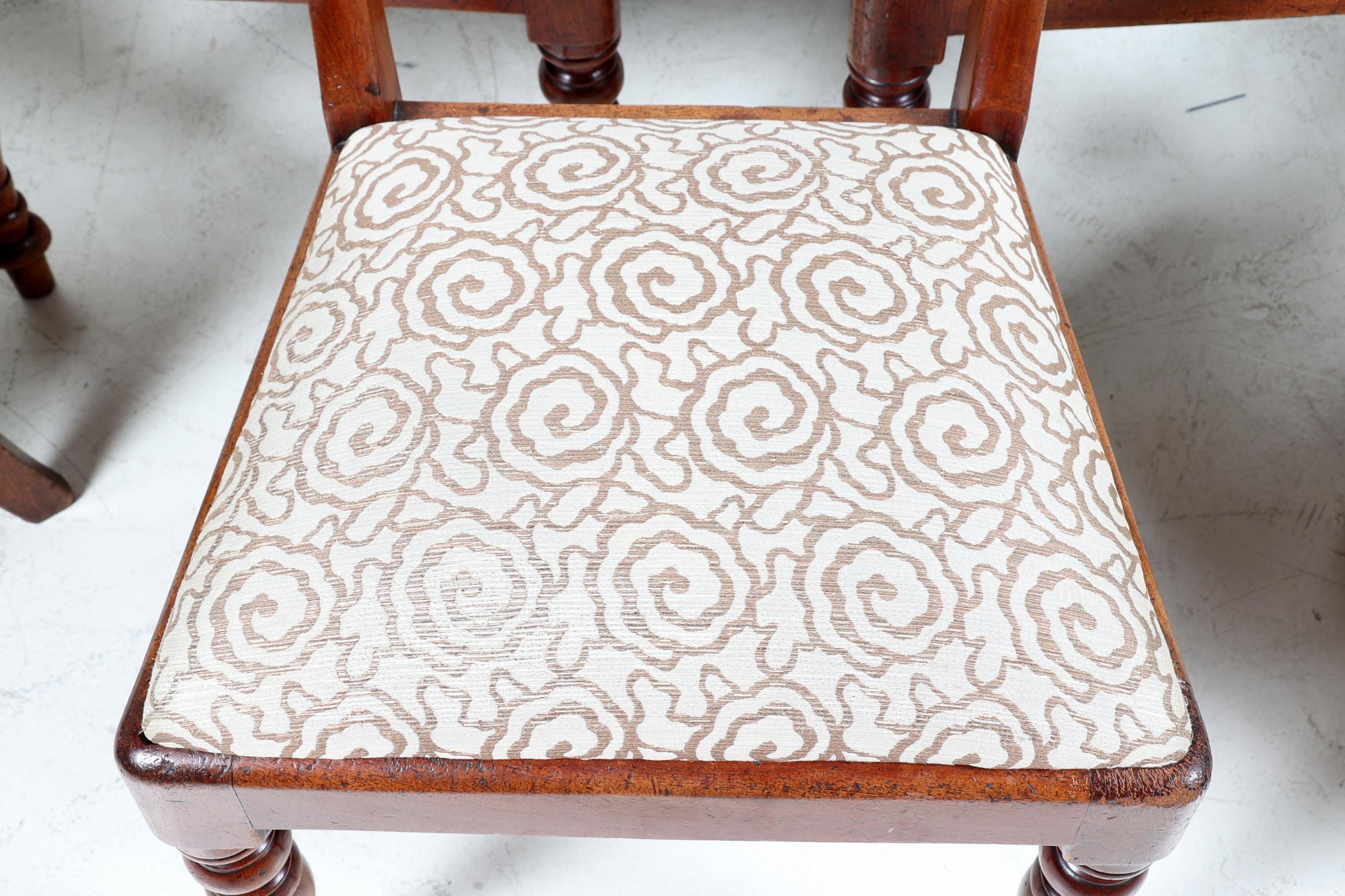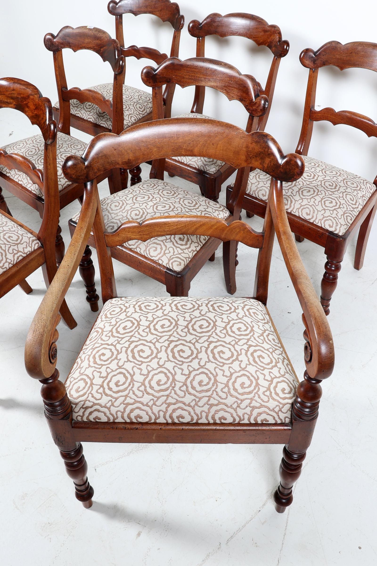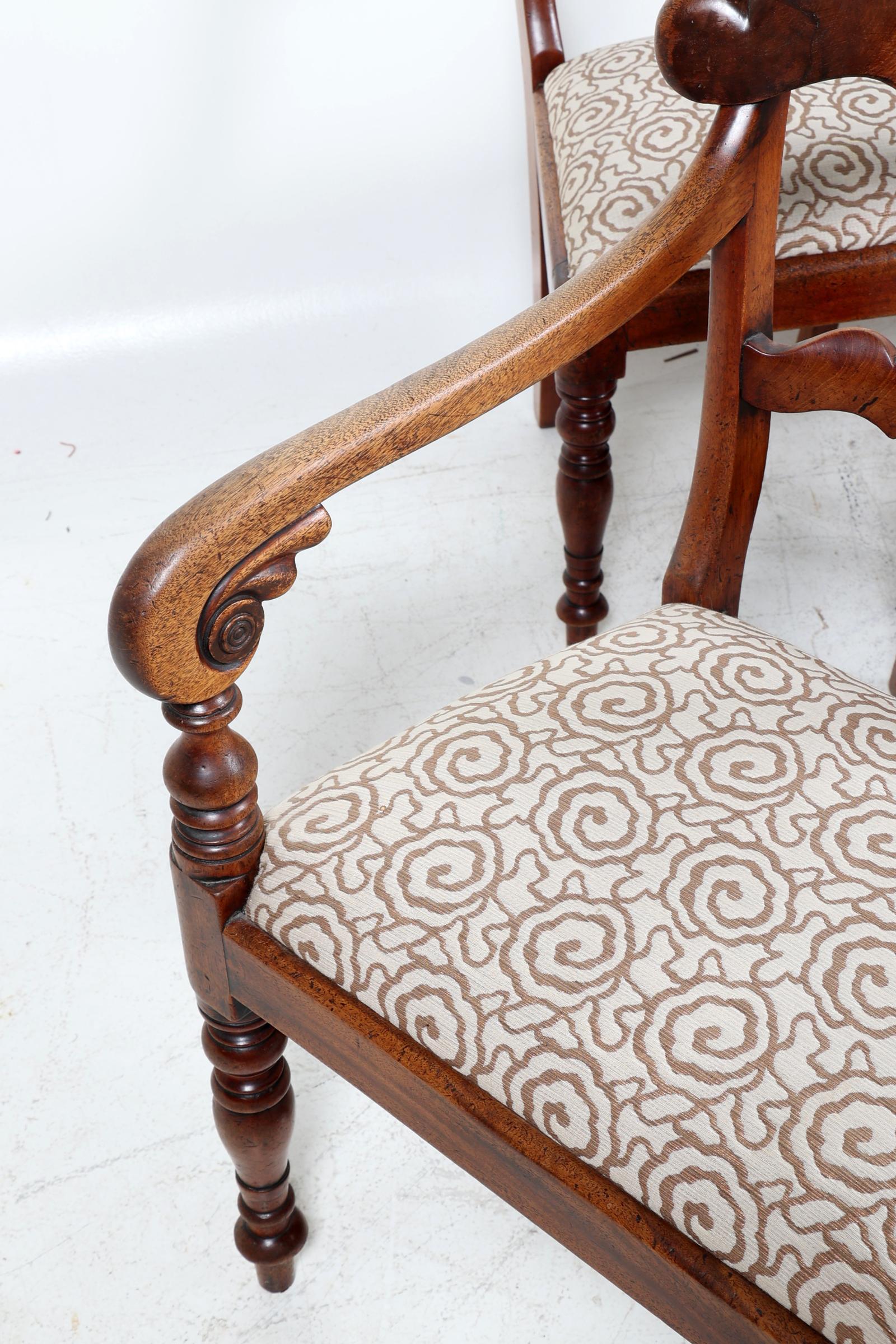 8 Antieke mahoniehouten eetkamerstoelen waarvan 2 met armleuning en met moderne stof bekleed