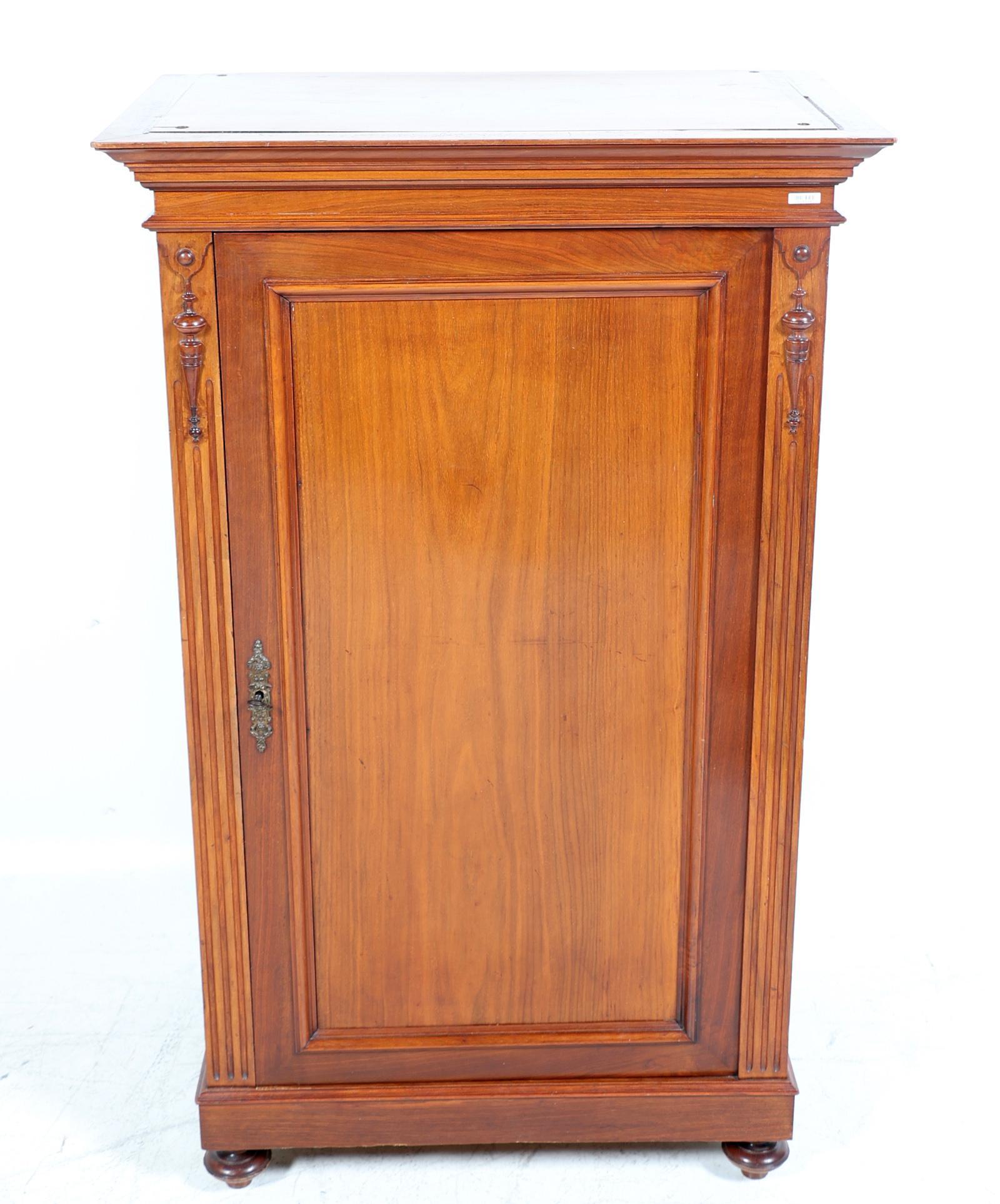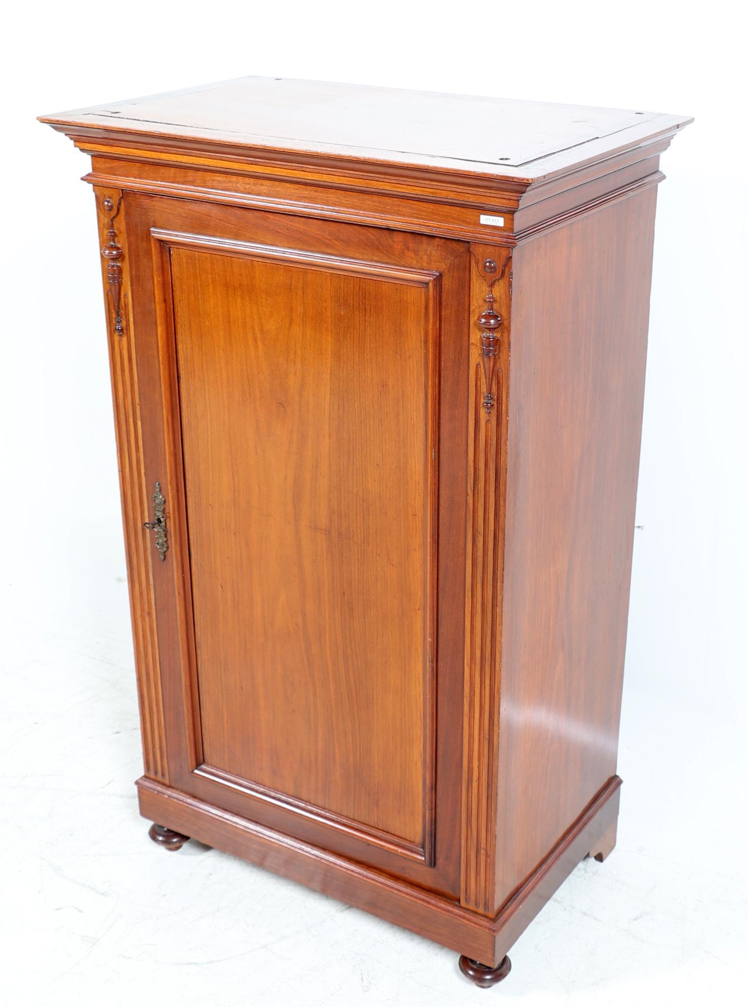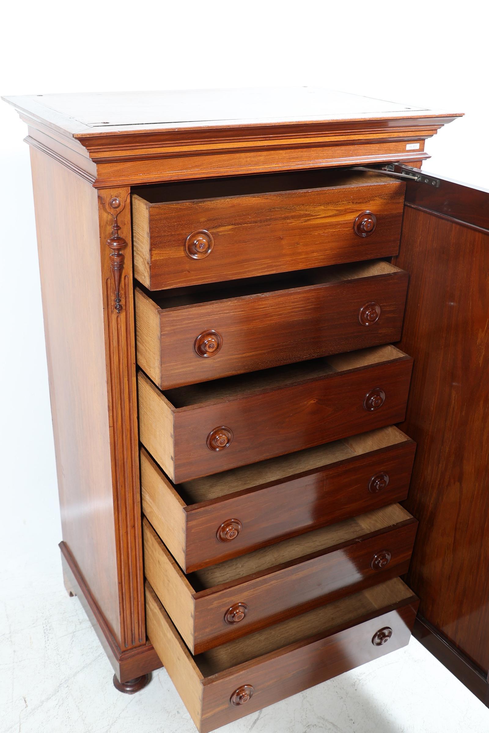 Antieke mahoniehouten 1-deurs kast met aan de binnenzijde 6 laden, rustend op bolpoten, h.130 x b.80 x d.50 cm.