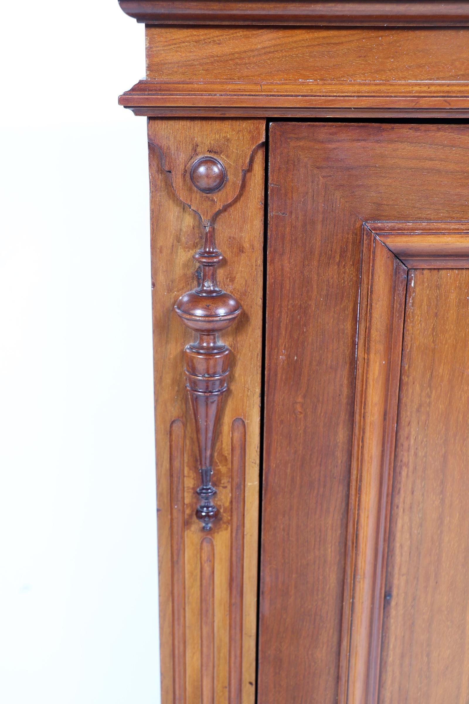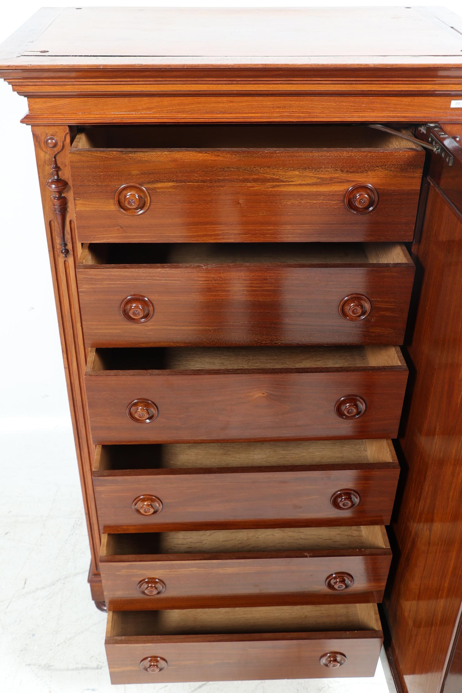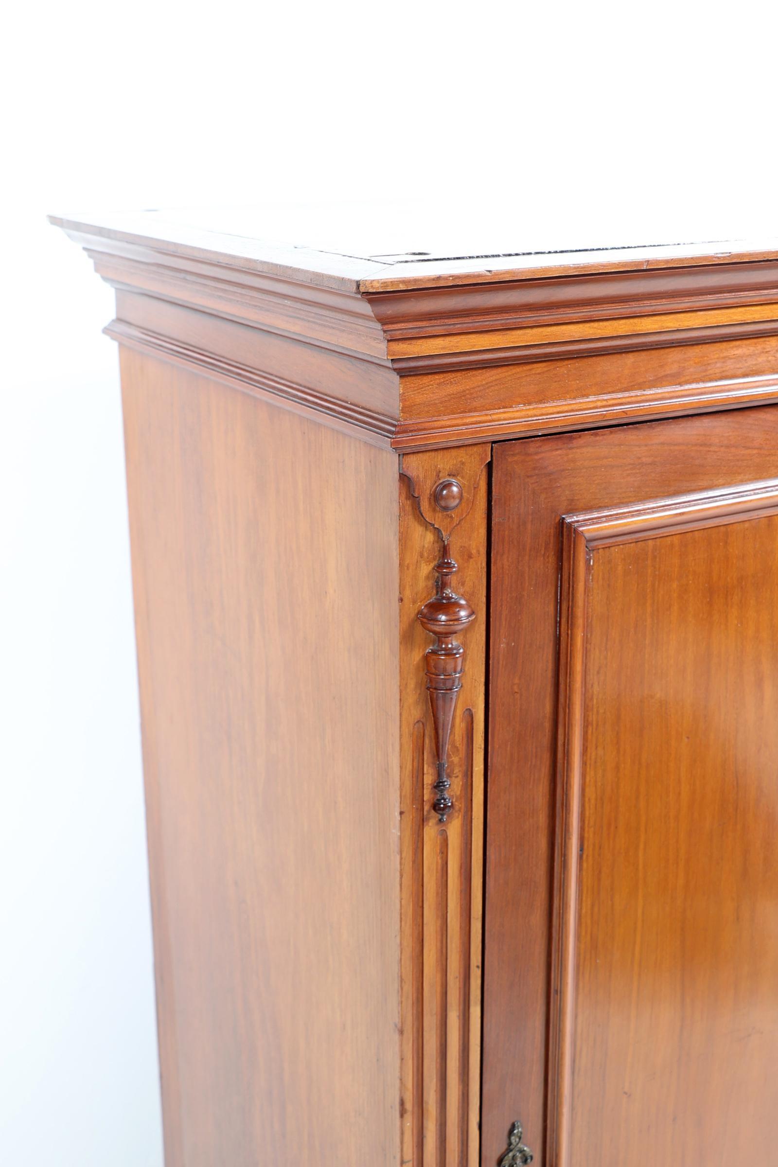 Antieke mahoniehouten 1-deurs kast met aan de binnenzijde 6 laden, rustend op bolpoten, h.130 x b.80 x d.50 cm.