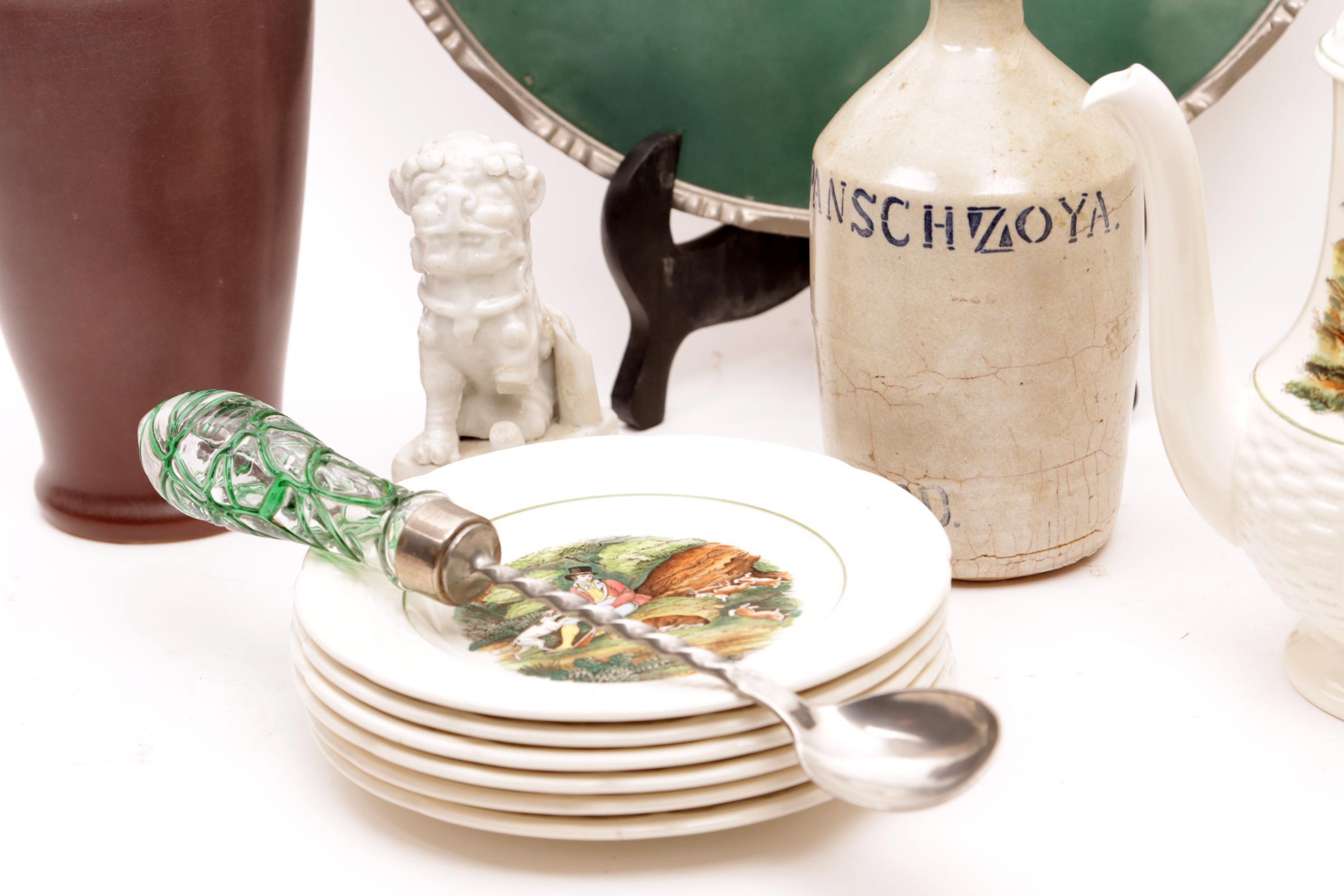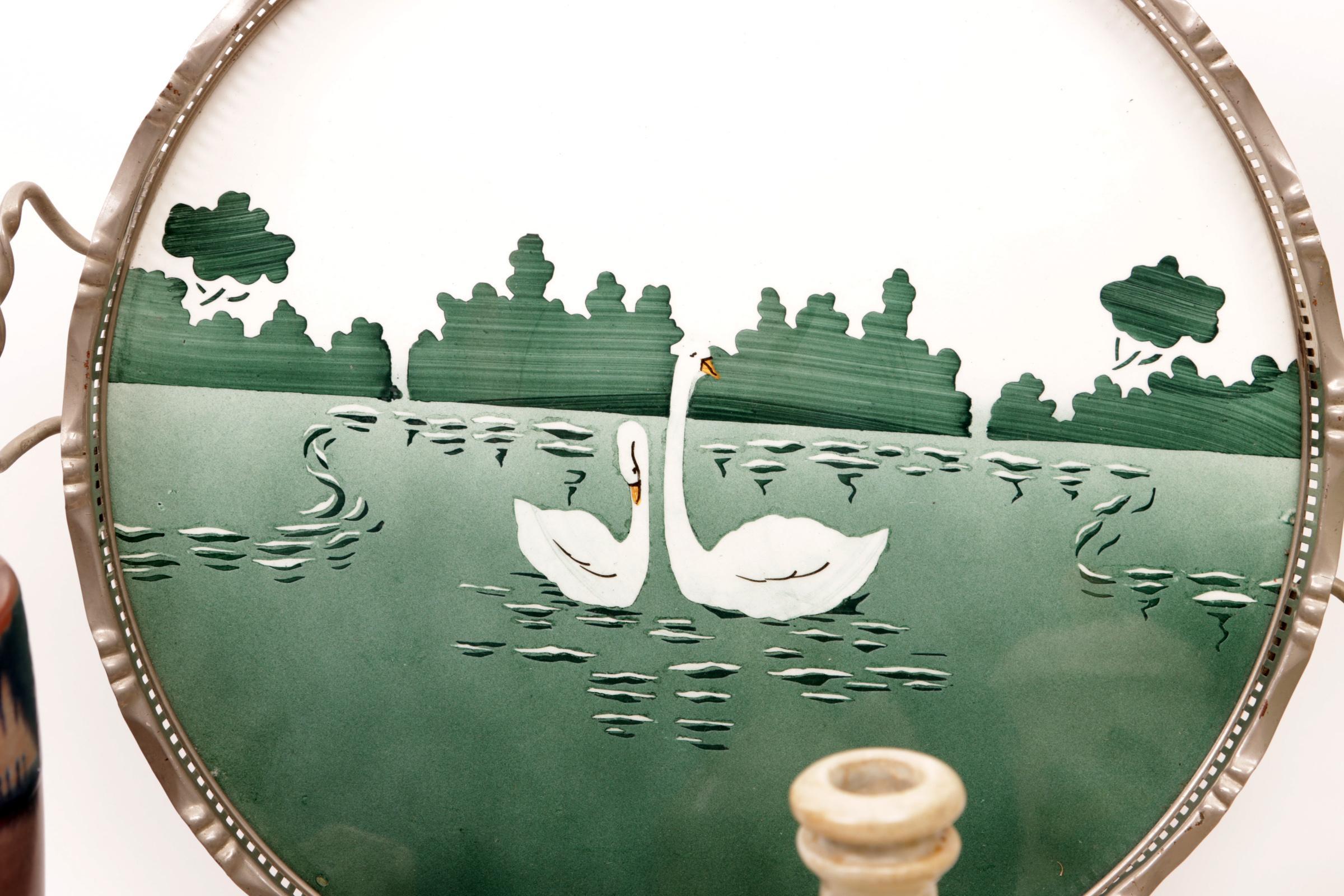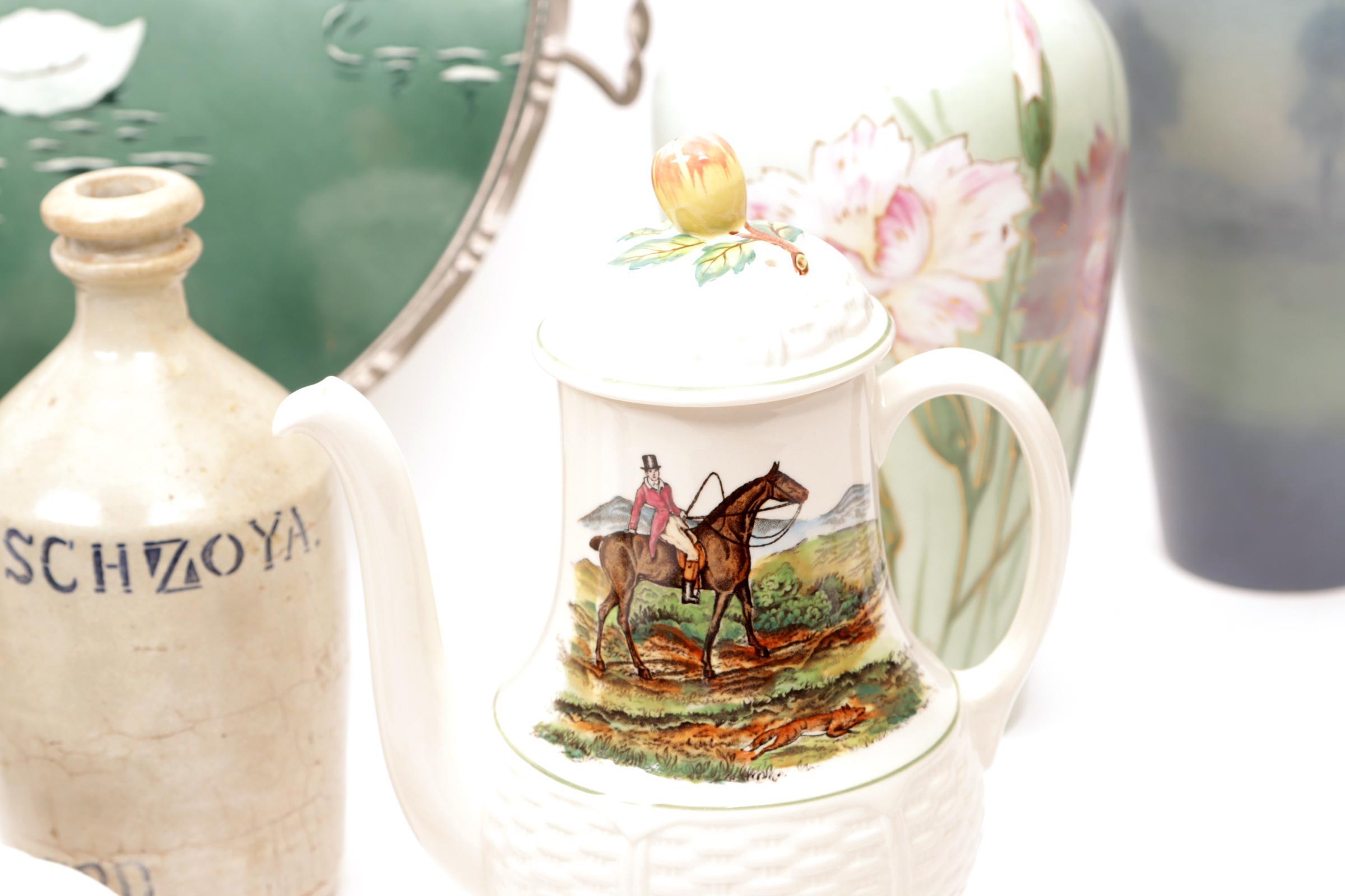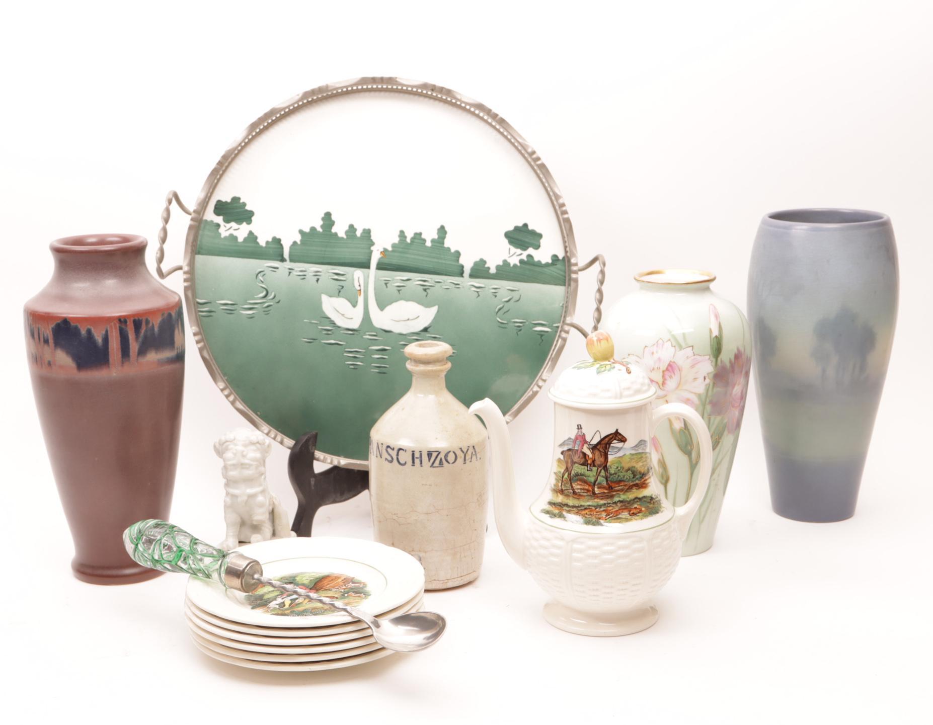 Koop van een aardewerken dienblad met zwanendecoraties, diverse porseleinen vazen, Wedgwood koffiekan met schoteltjes, etc.