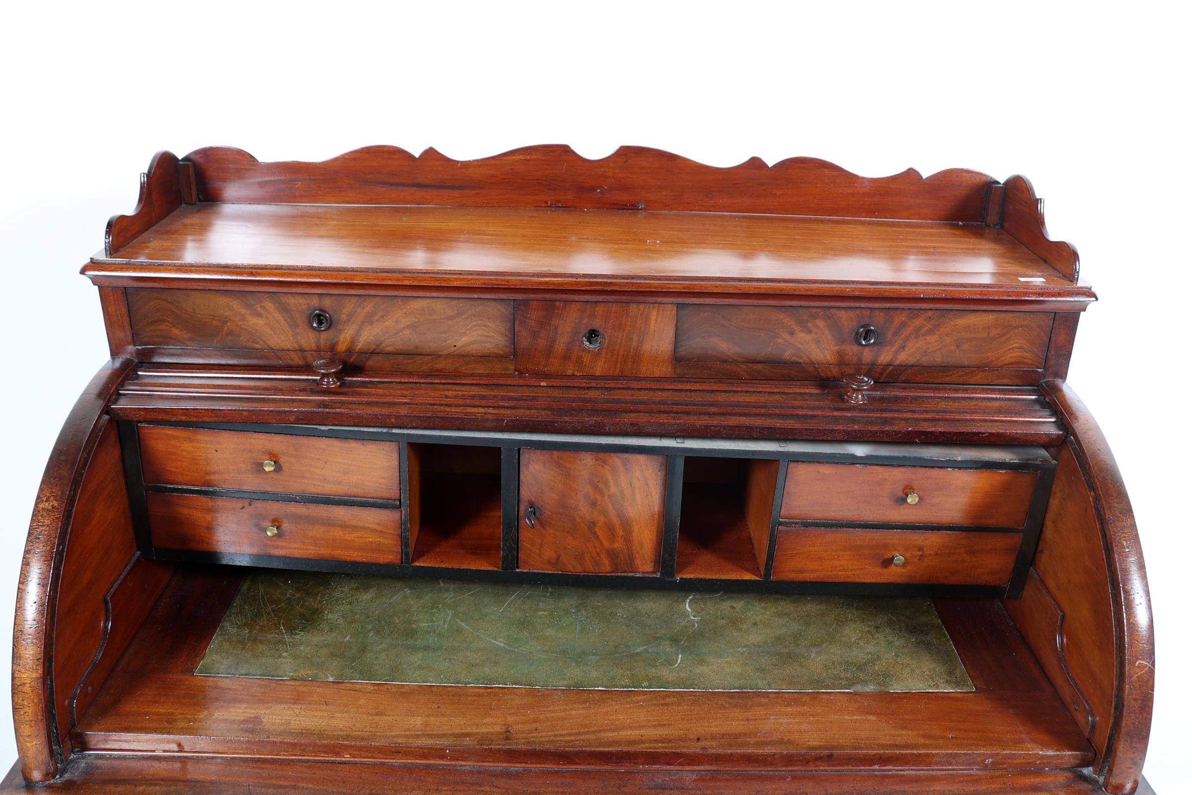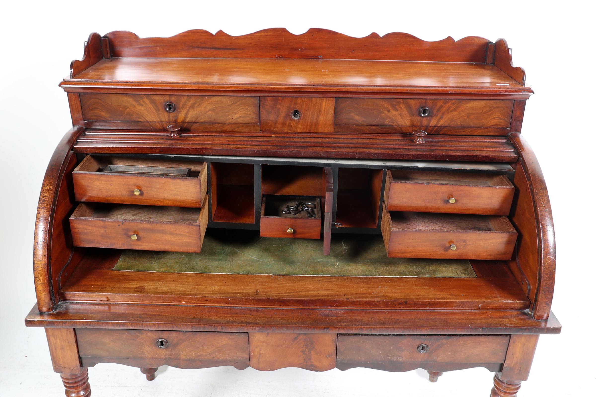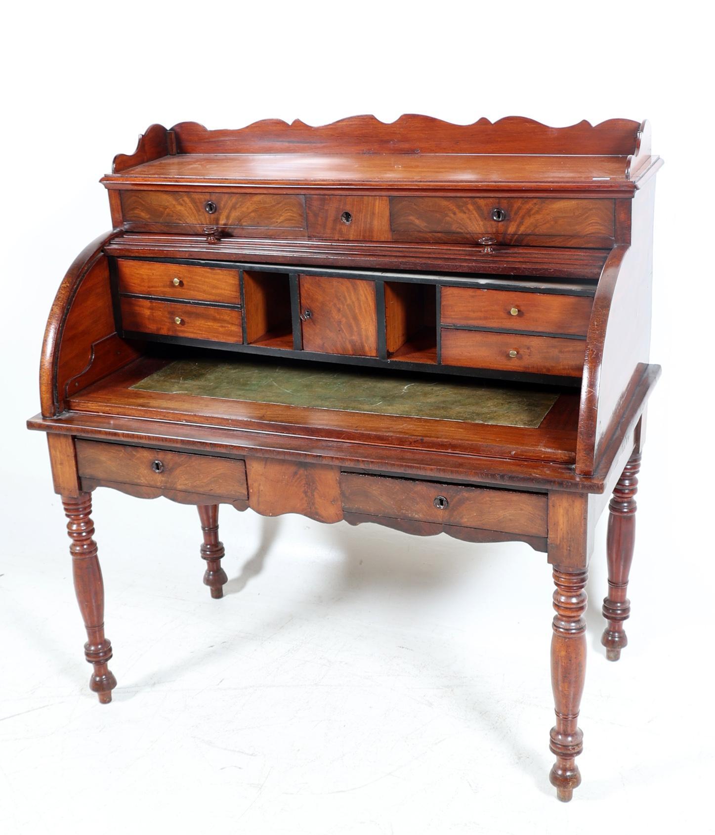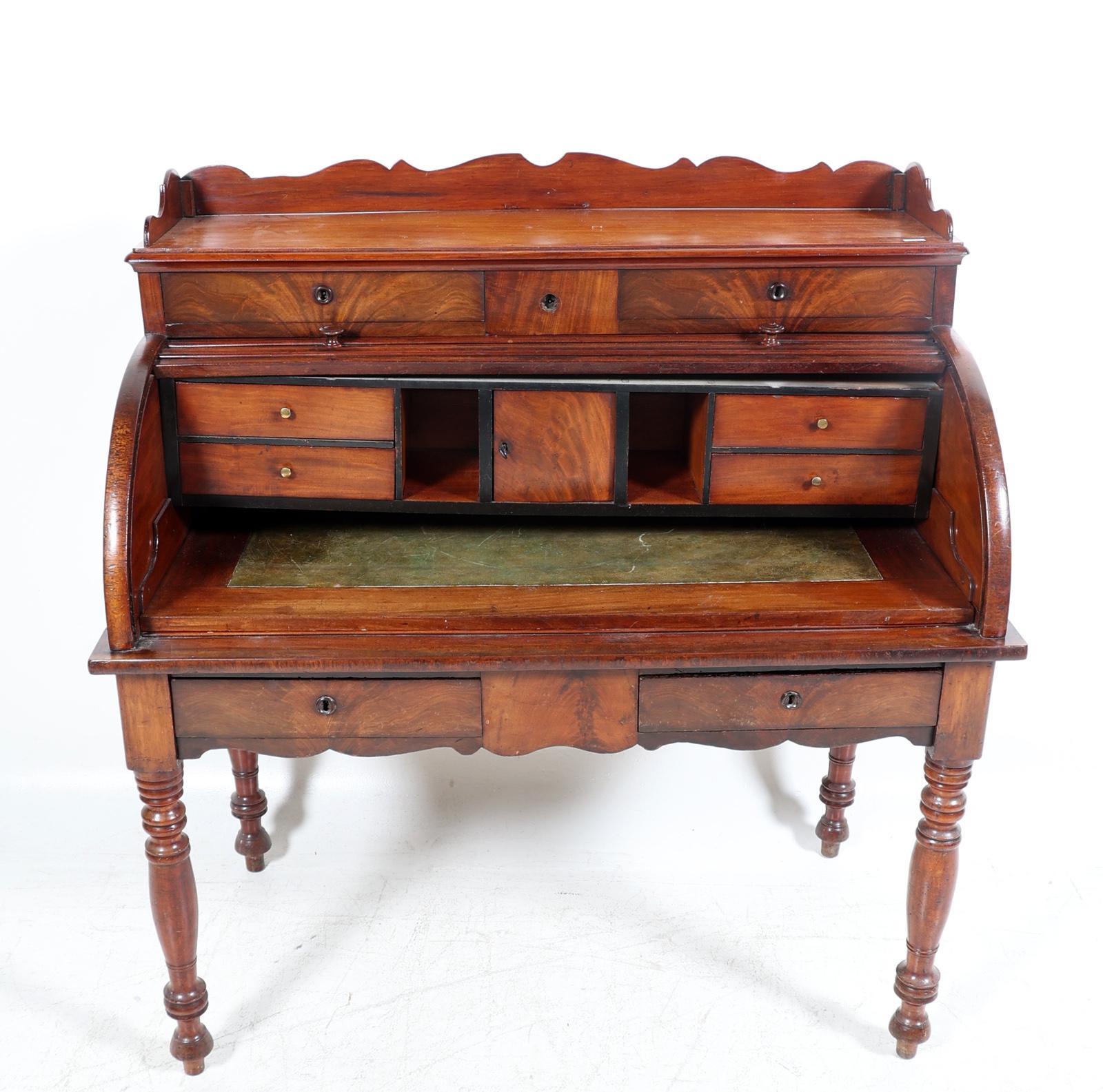 Antiek mahoniehouten Biedermeier rolluik bureau, h.130 x b.125 x d.68 cm. (rolluik zit vast)