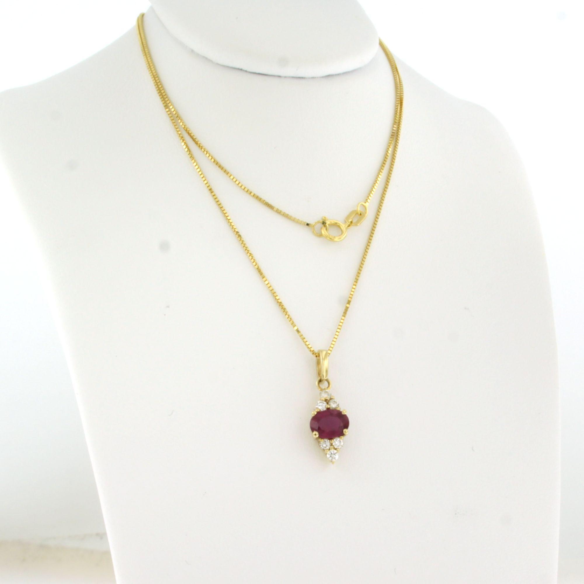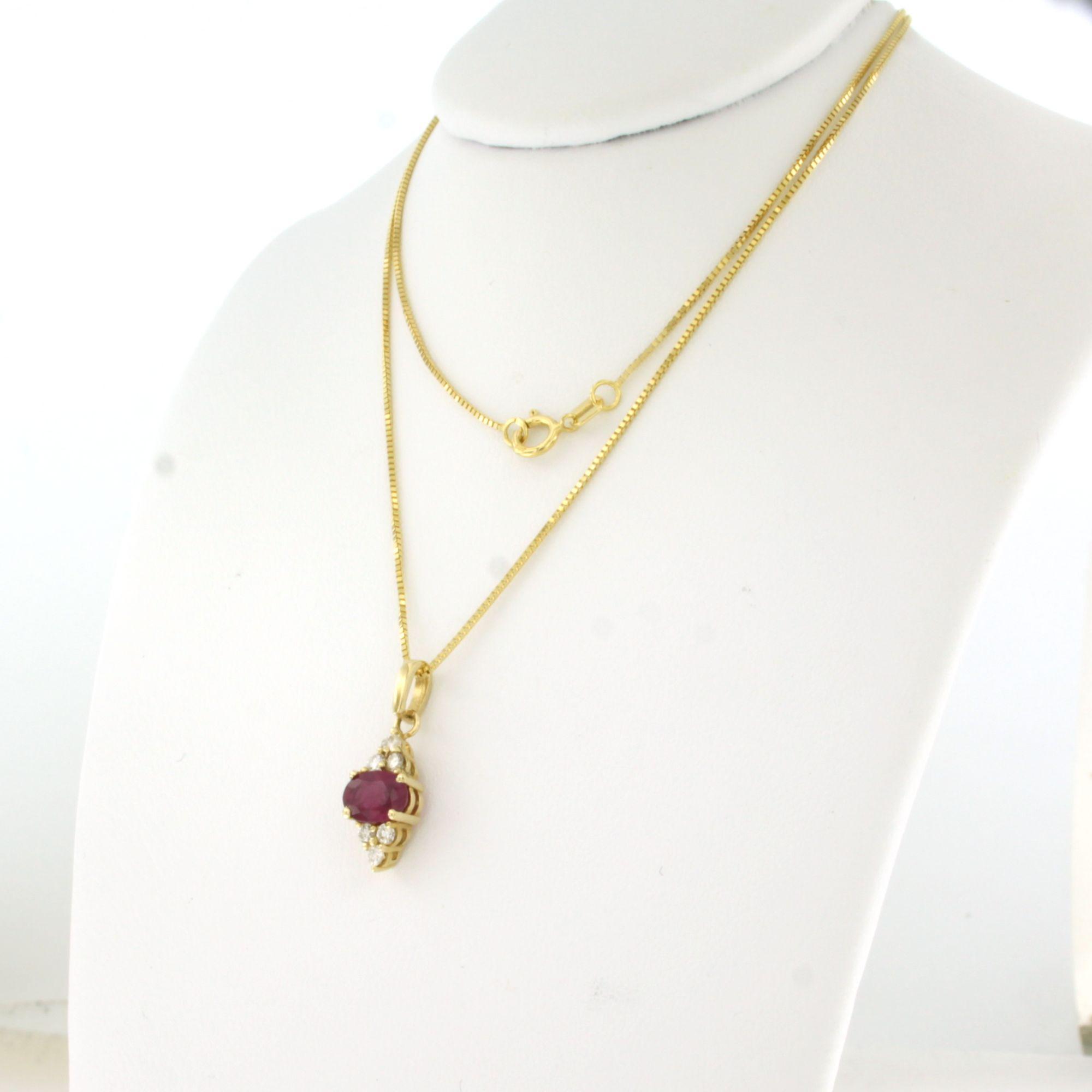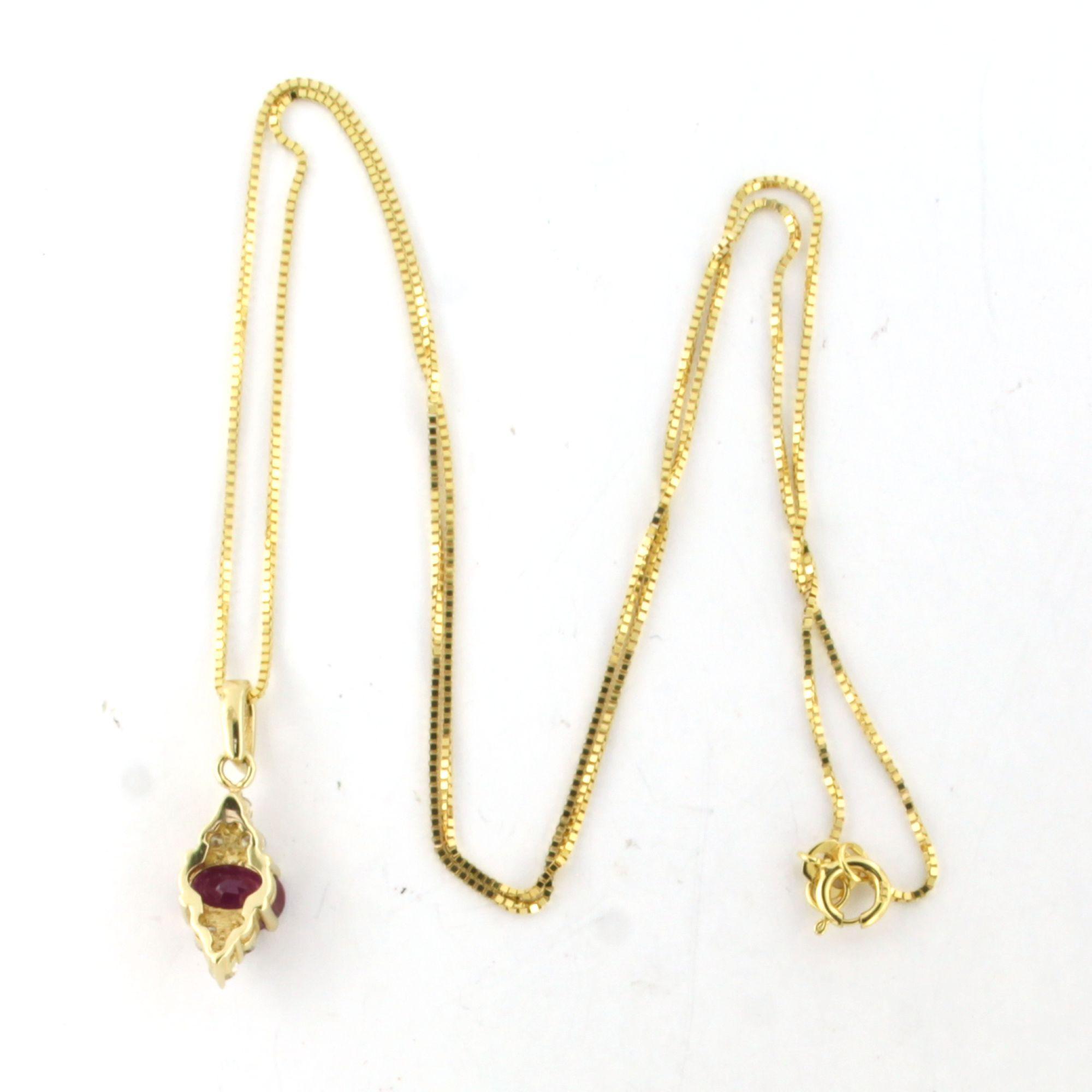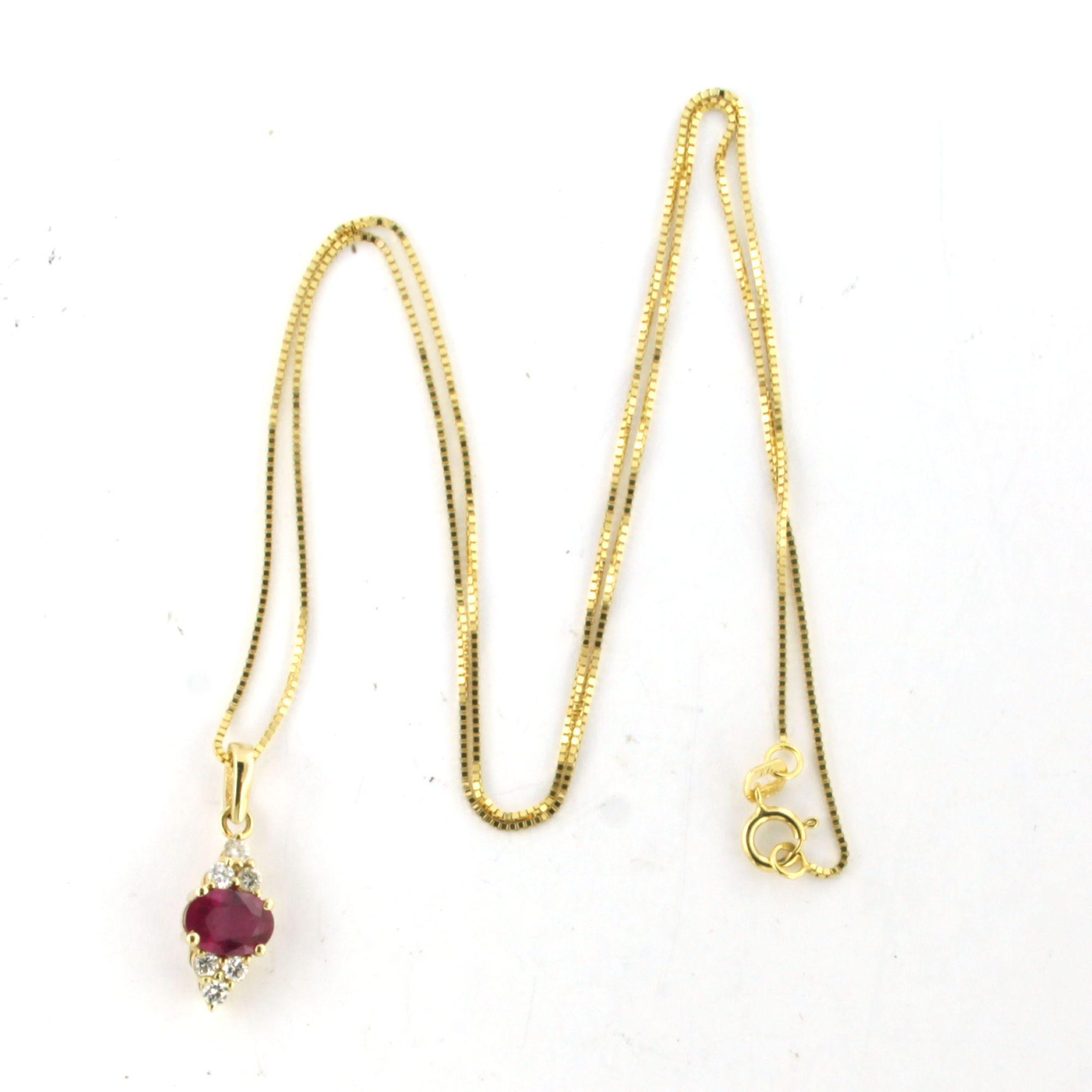 14 Kt. geelgouden collier met hanger bezet met robijn 1.00 ct en briljant geslepen diamanten tot. 0.20 ct G/H VS/SI. 44 cm lang