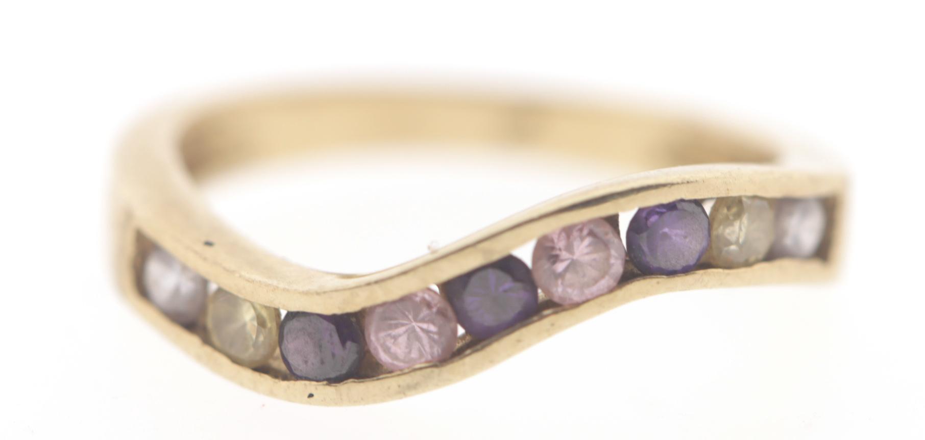14 Kt. gouden damesring bezet met kleurstenen, diam.18 mm.