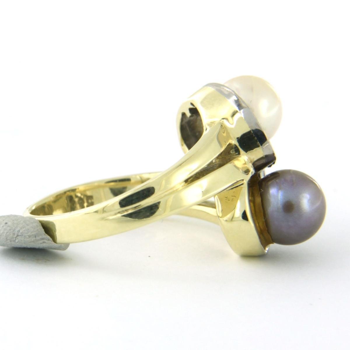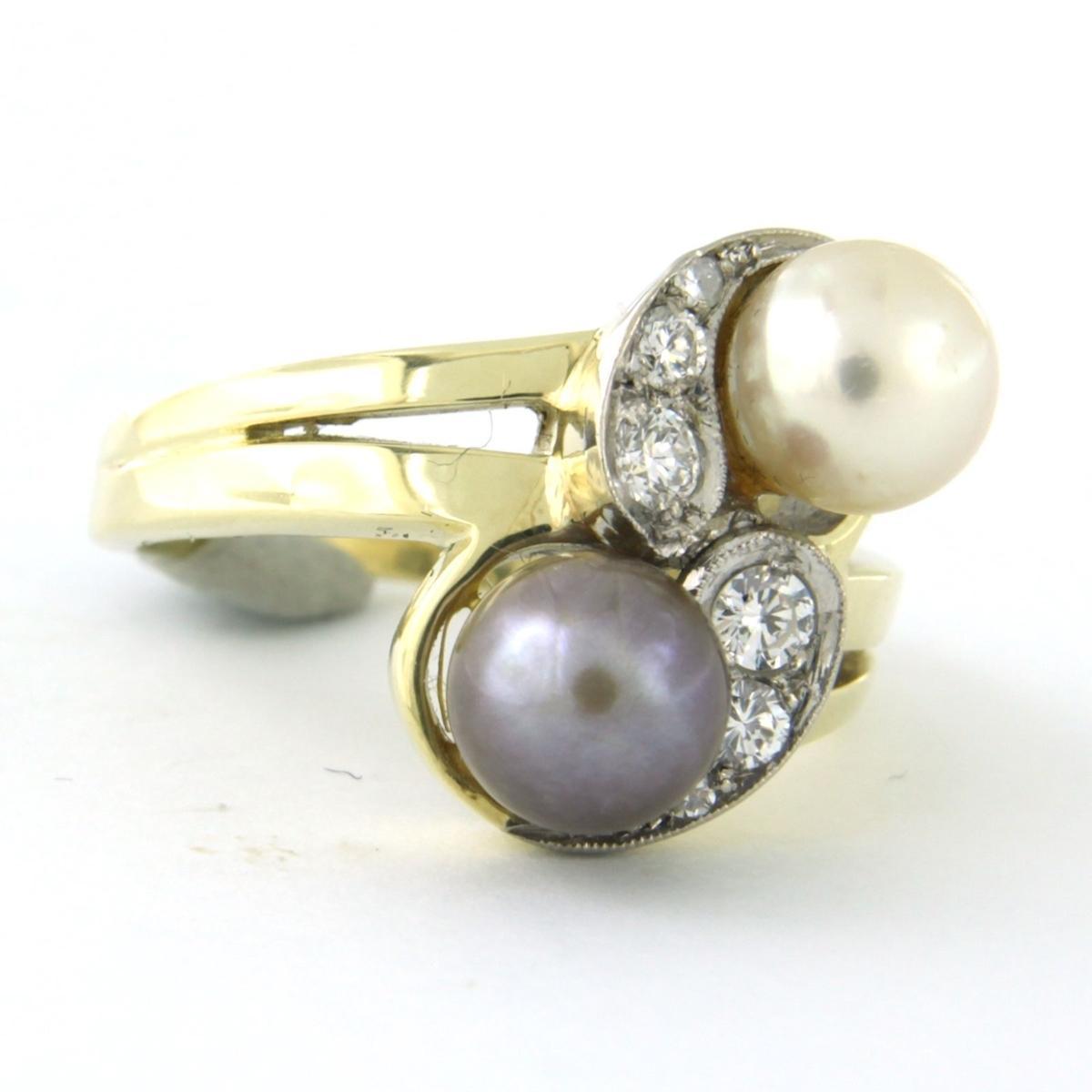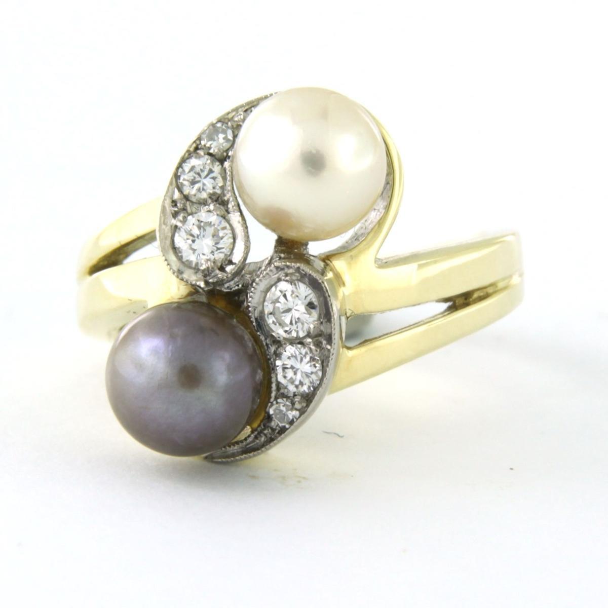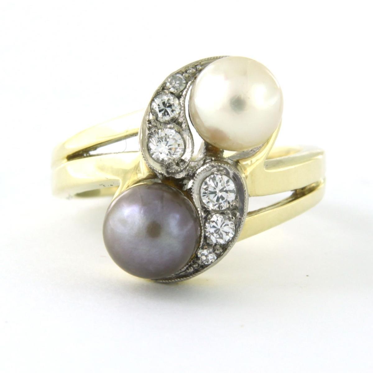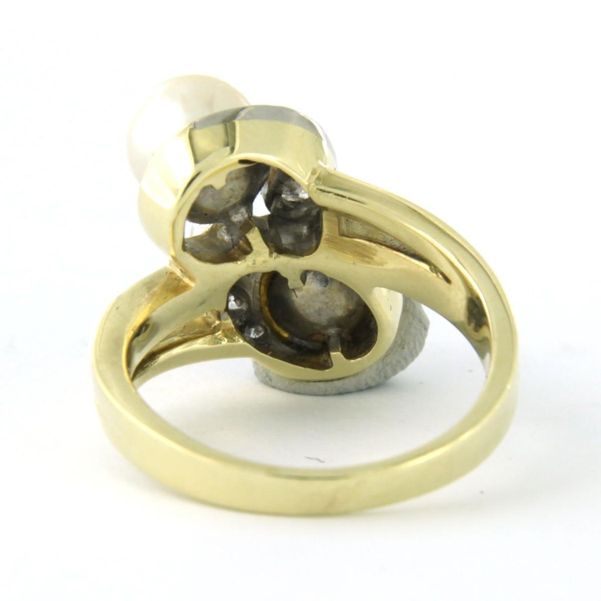 14 Kt. bicolor gouden slagring bezet met parels en briljant en single cut geslepen diamant 0.18ct - F/G - VS/SI - ringmaat 16 (50)