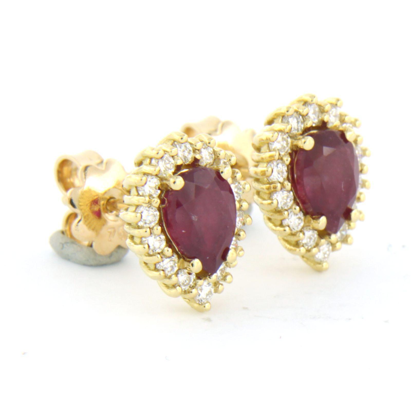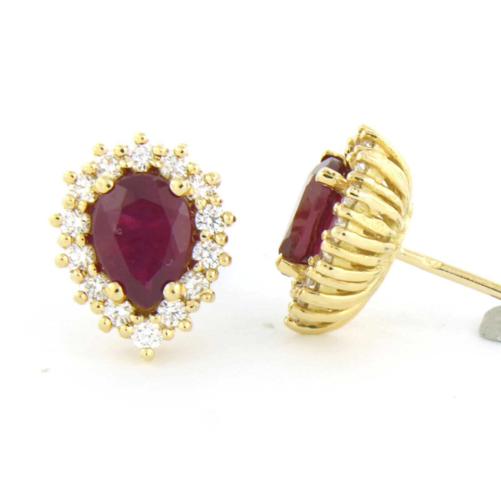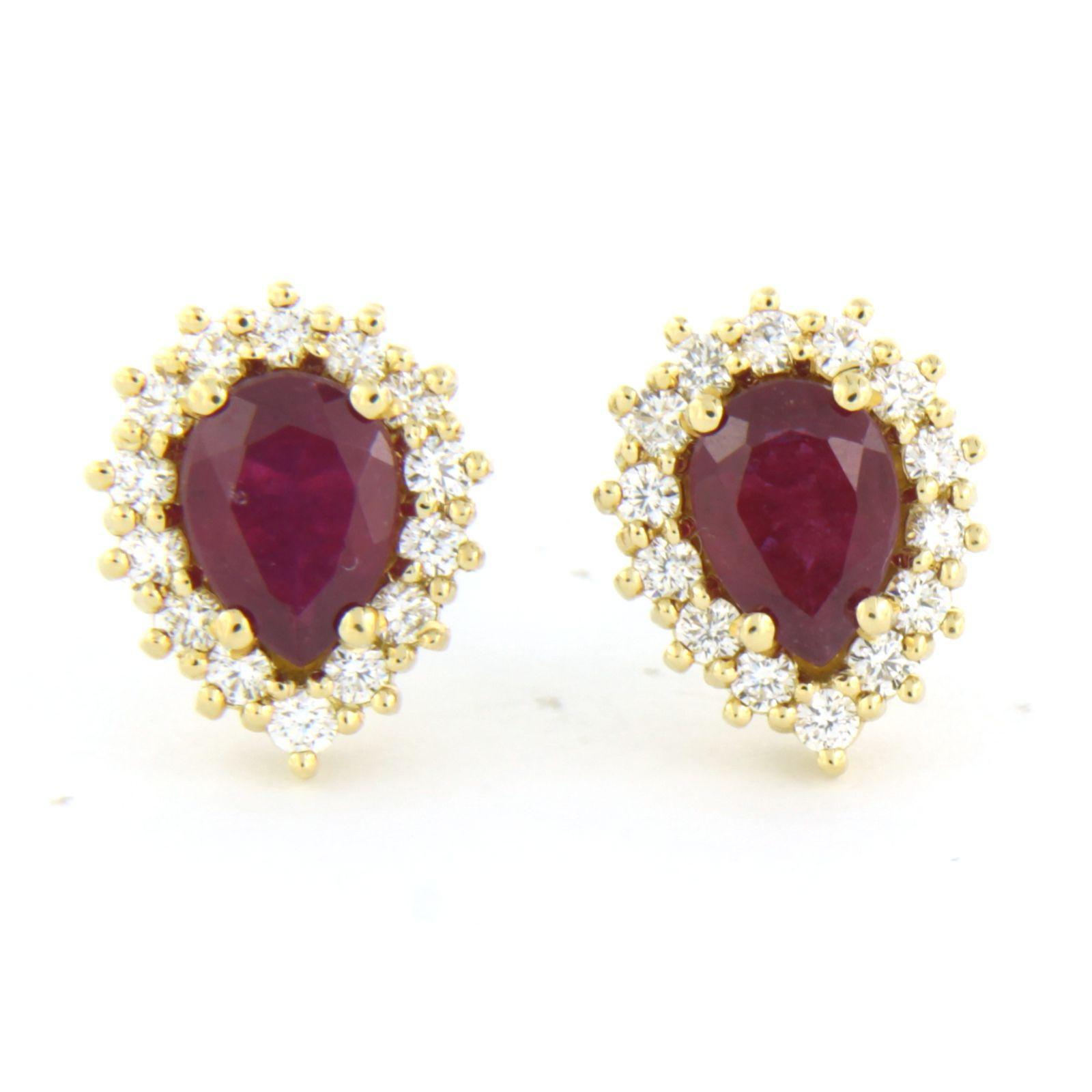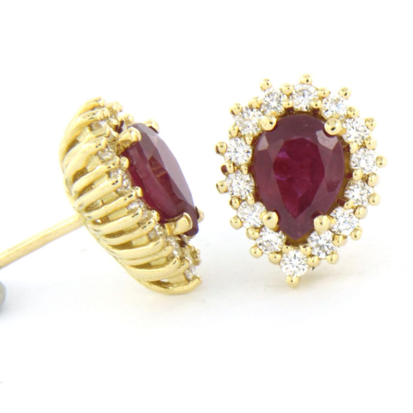 18 Kt. geelgouden entourage oorknoppen bezet met robijn tot. 1,80ct en aan entourage briljant geslepen diamant tot 0,50ct - F/G - VS/SI