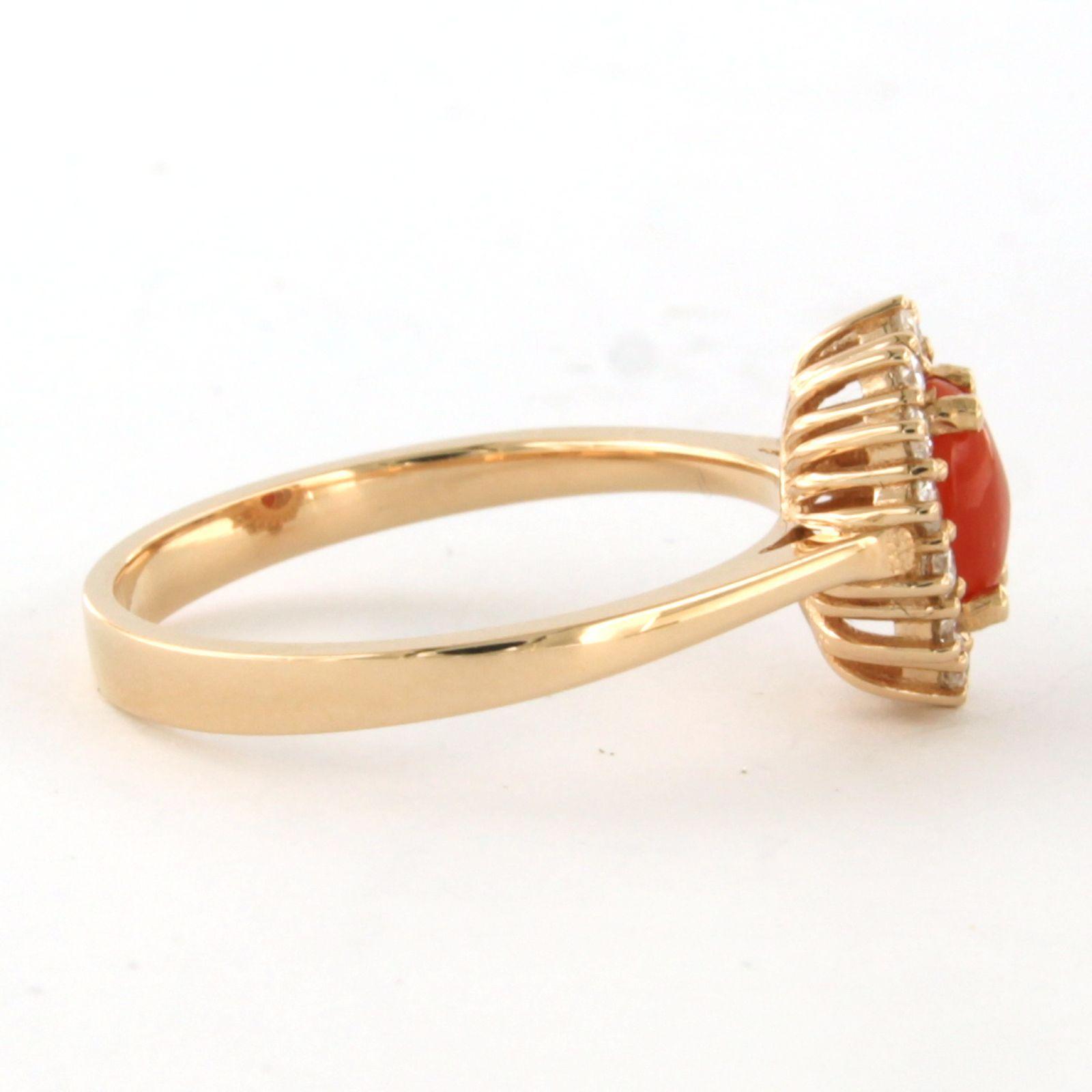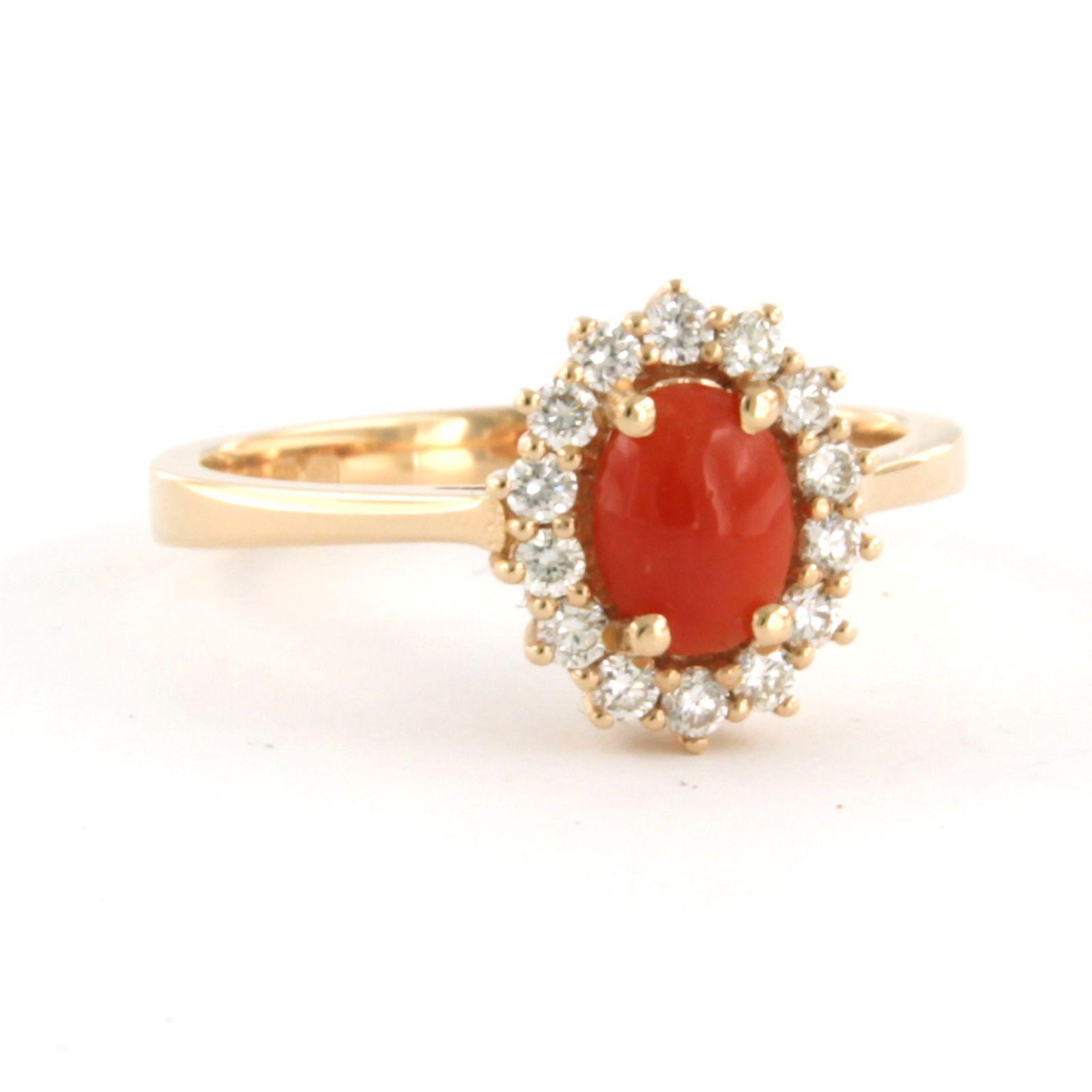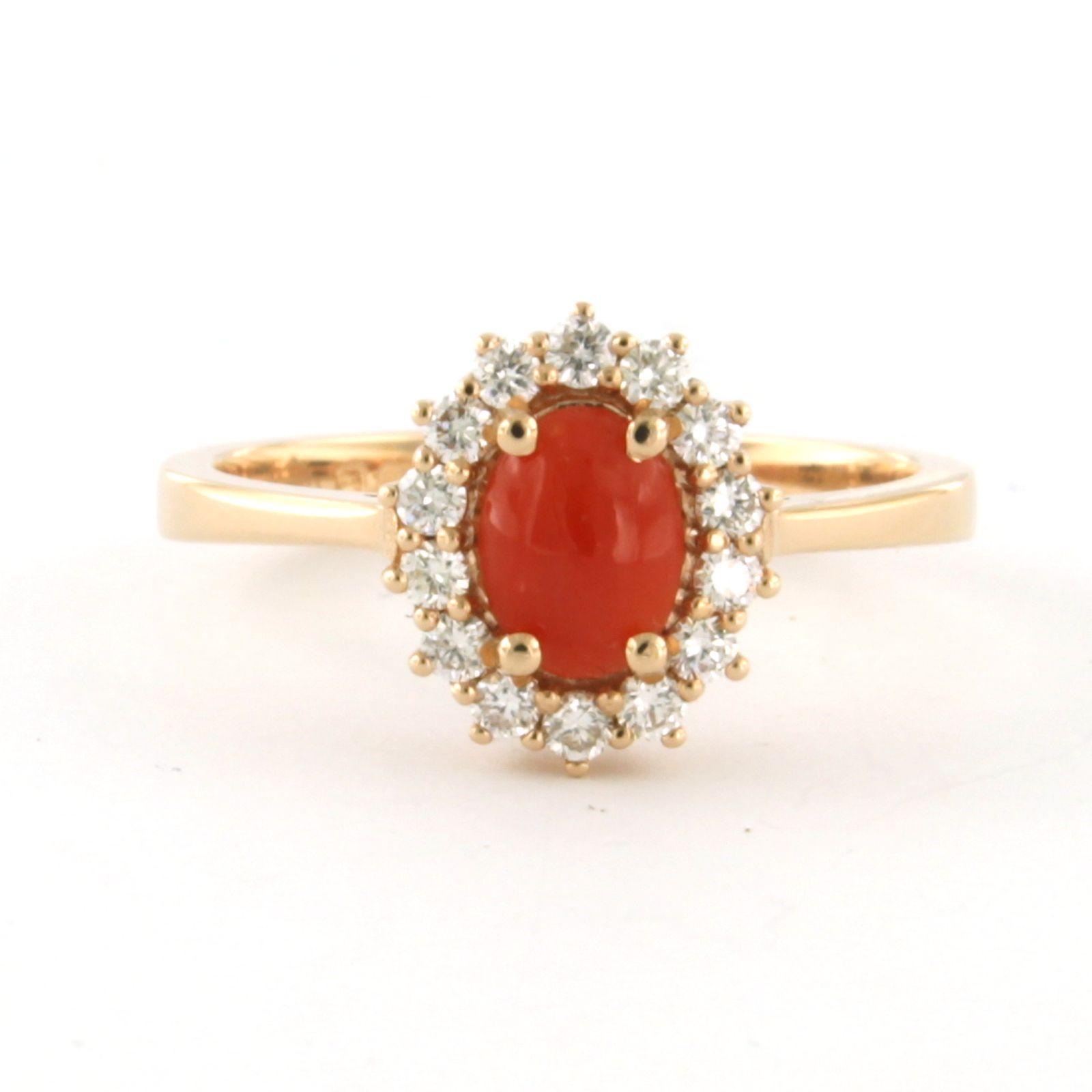 18 Kt. rood gouden ring bezet met koraal en briljant geslepen diamanten tot. 0,26 ct F/G VS/SI - ringmaat 17.25 (54)