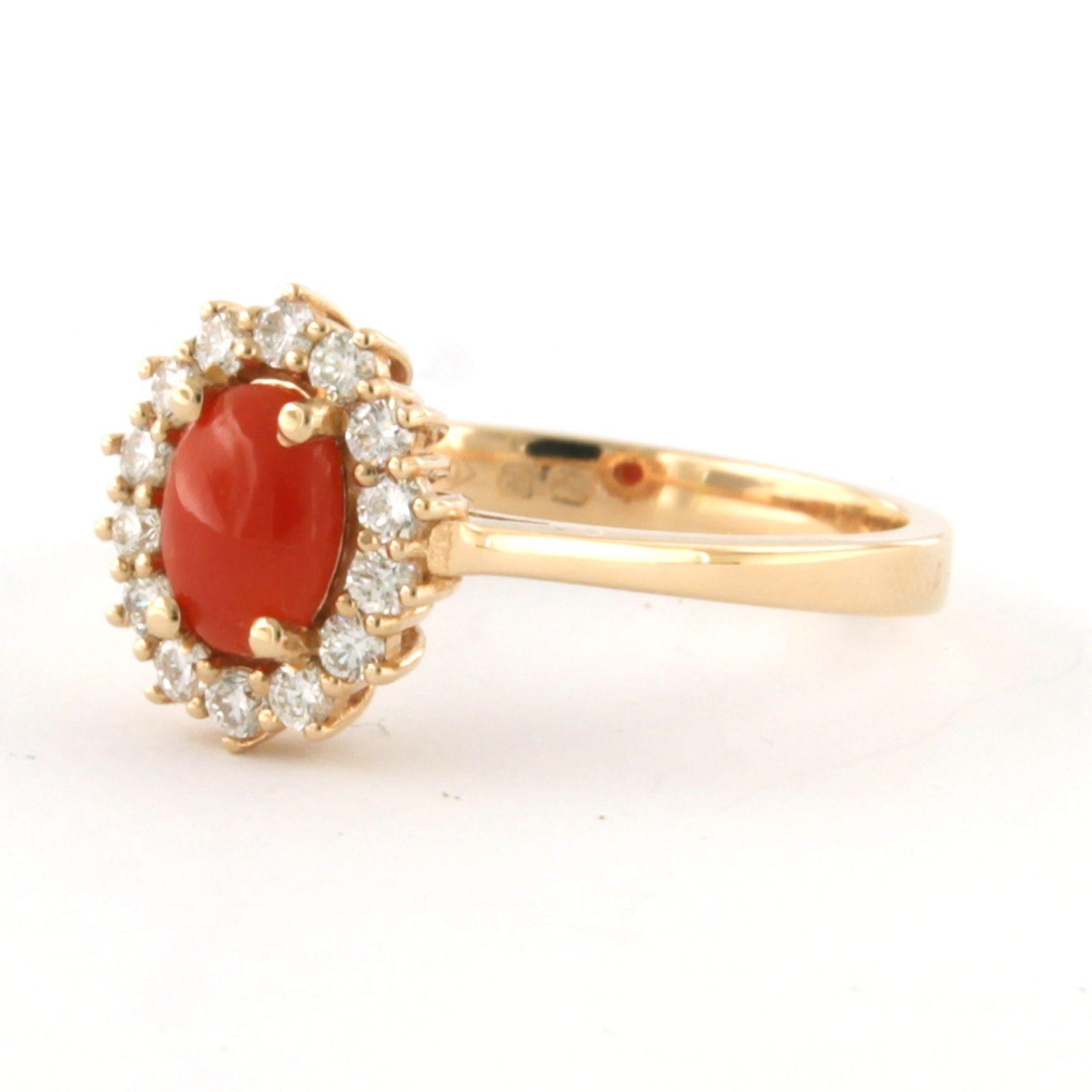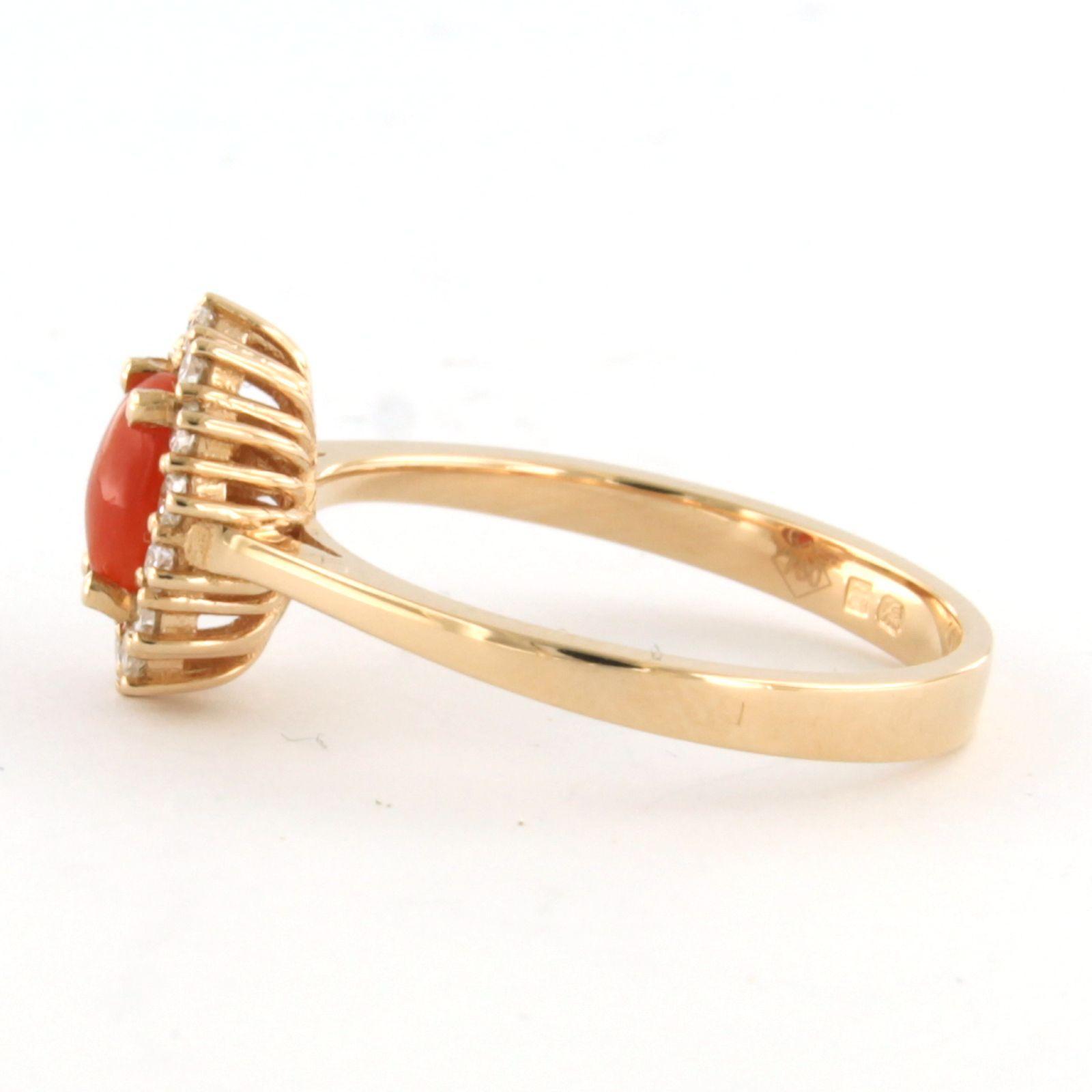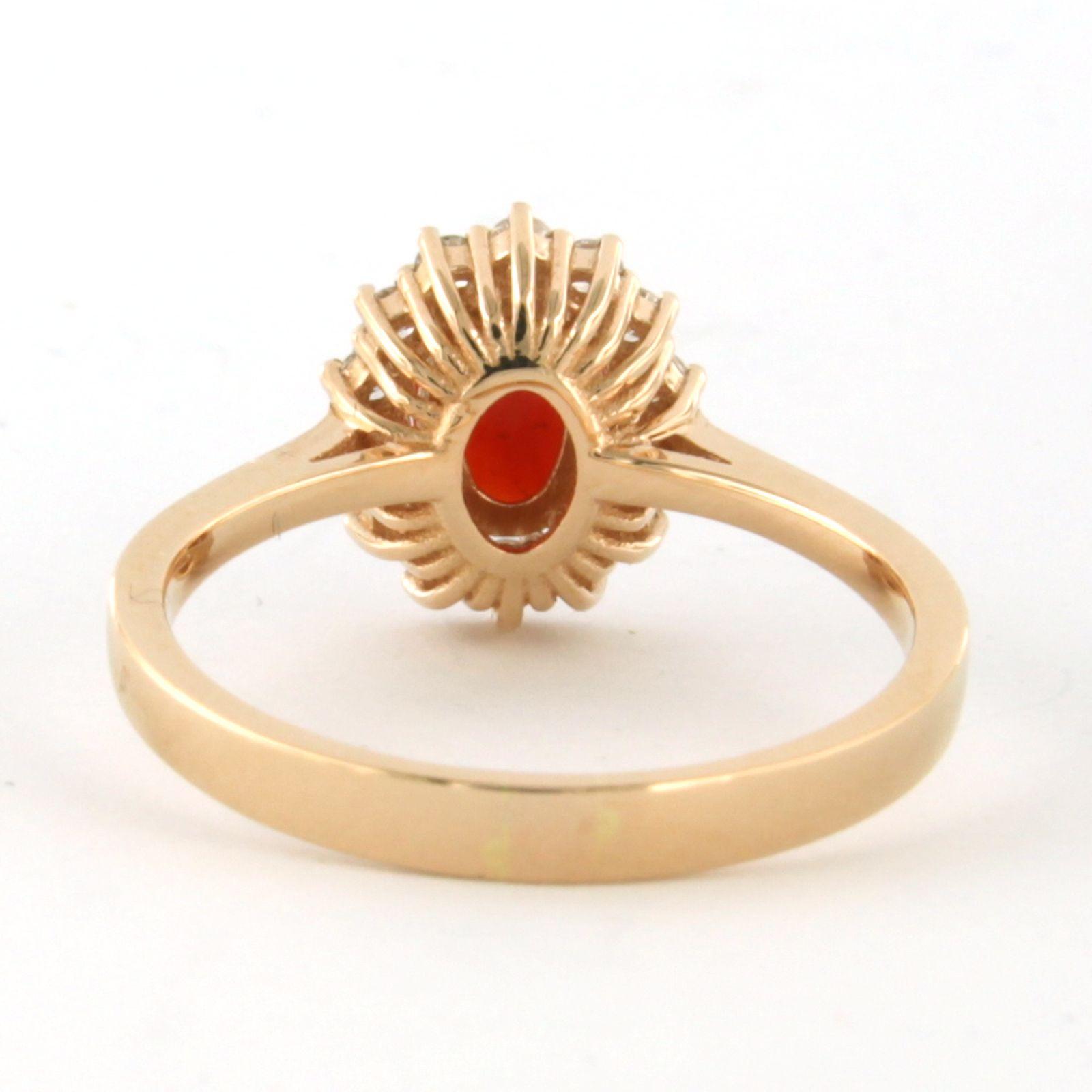 18 Kt. rood gouden ring bezet met koraal en briljant geslepen diamanten tot. 0,26 ct F/G VS/SI - ringmaat 17.25 (54)