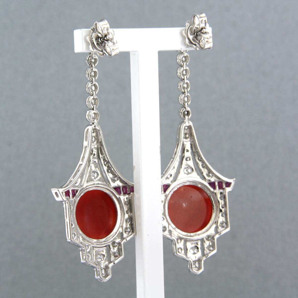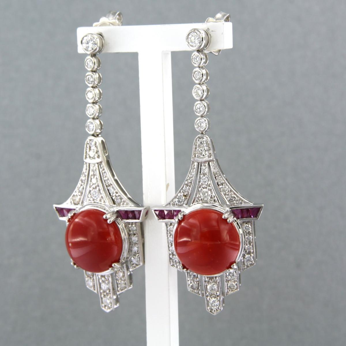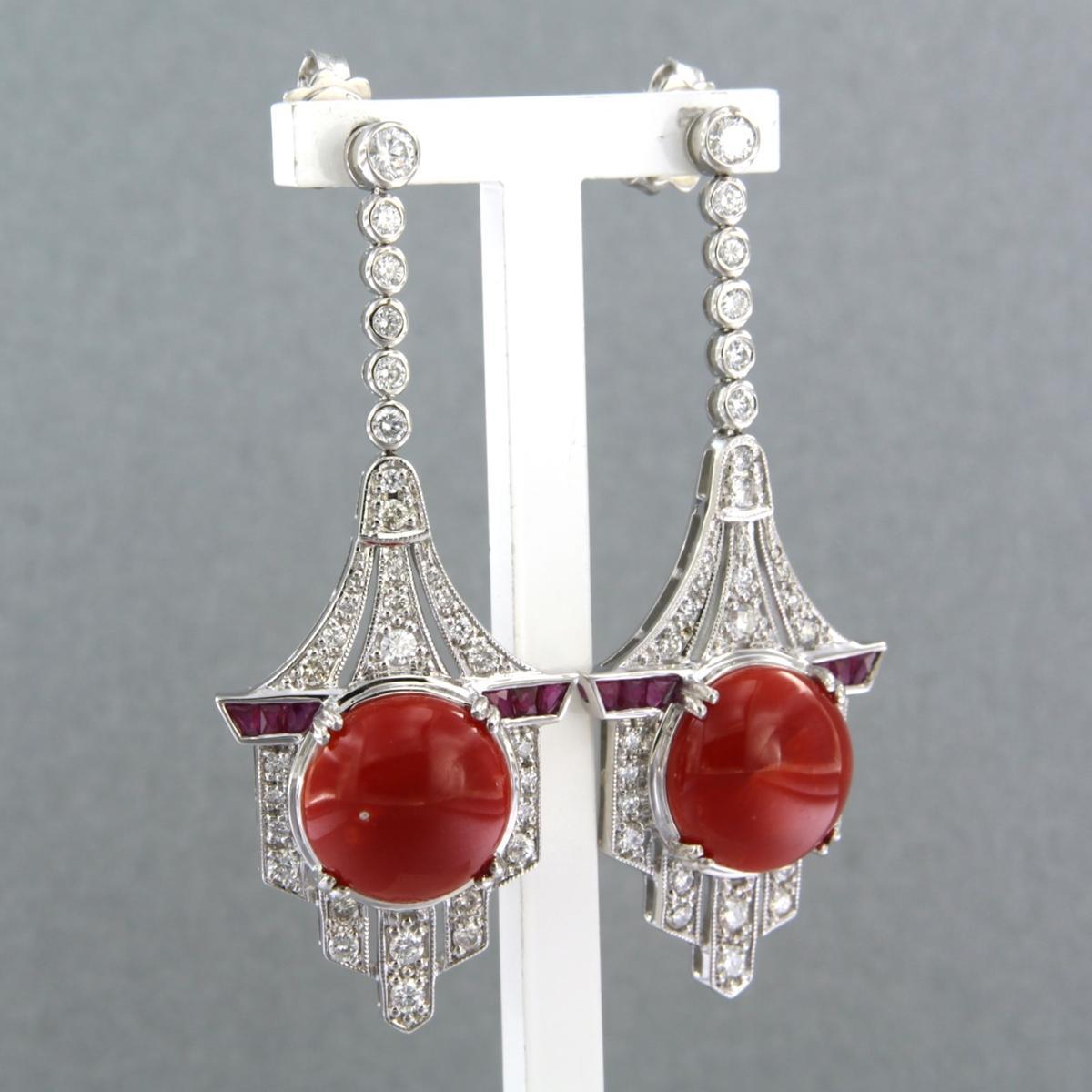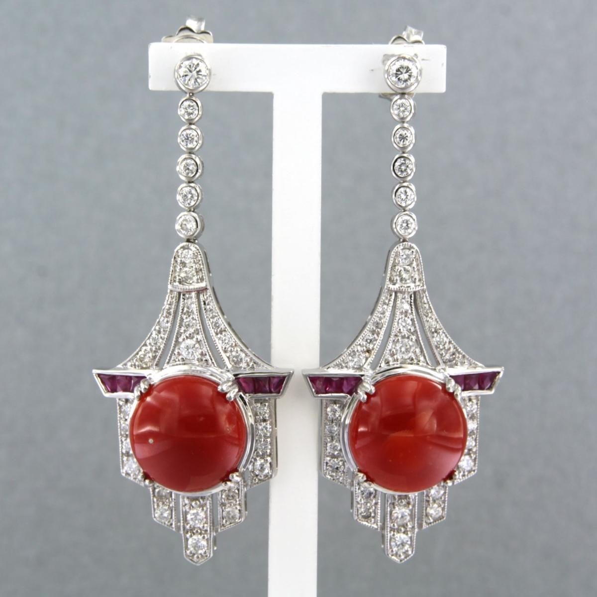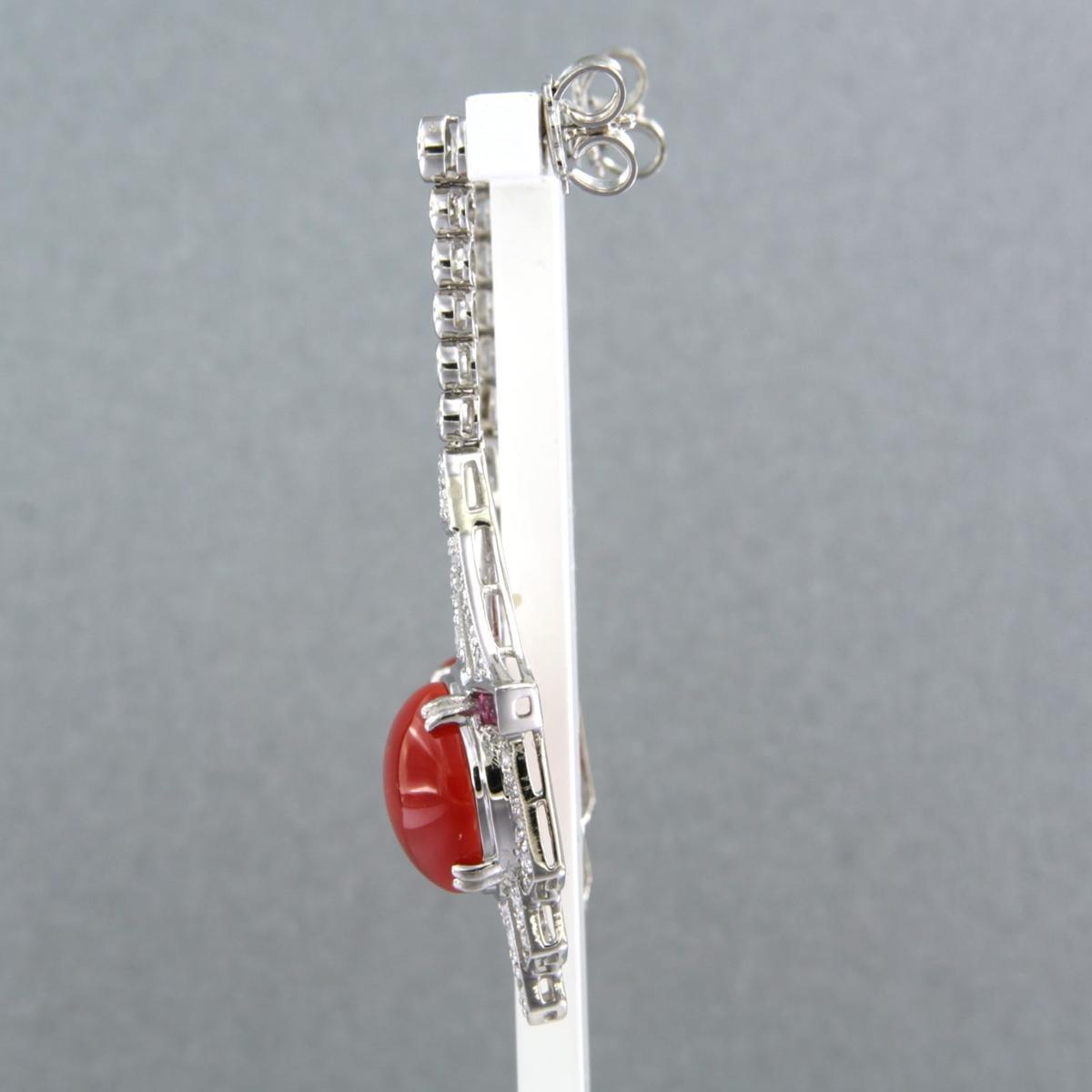 14 Kt. witgouden oorhangers bezet met robijn, koraal en briljant geslepen diamanten tot. 1,26ct - F/G - VS/SI