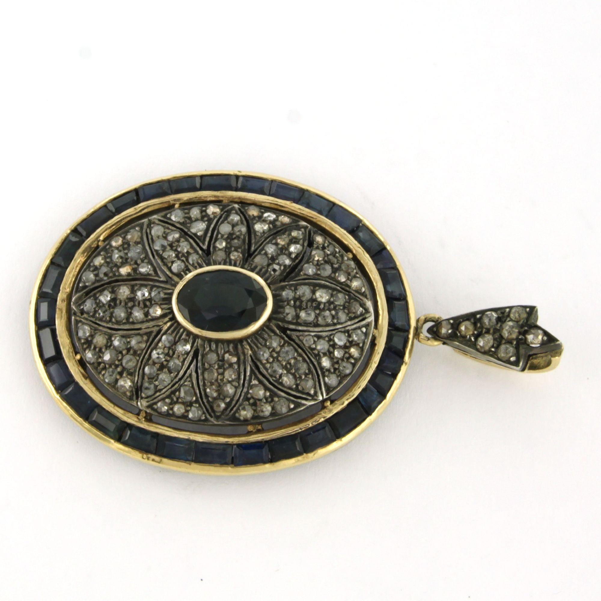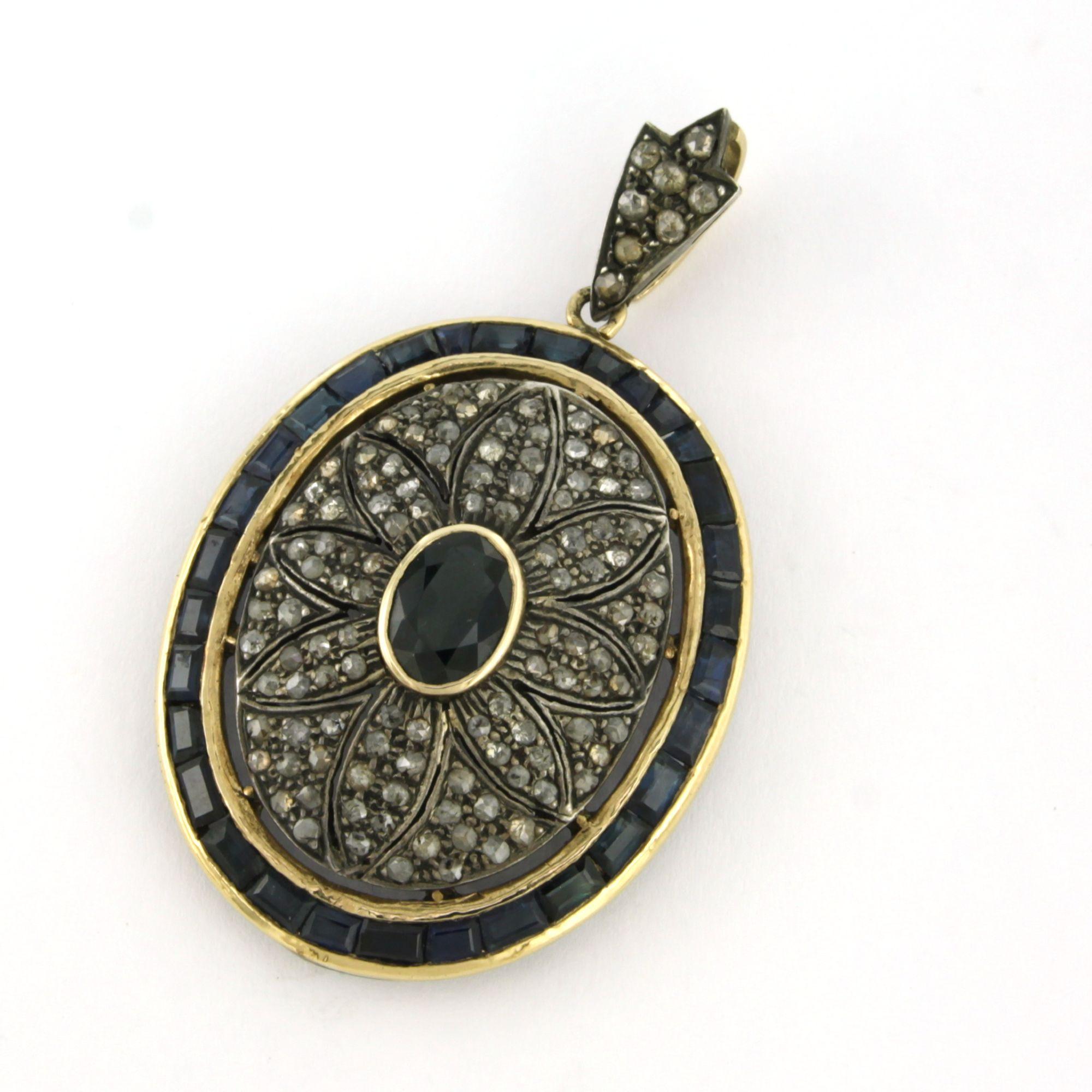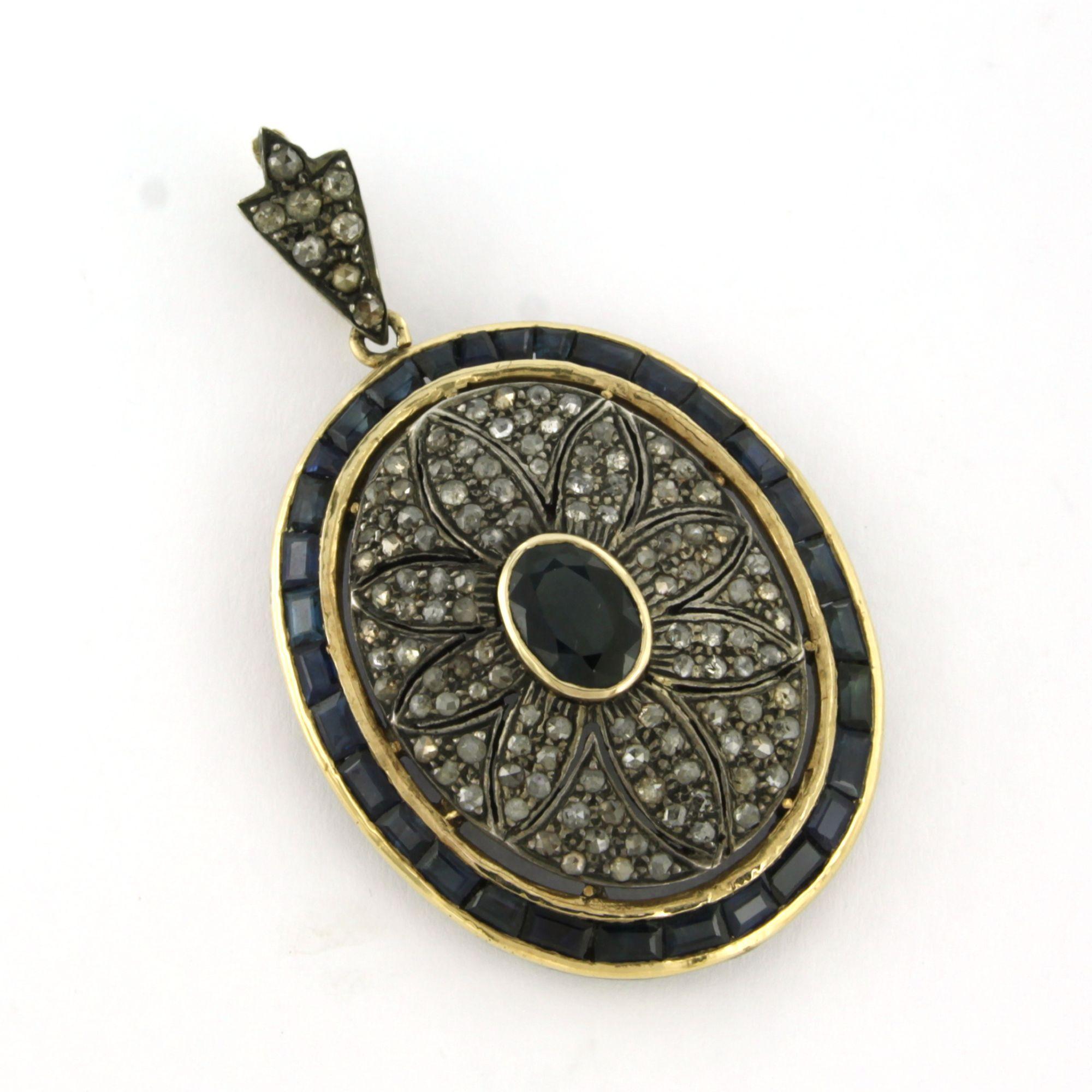 14 Kt. geelgouden met zilveren hanger bezet met saffier en roos diamanten tot. 0.50ct