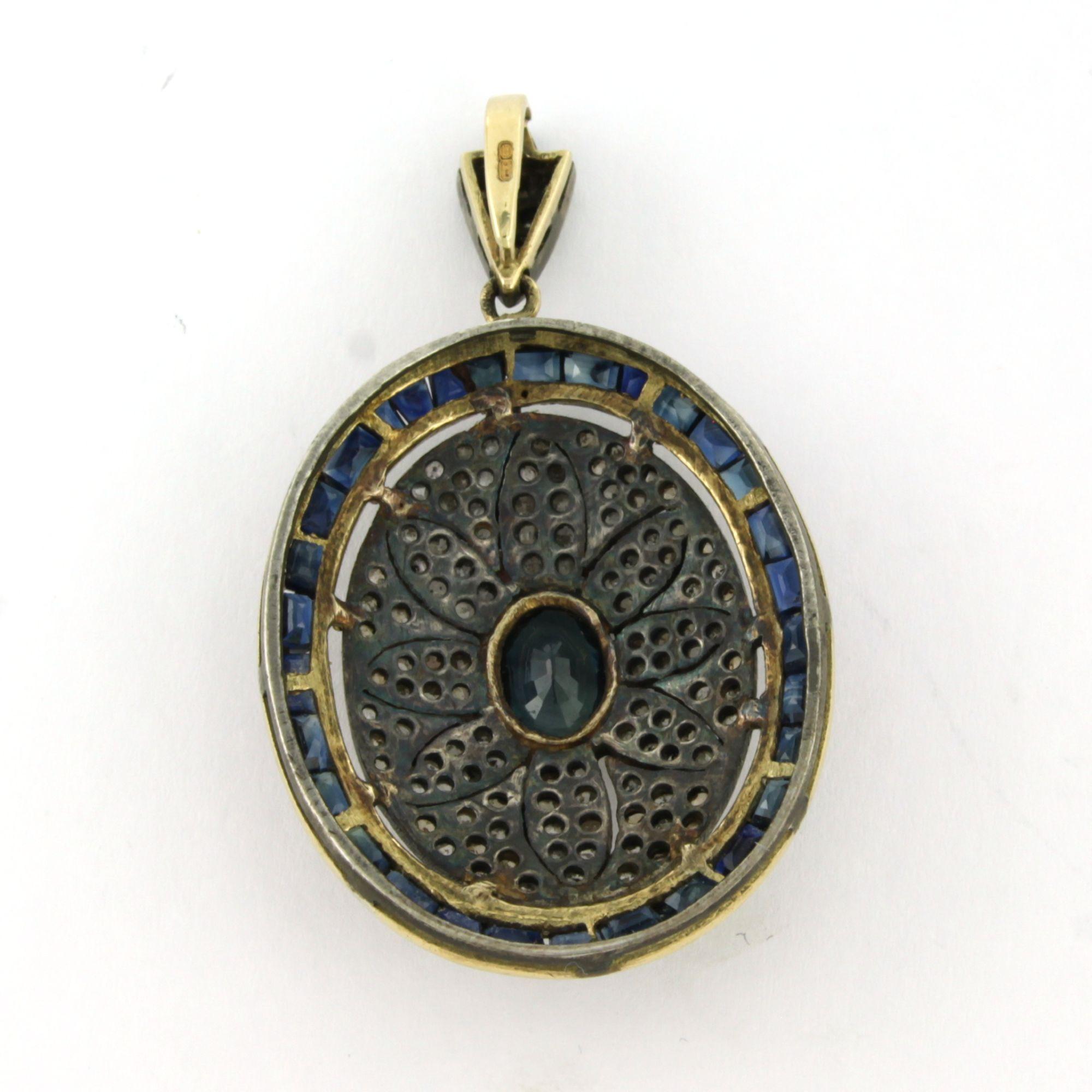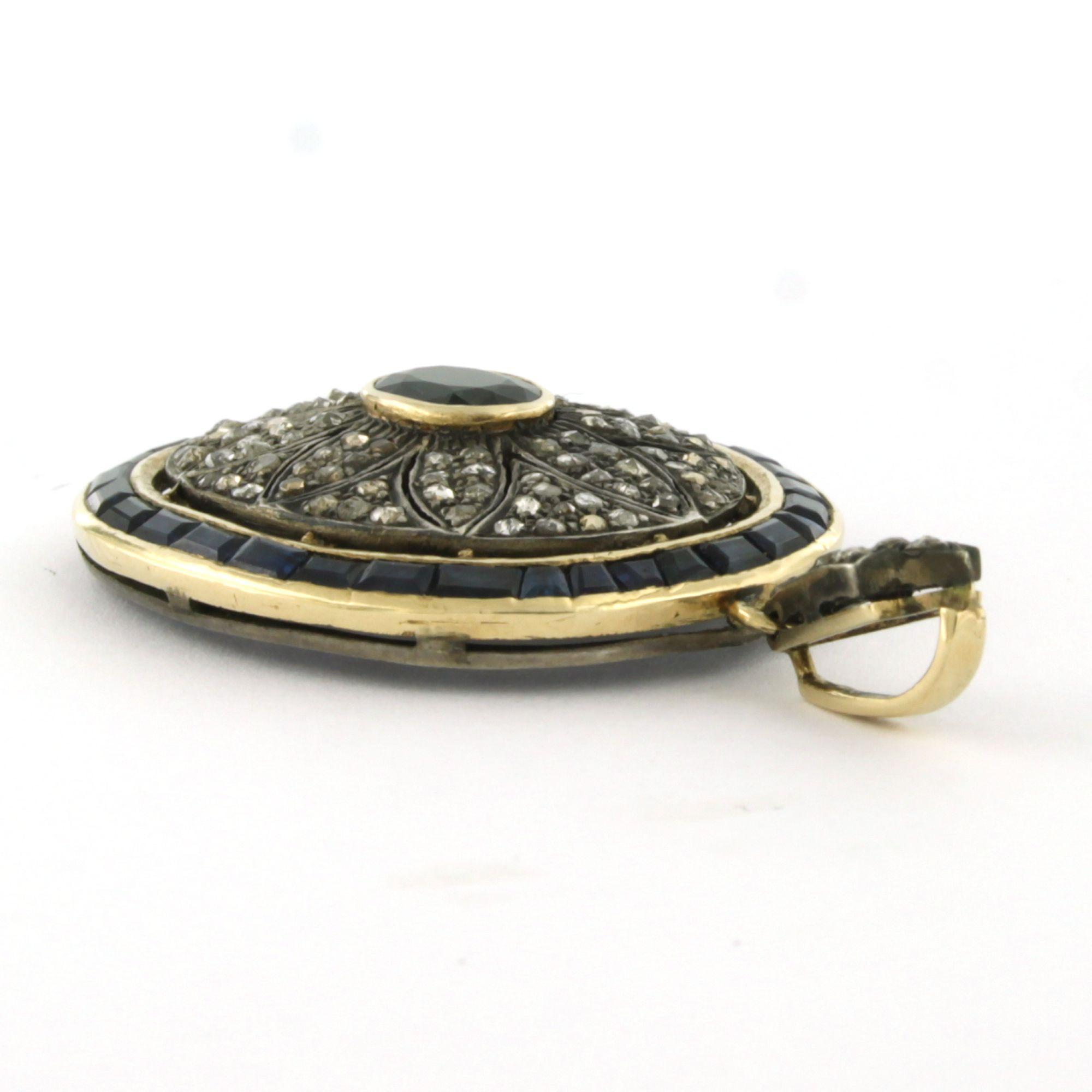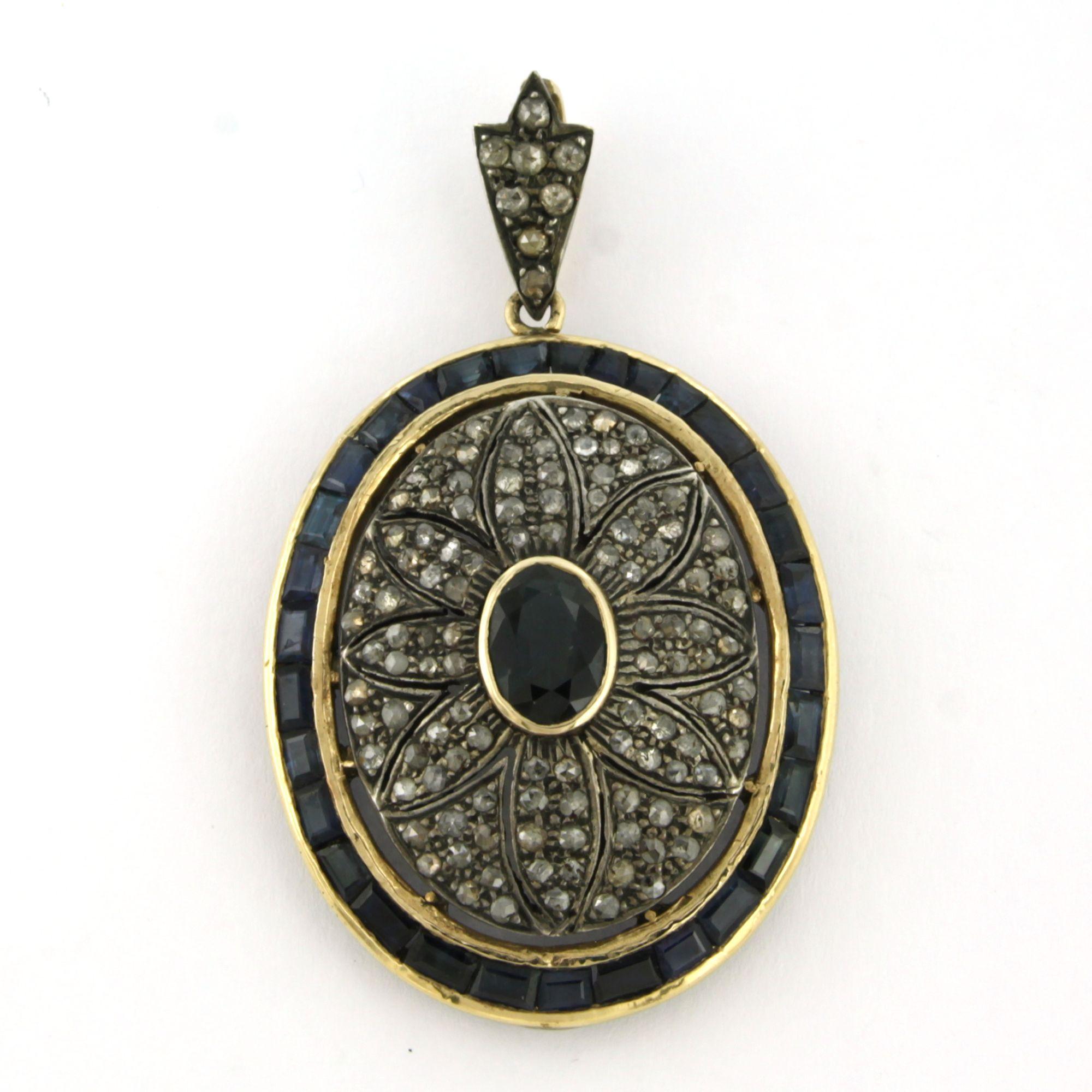 14 Kt. geelgouden met zilveren hanger bezet met saffier en roos diamanten tot. 0.50ct