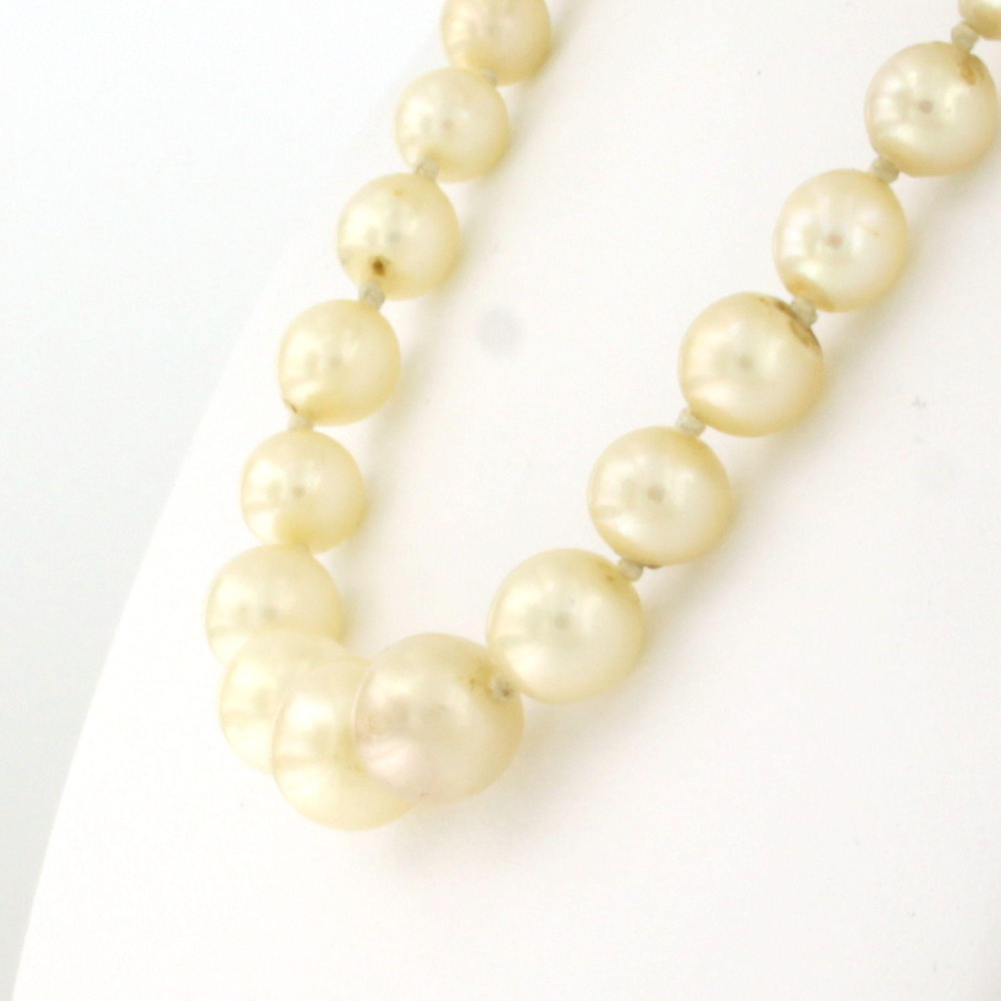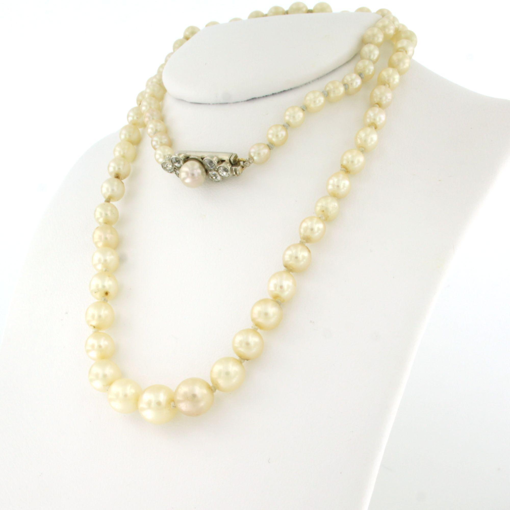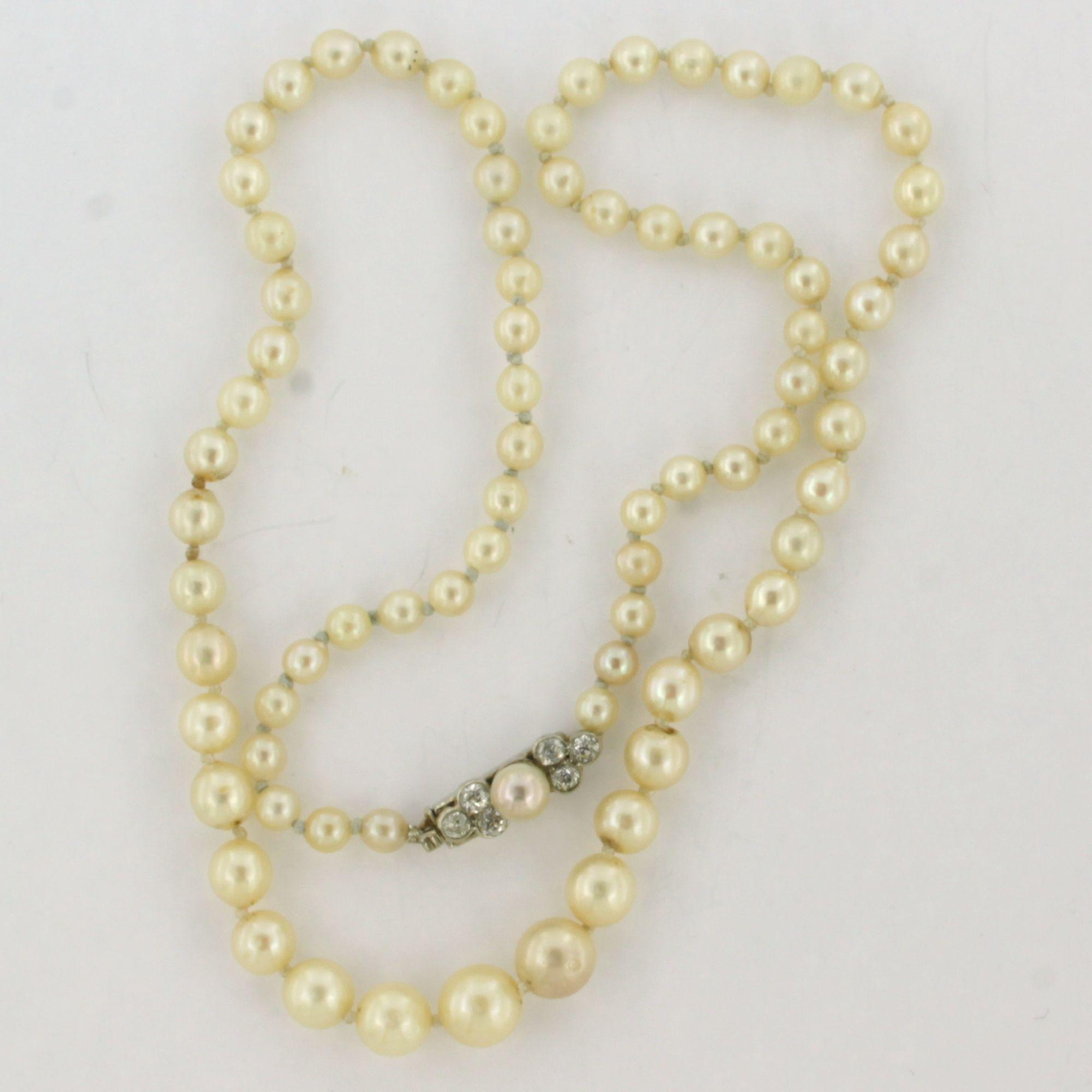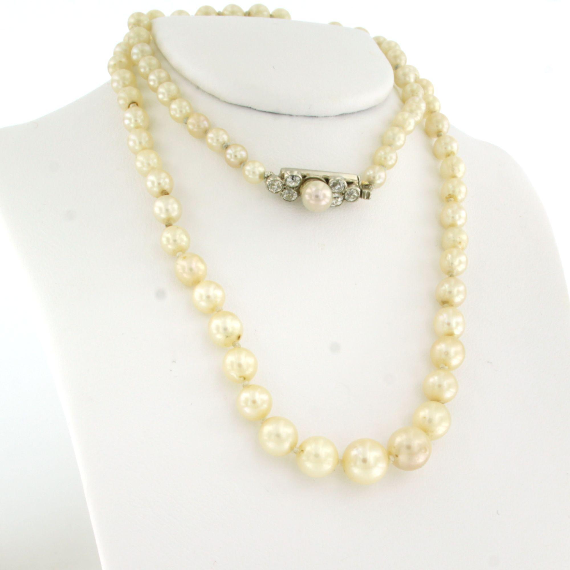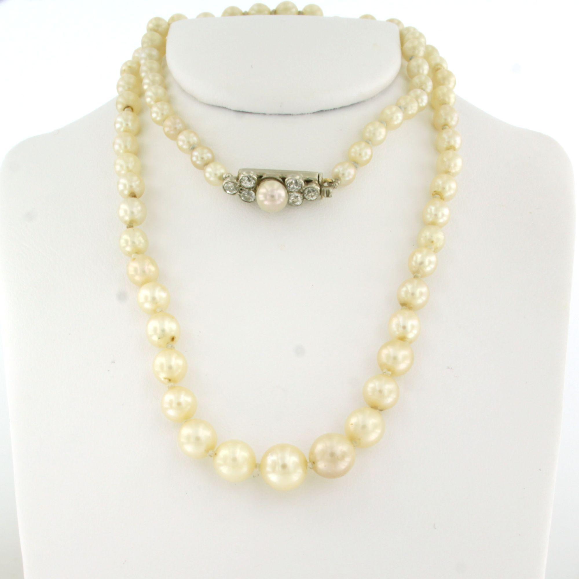 14 Kt. witgouden slot met zilver bezet met parel en Bolsjewiek geslepen diamant tto.0.50ct aan een parel collier, 44 cm lang